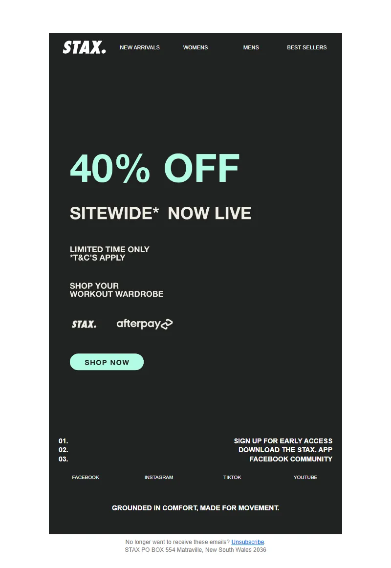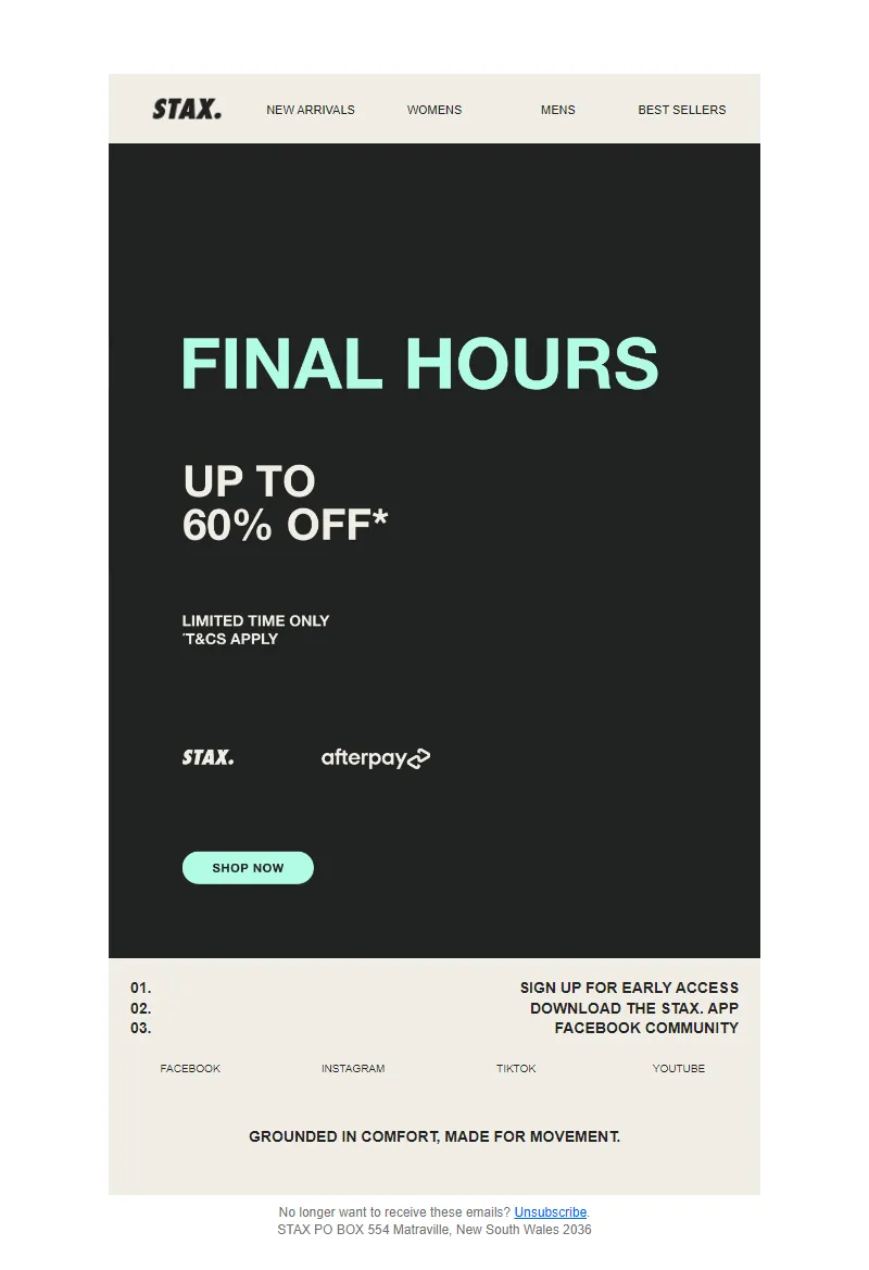 Explore campaign email examples from STAX., including promotions, newsletters, and product announcements. Built as a reference library for studying real ecommerce email execution.