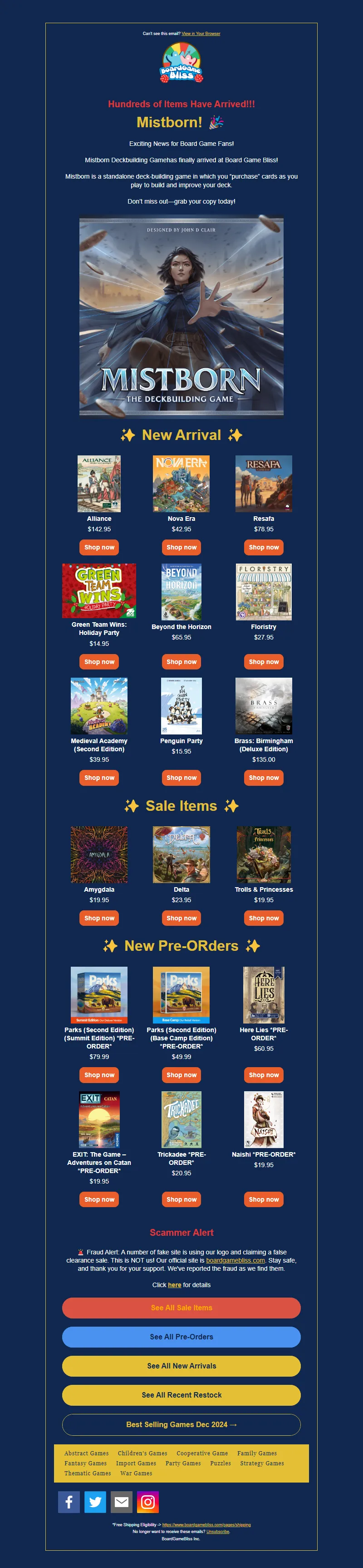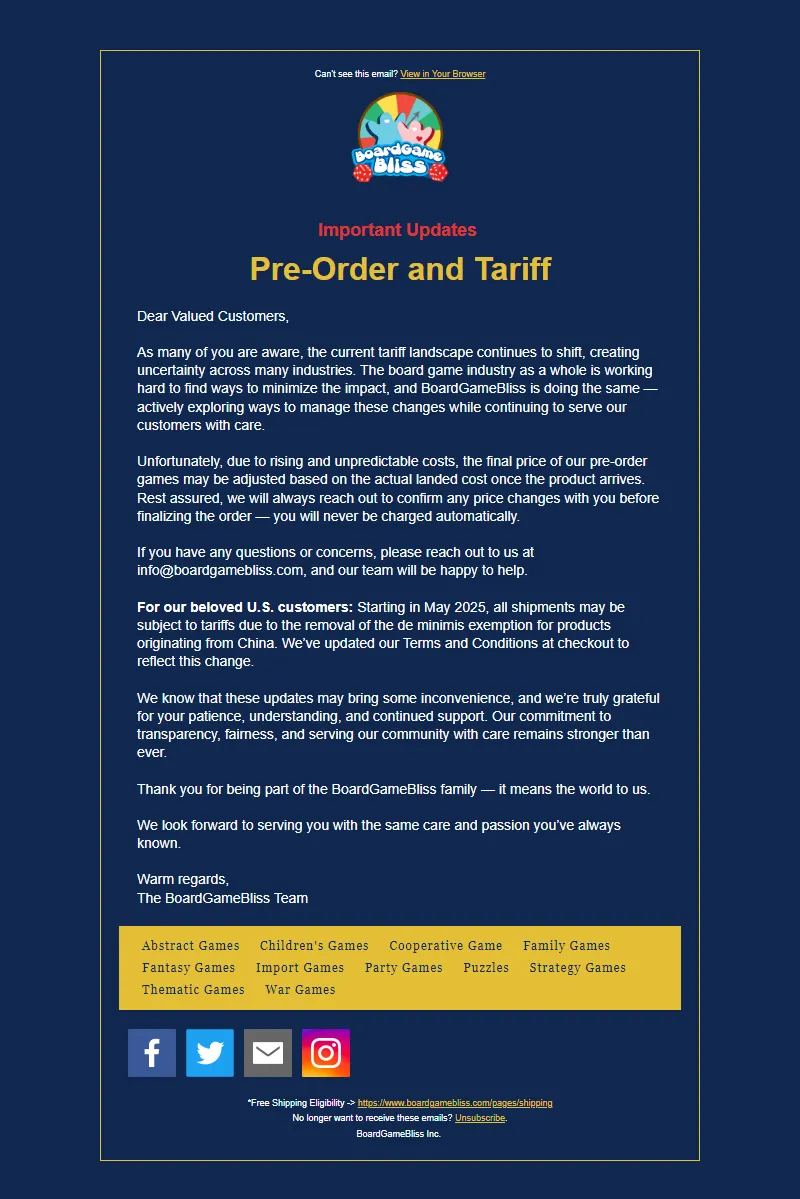 Explore campaign email examples from Board Game Bliss, including promotions, newsletters, and product announcements. Built as a reference library for studying real ecommerce email execution.