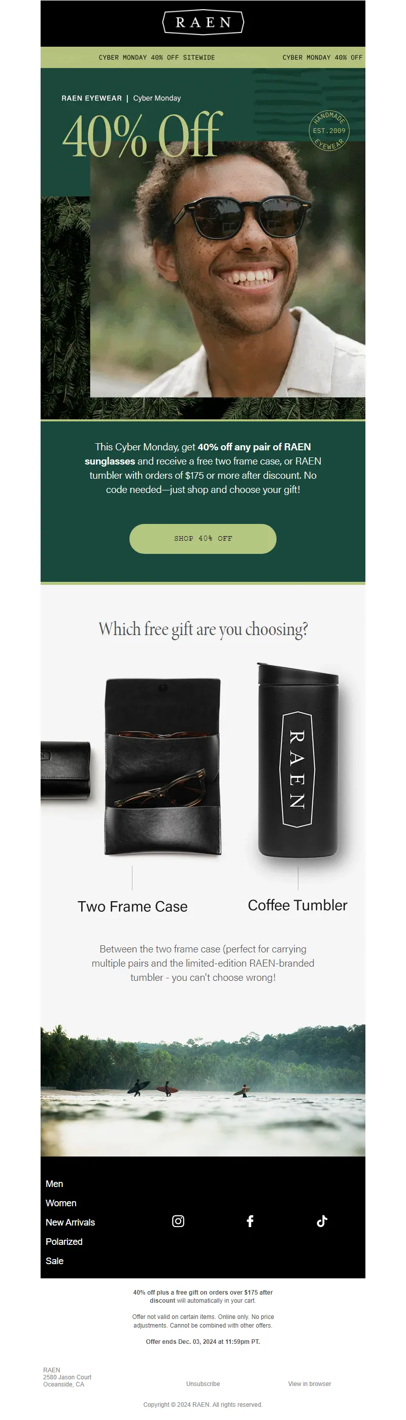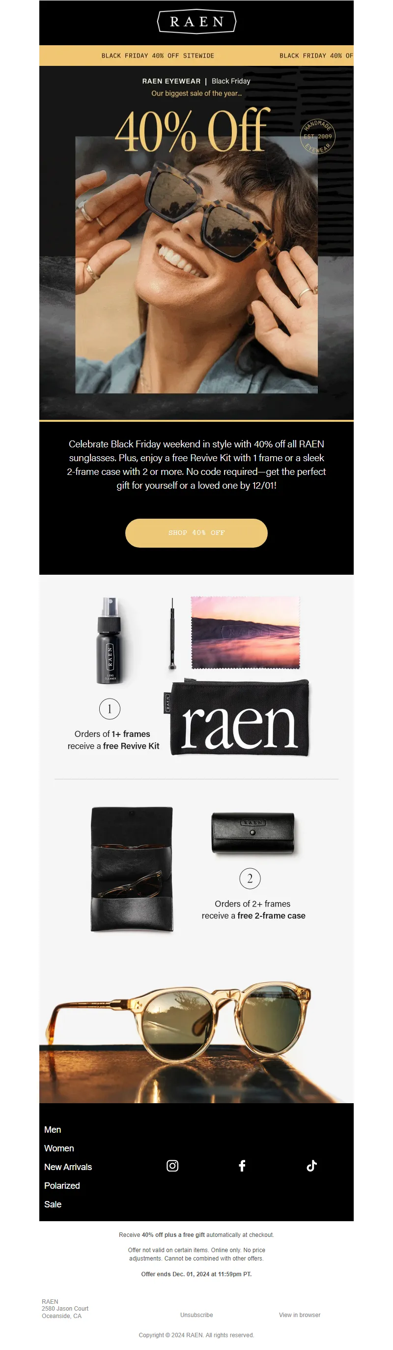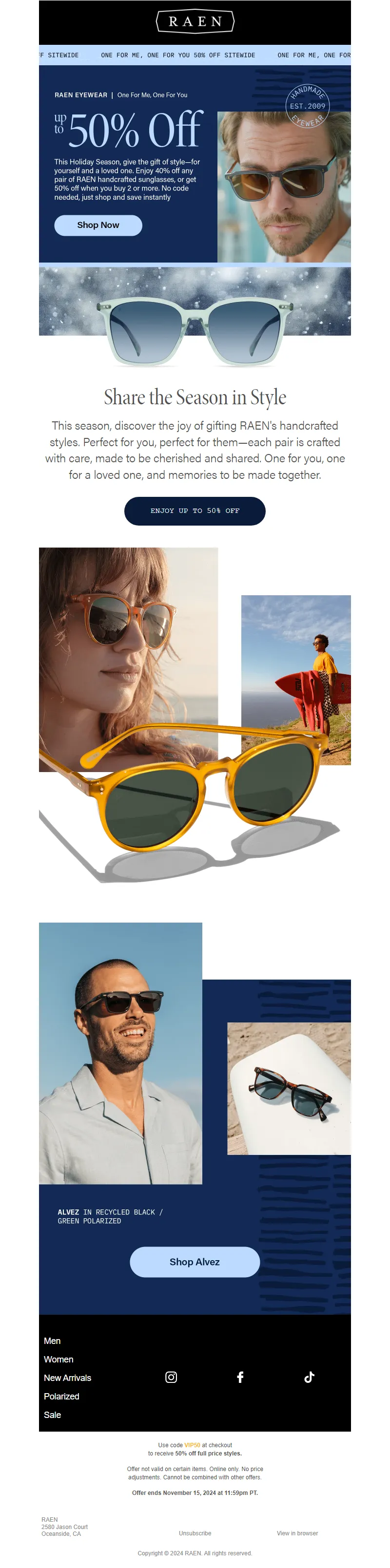 Explore campaign email examples from RAEN, including promotions, newsletters, and product announcements. Built as a reference library for studying real ecommerce email execution.