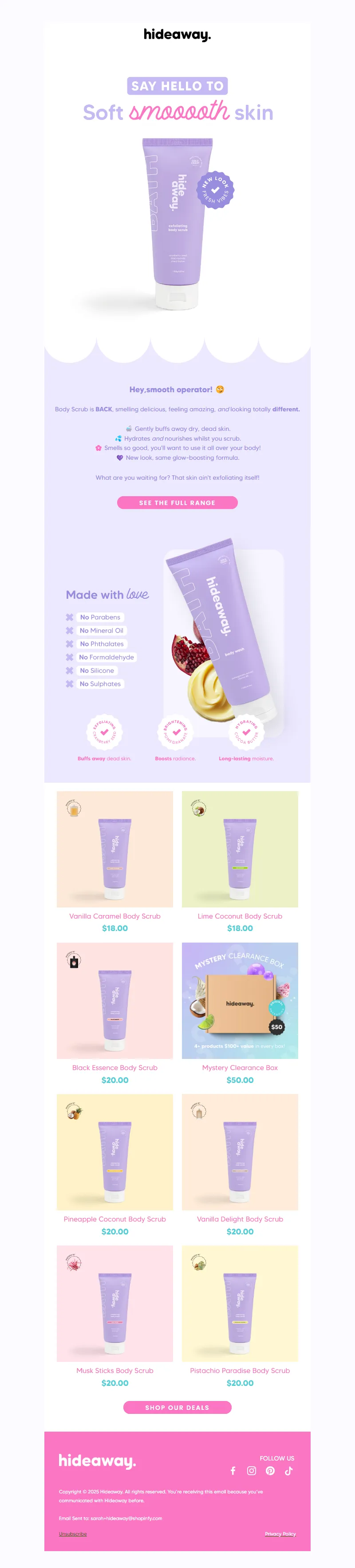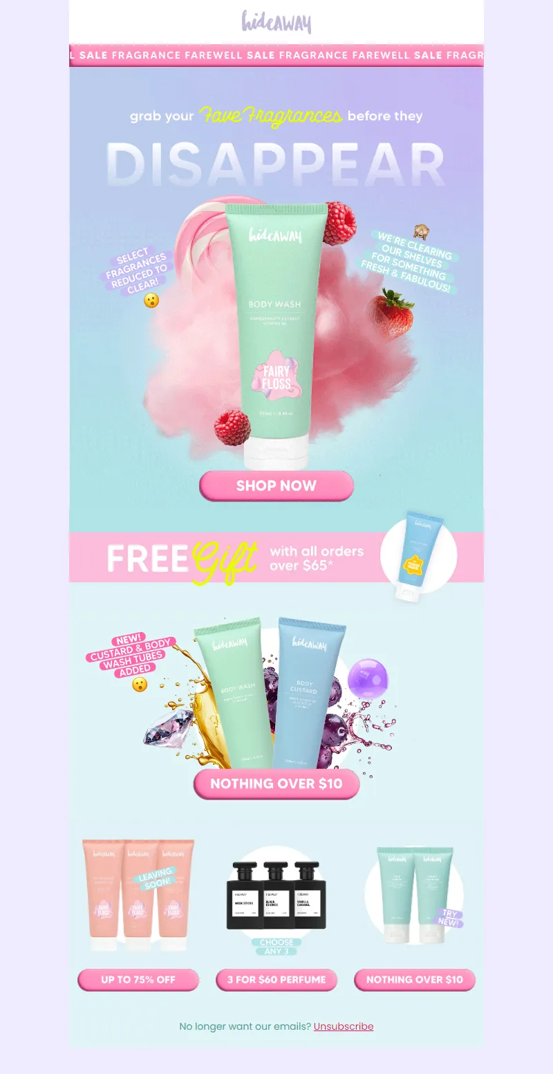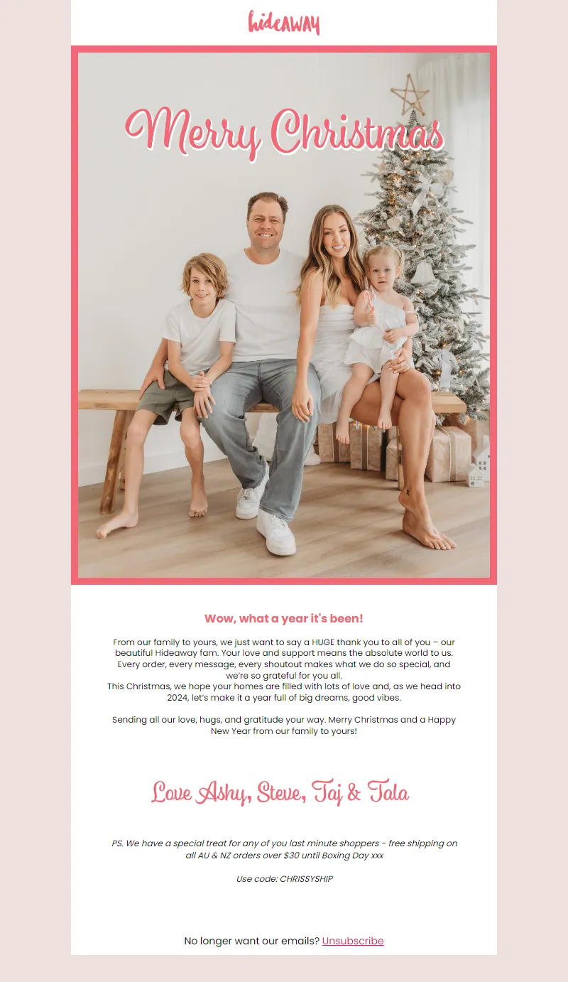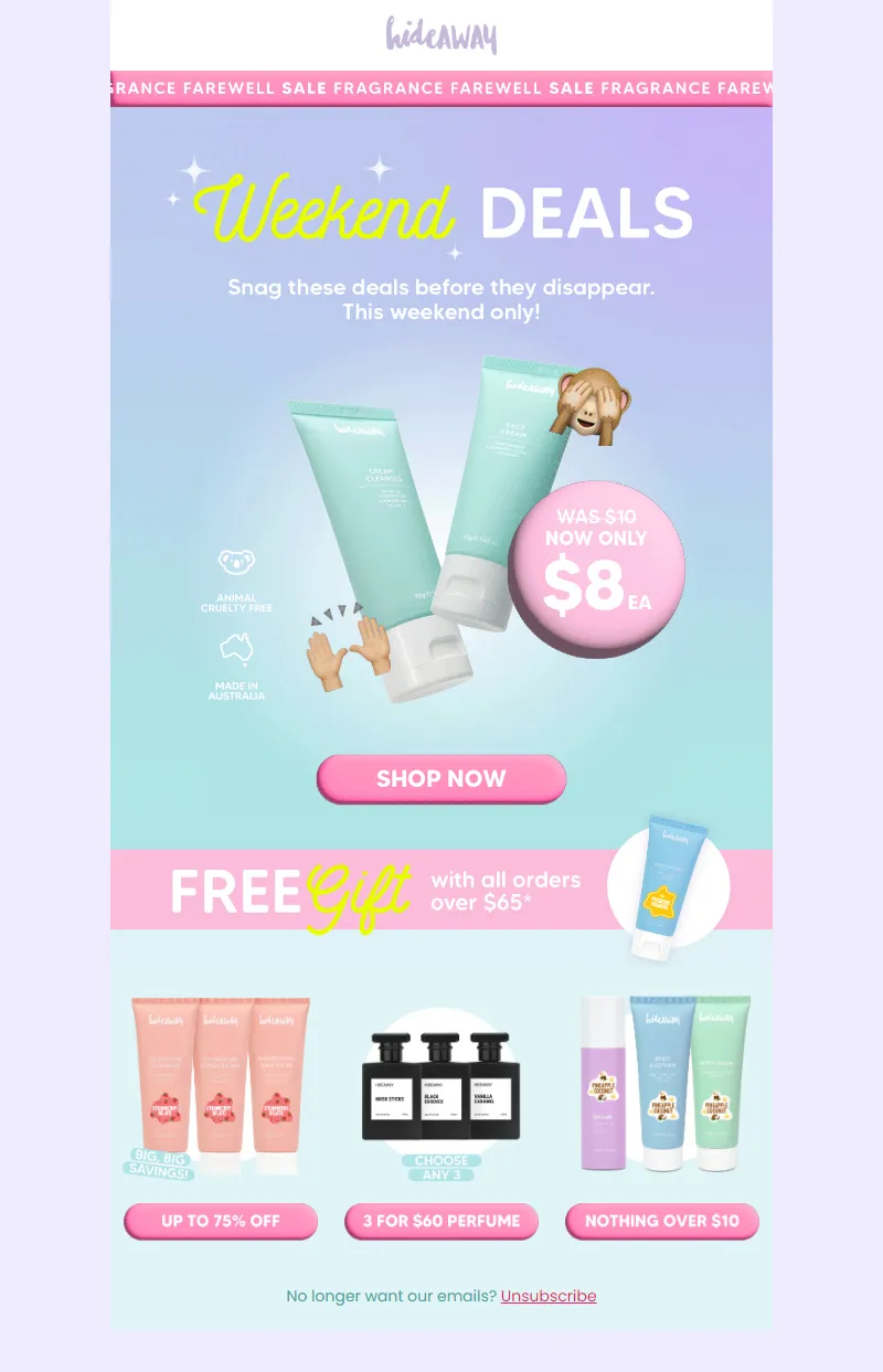 Explore campaign email examples from hideAWAY, including promotions, newsletters, and product announcements. Built as a reference library for studying real ecommerce email execution.
