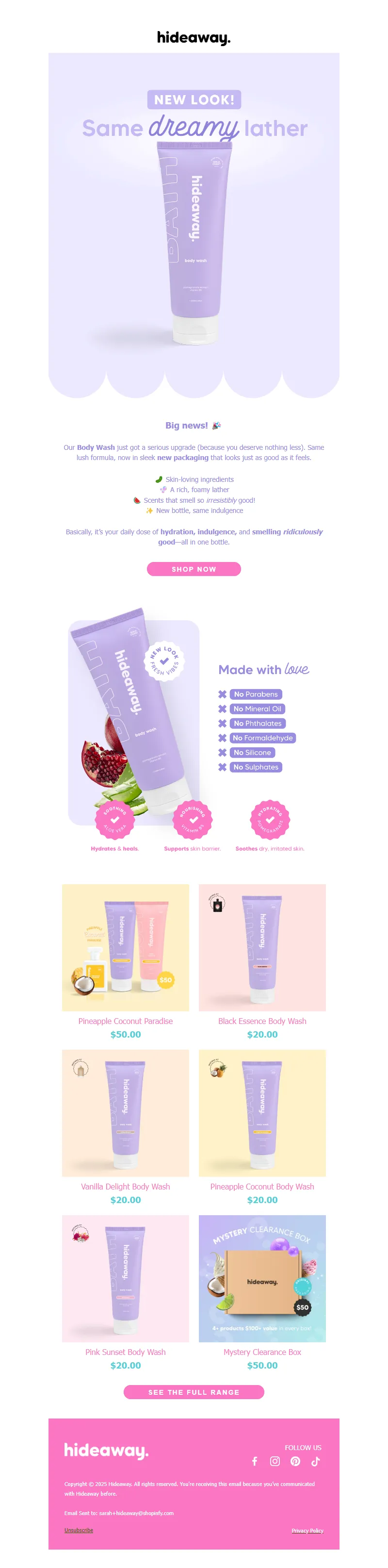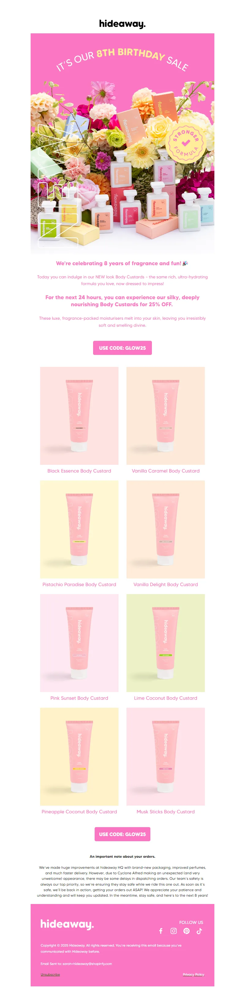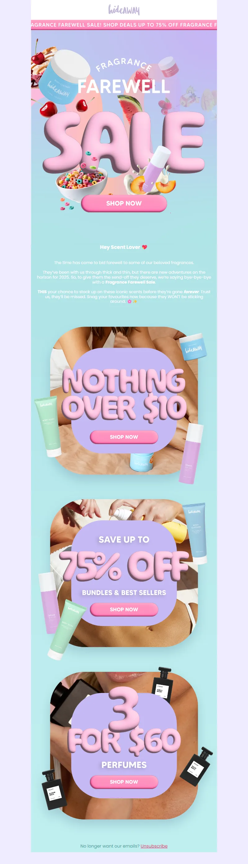 Explore campaign email examples from hideAWAY, including promotions, newsletters, and product announcements. Built as a reference library for studying real ecommerce email execution.