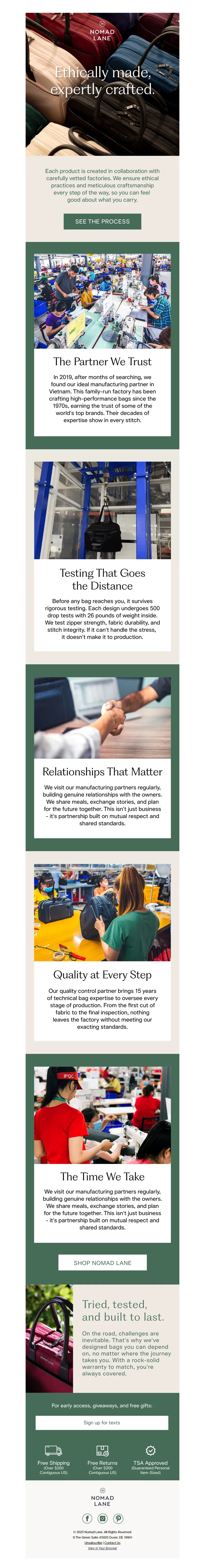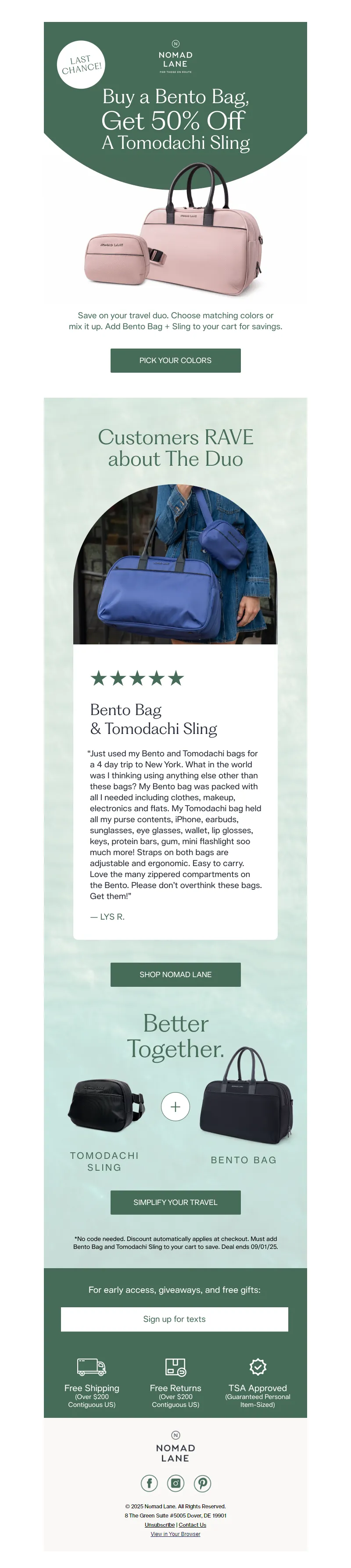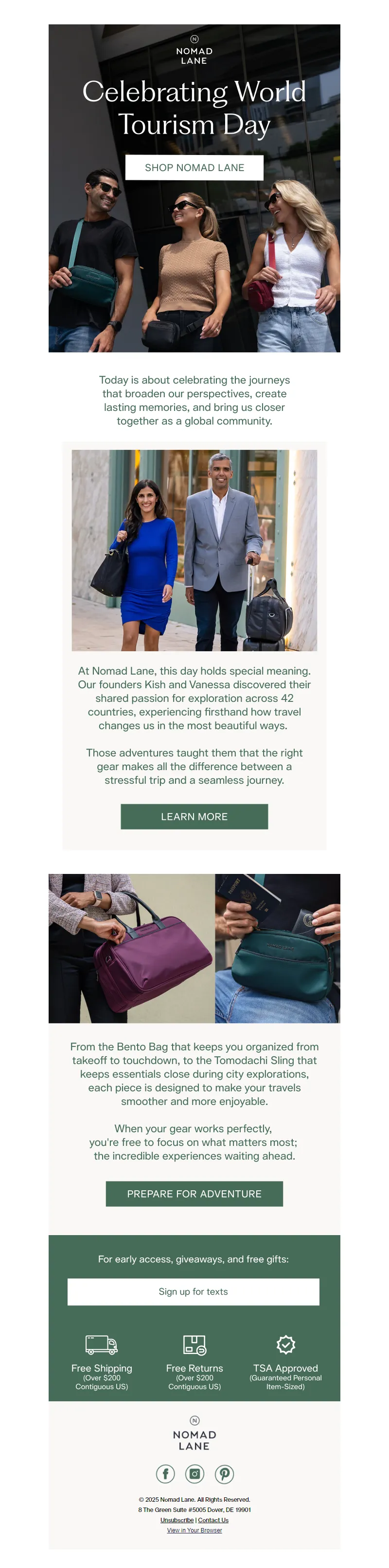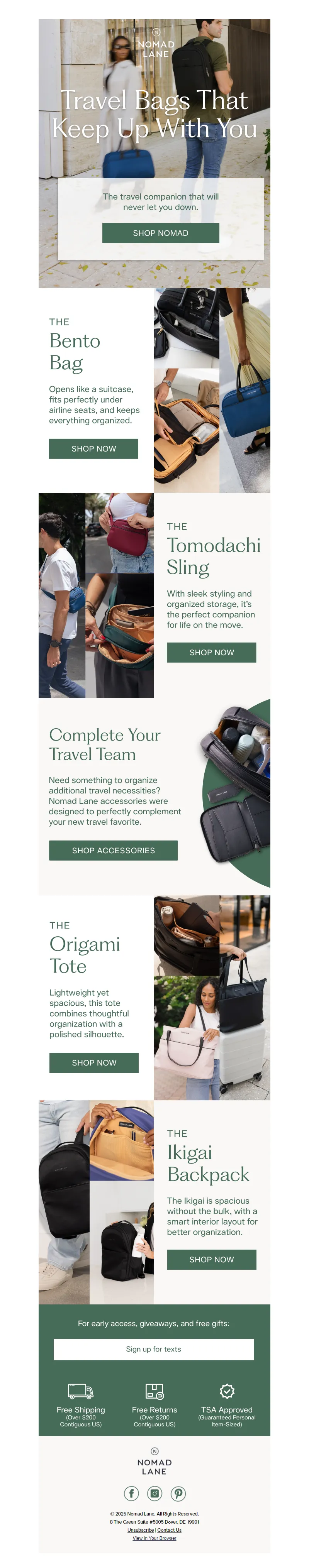 Explore campaign email examples from Nomad Lane, including promotions, newsletters, and product announcements. Built as a reference library for studying real ecommerce email execution.