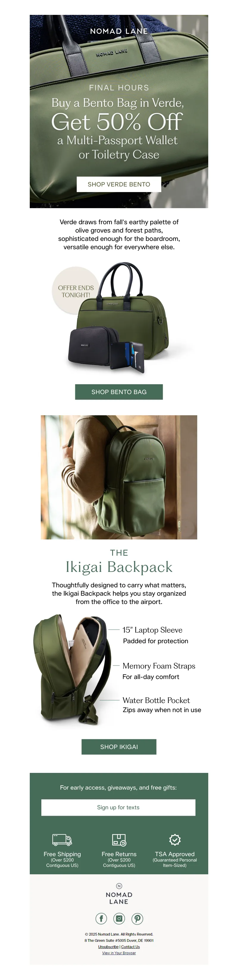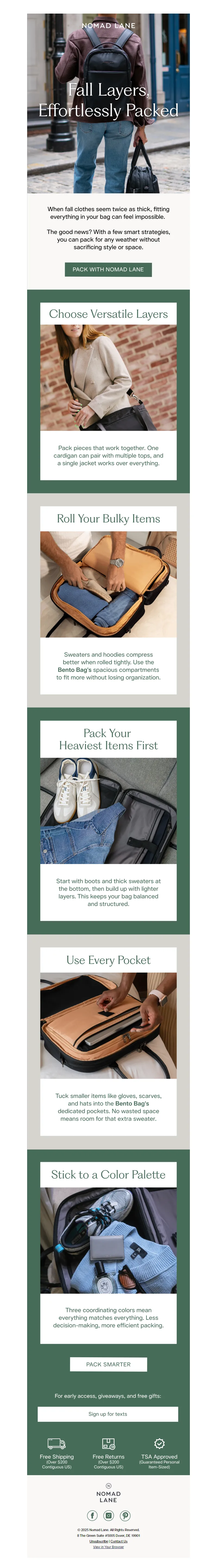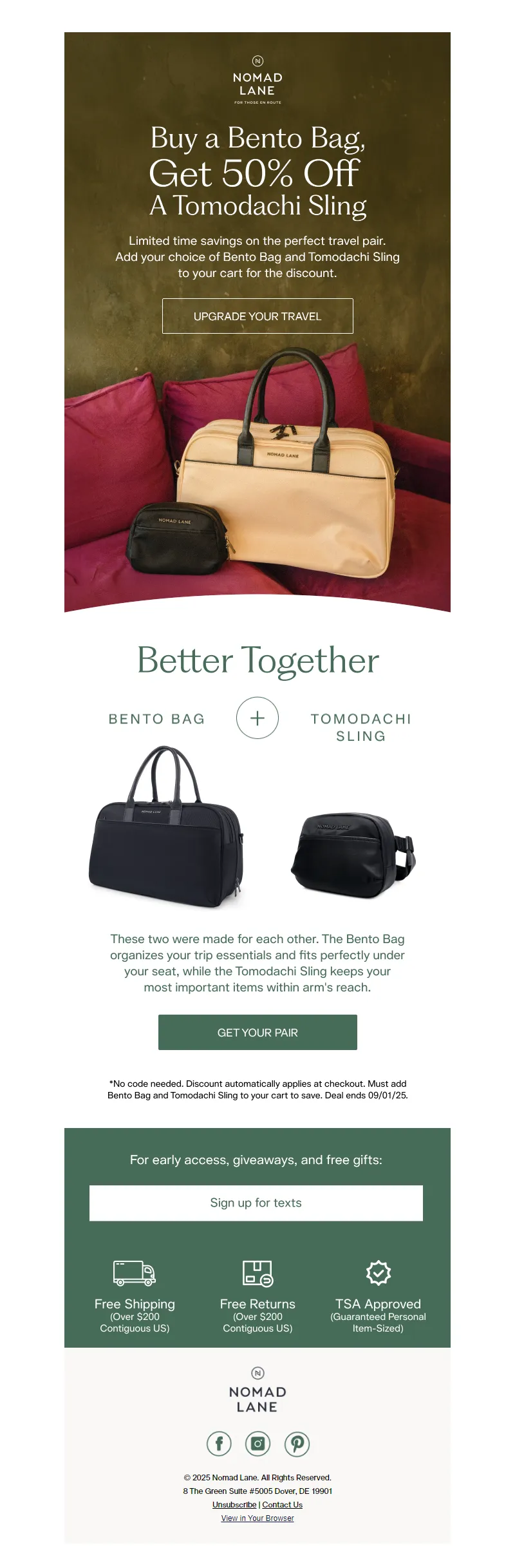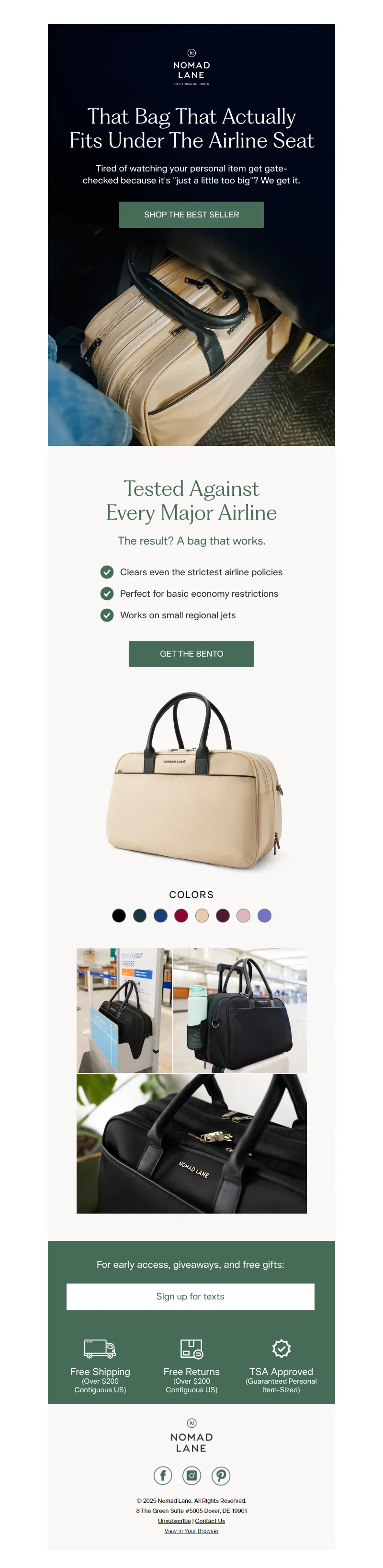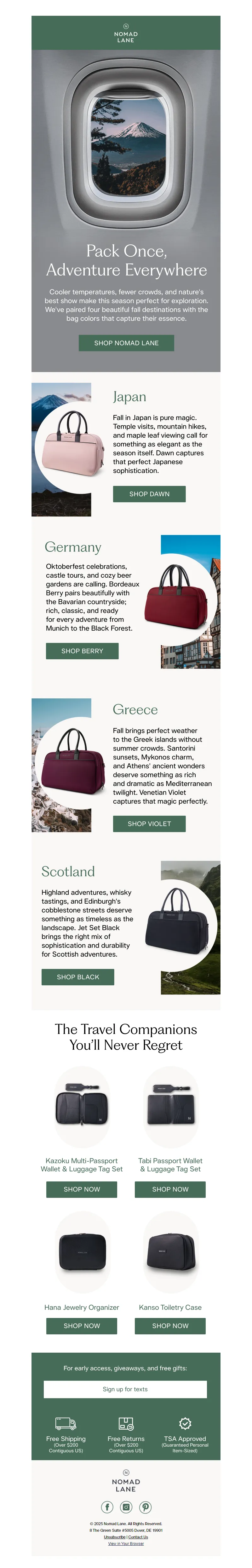 Explore campaign email examples from Nomad Lane, including promotions, newsletters, and product announcements. Built as a reference library for studying real ecommerce email execution.