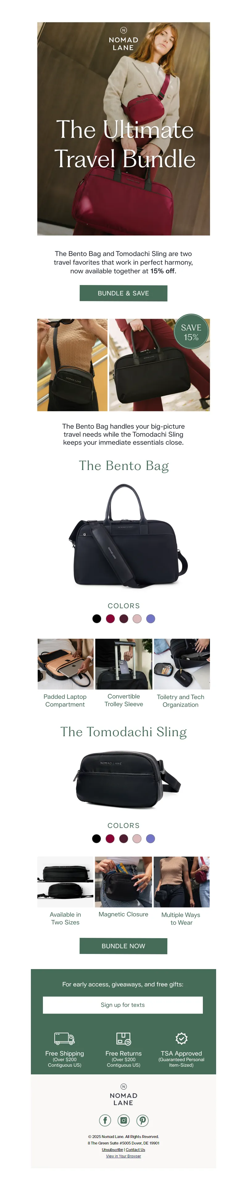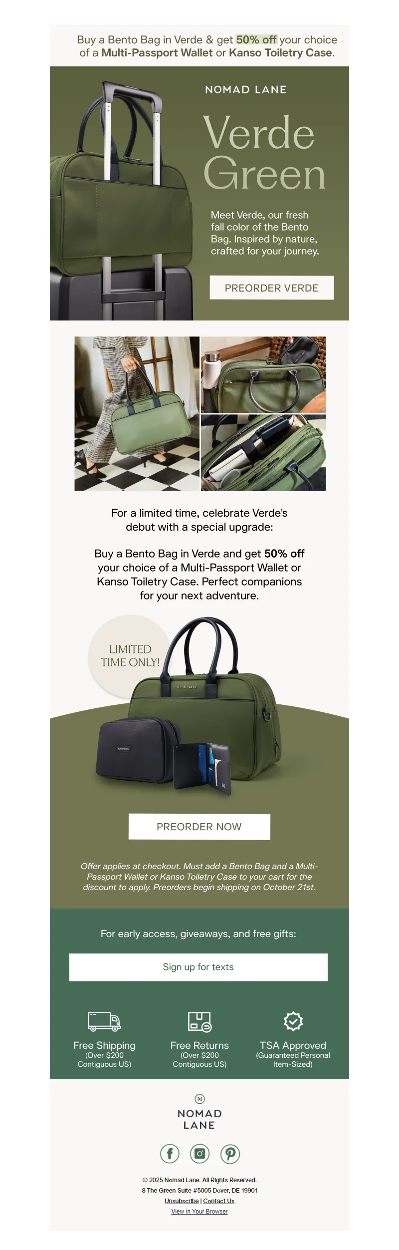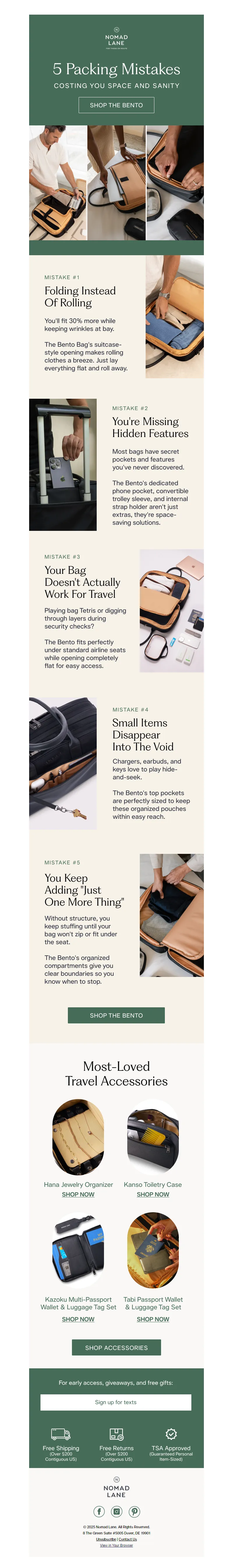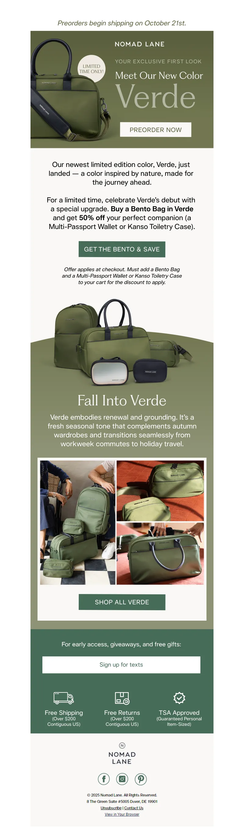 Explore campaign email examples from Nomad Lane, including promotions, newsletters, and product announcements. Built as a reference library for studying real ecommerce email execution.