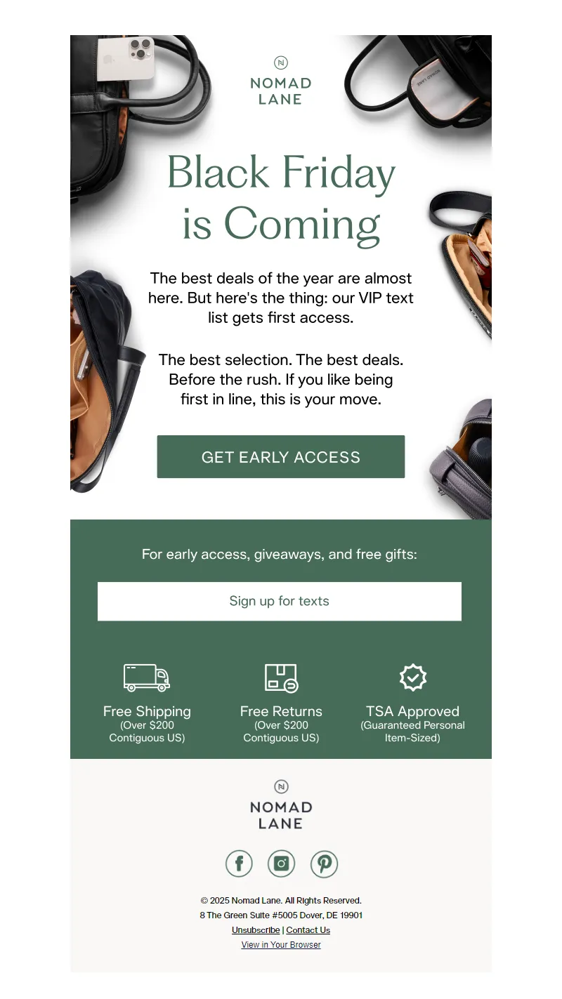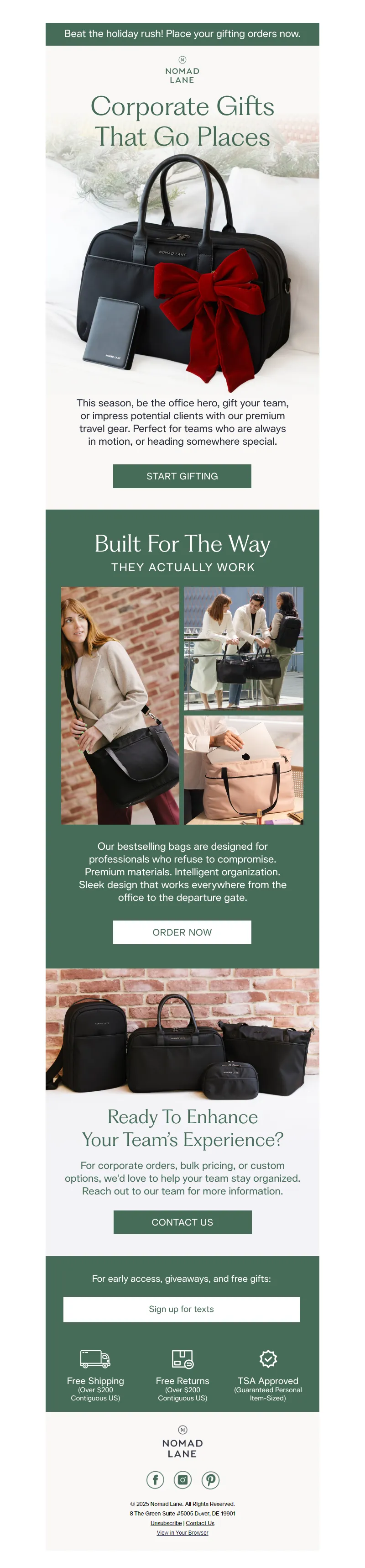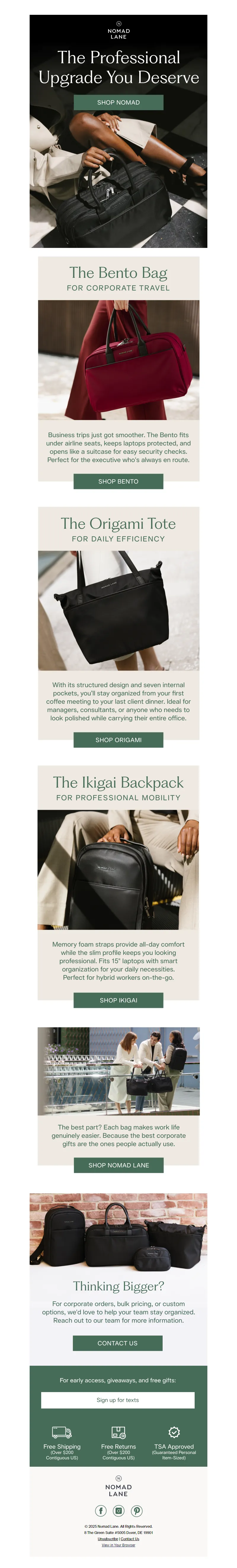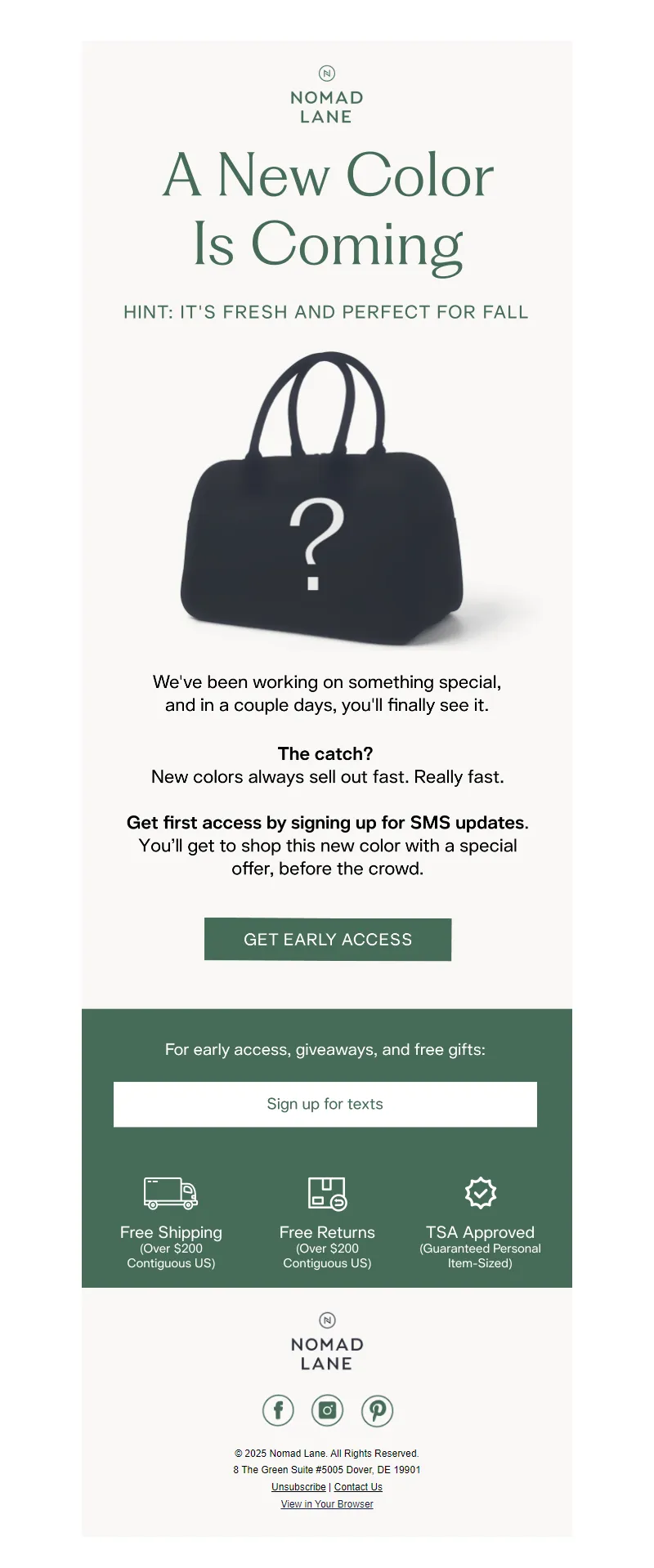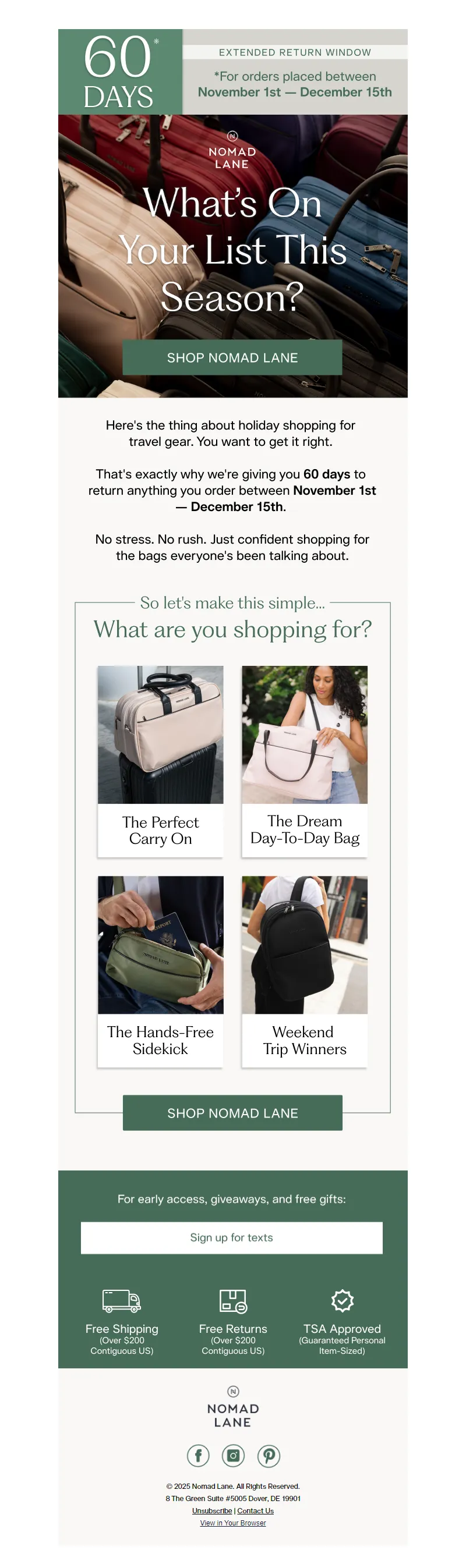 Explore campaign email examples from Nomad Lane, including promotions, newsletters, and product announcements. Built as a reference library for studying real ecommerce email execution.