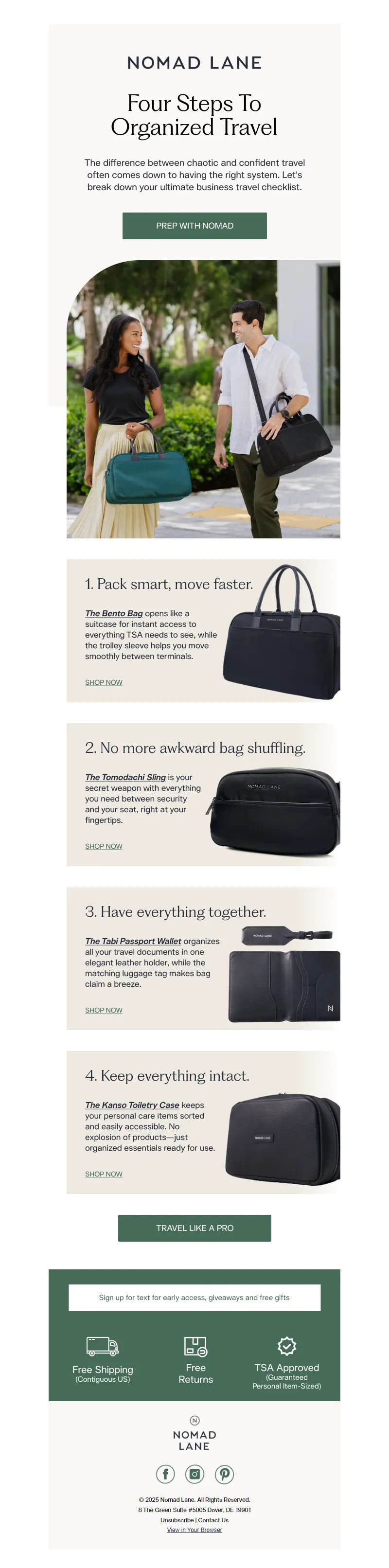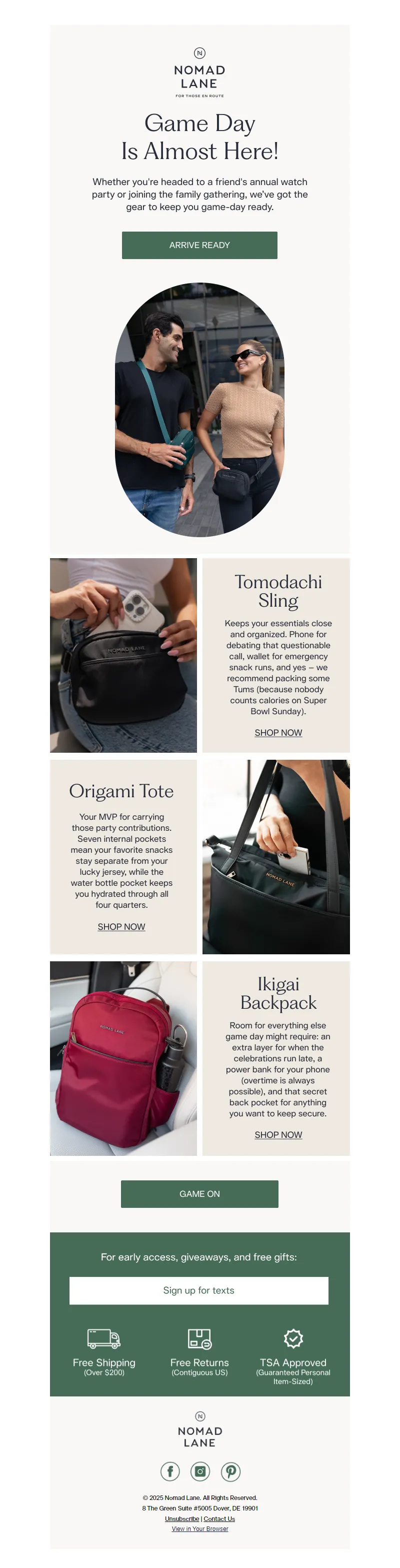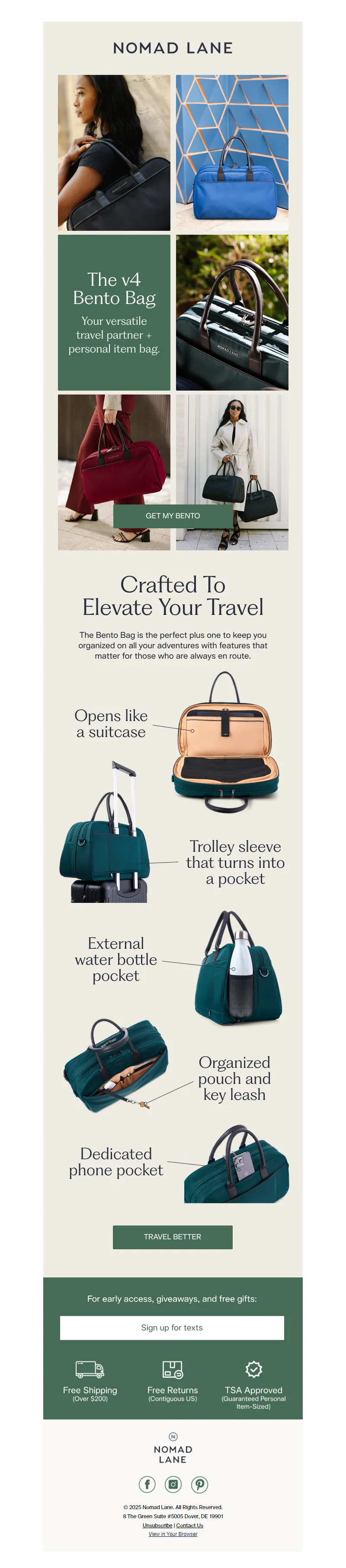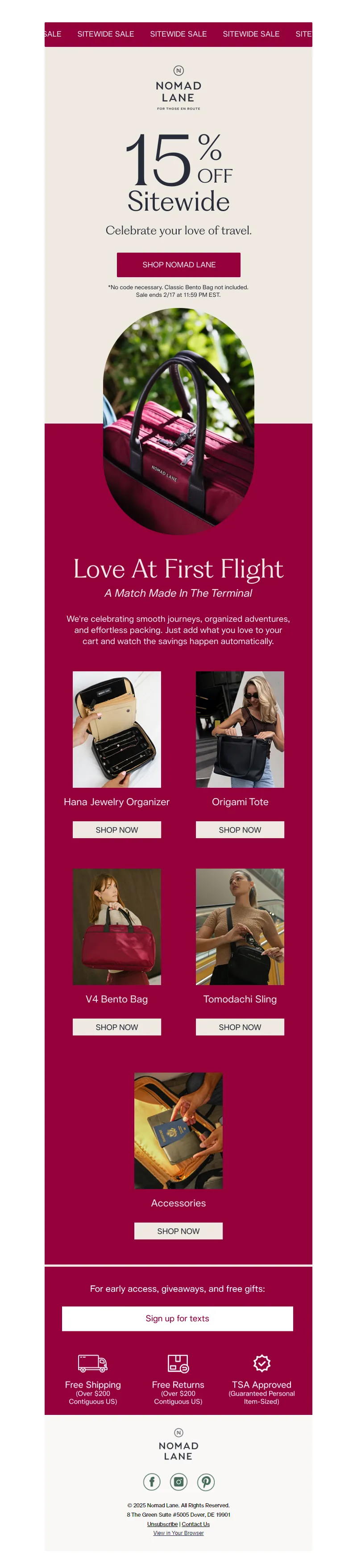 Explore campaign email examples from Nomad Lane, including promotions, newsletters, and product announcements. Built as a reference library for studying real ecommerce email execution.