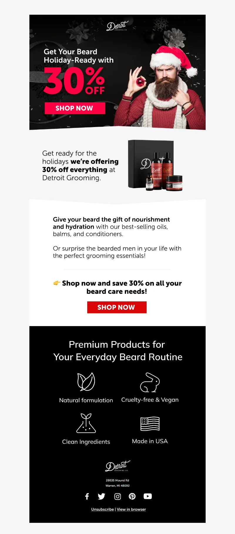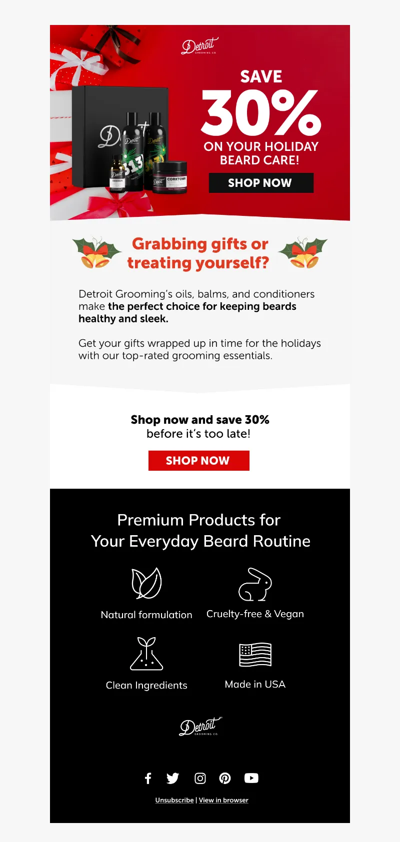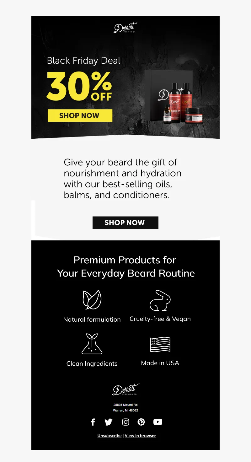 Explore campaign email examples from Detroit Grooming Company, including promotions, newsletters, and product announcements. Built as a reference library for studying real ecommerce email execution.