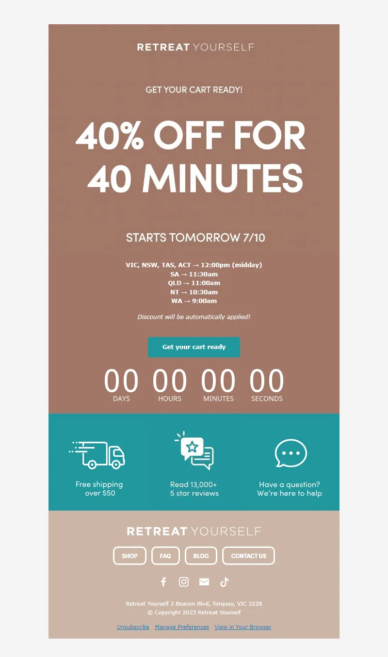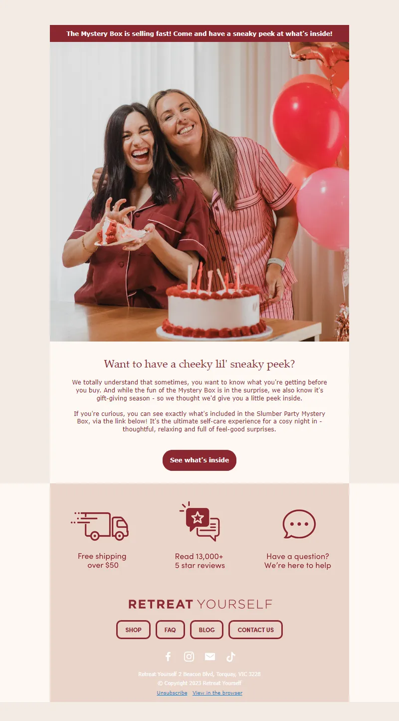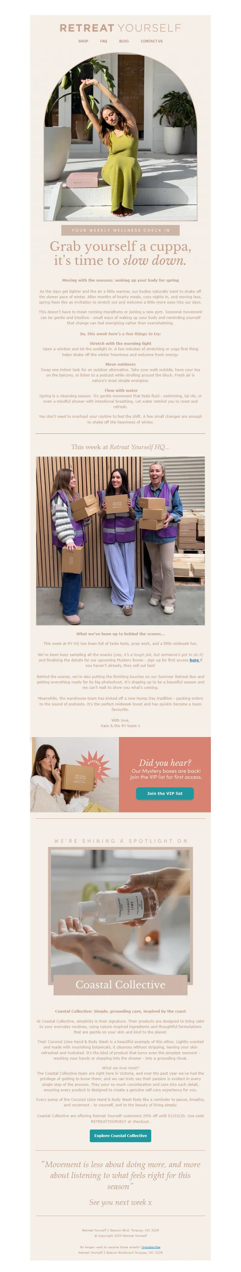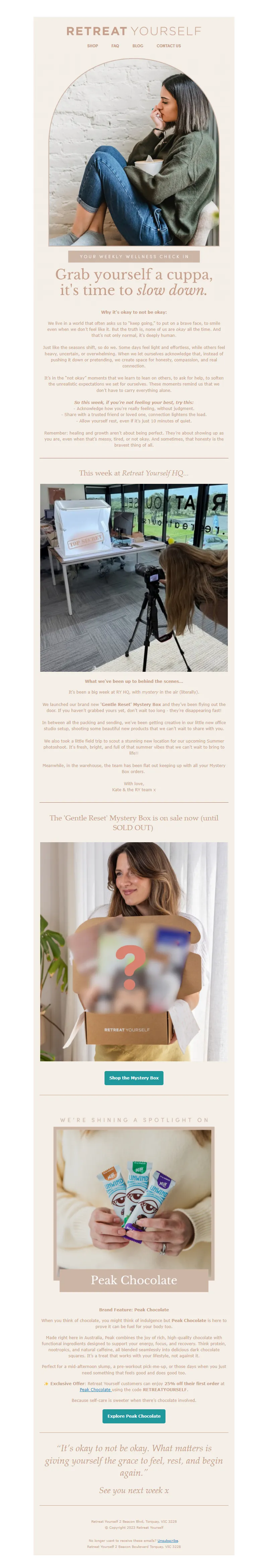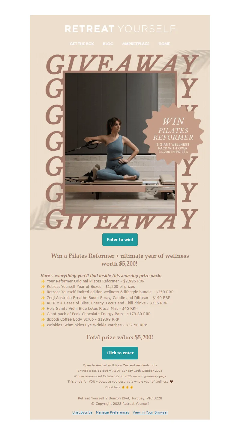 Explore campaign email examples from Retreat Yourself, including promotions, newsletters, and product announcements. Built as a reference library for studying real ecommerce email execution.