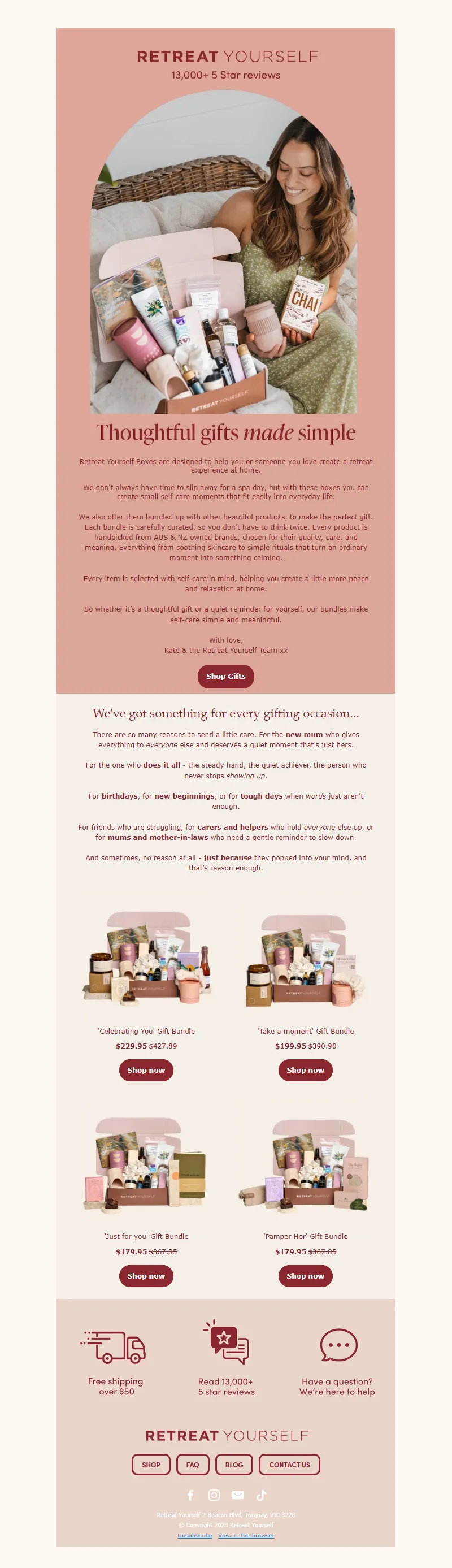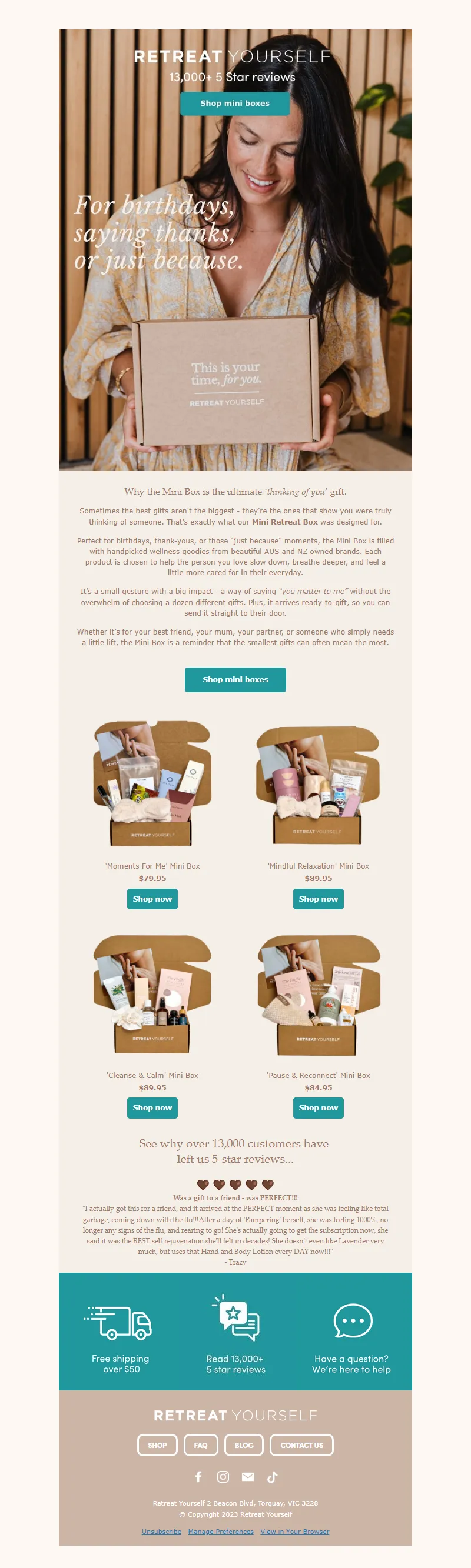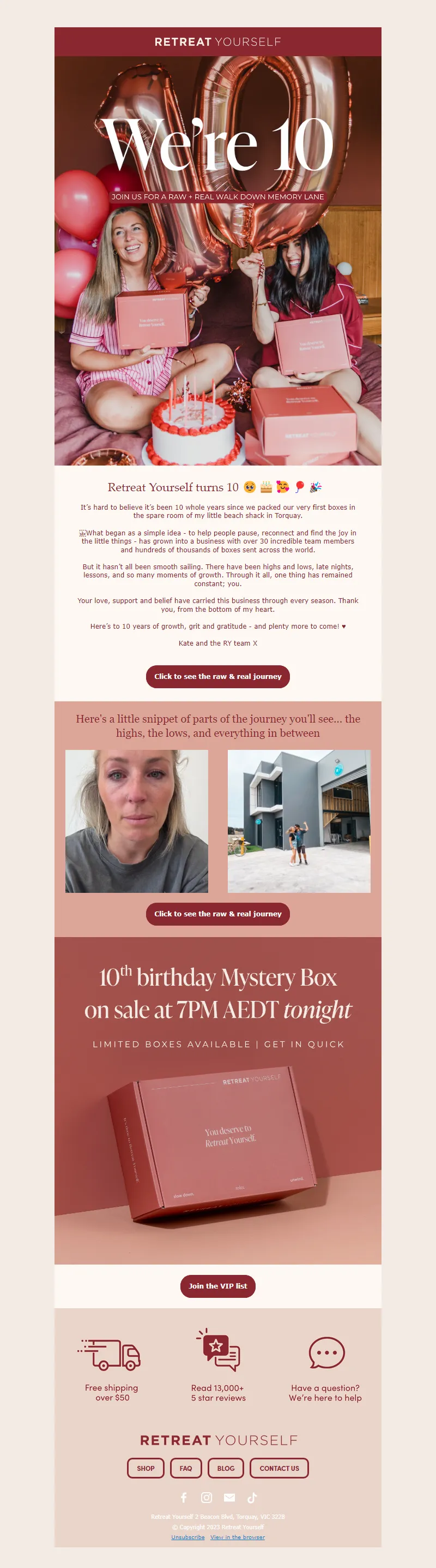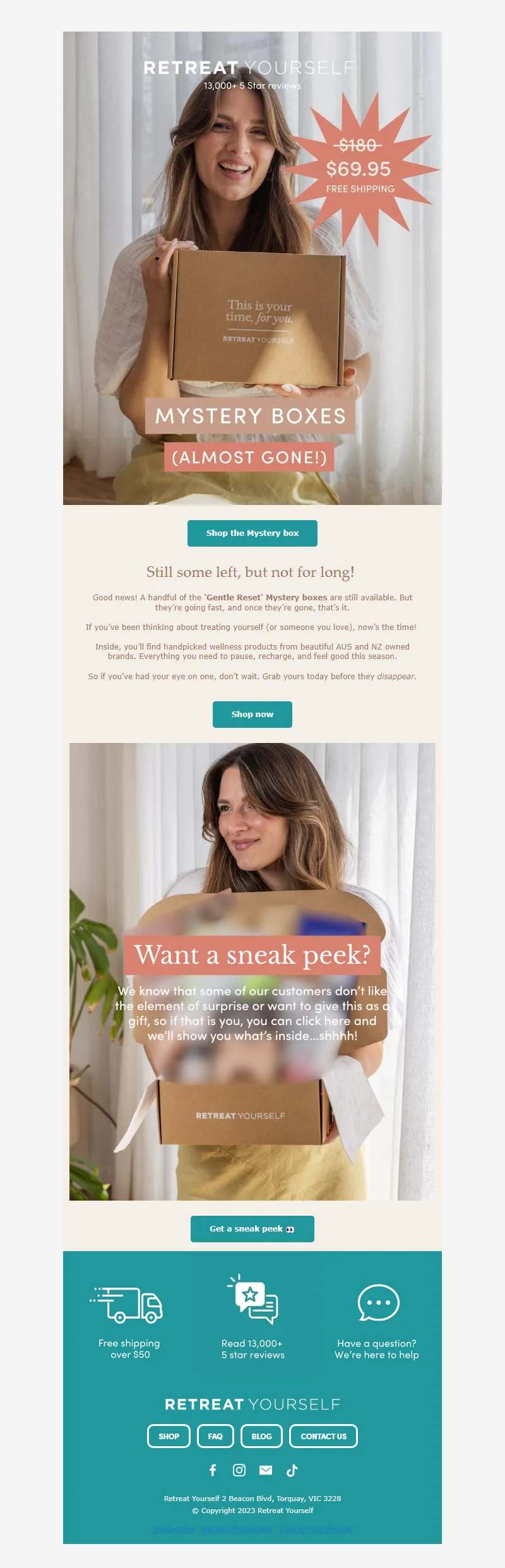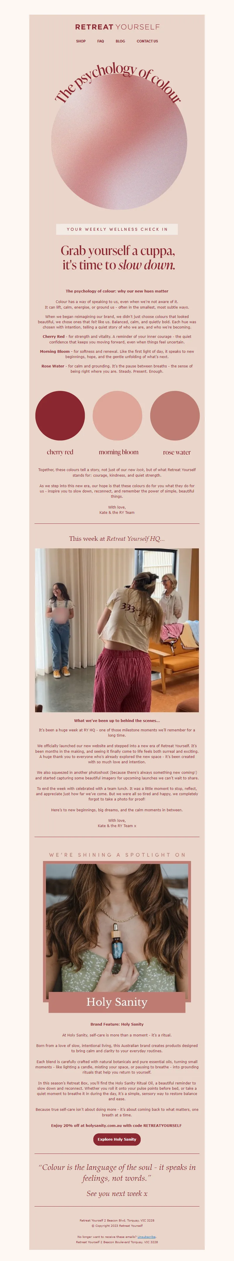 Explore campaign email examples from Retreat Yourself, including promotions, newsletters, and product announcements. Built as a reference library for studying real ecommerce email execution.
