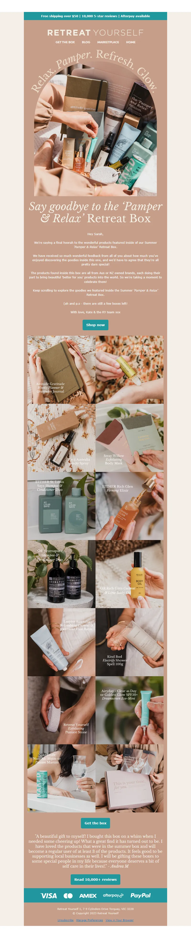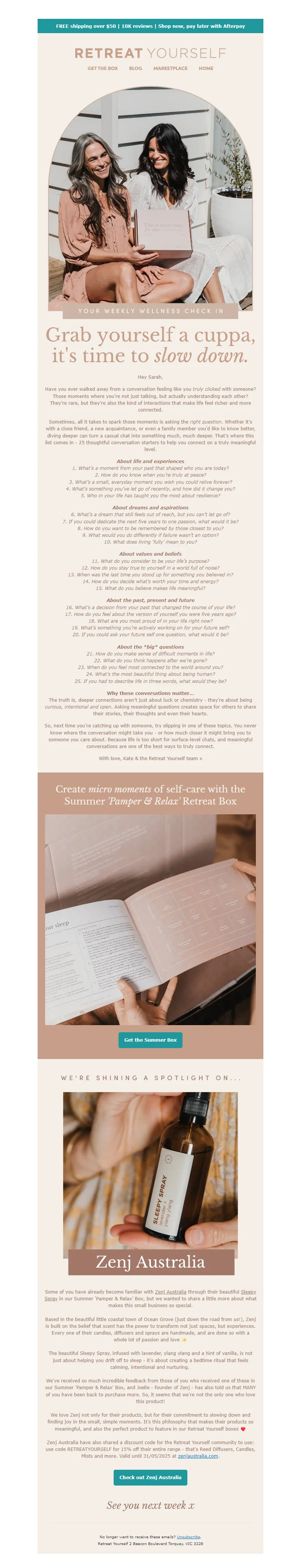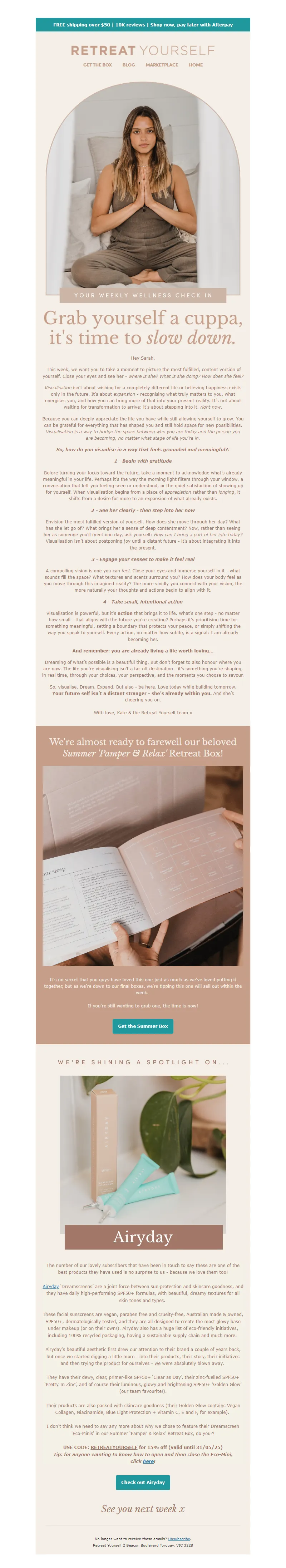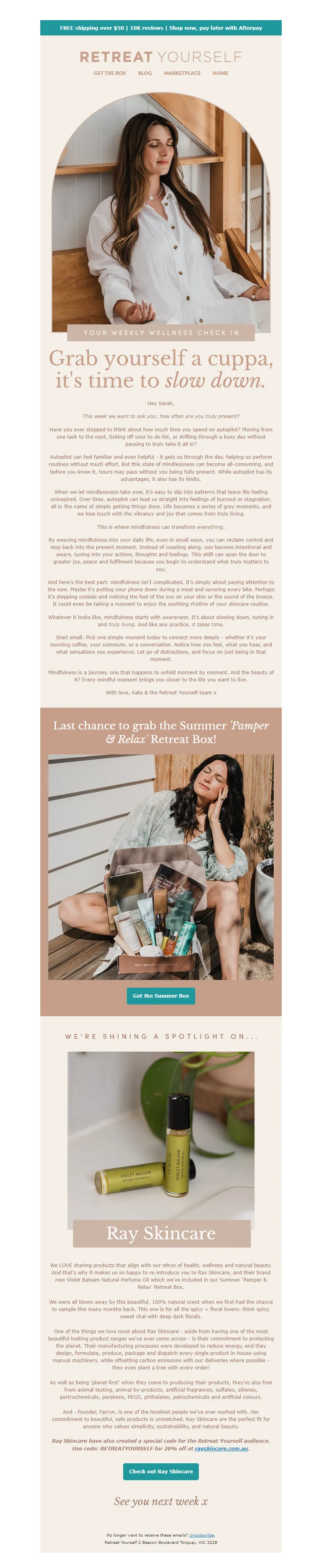 Explore campaign email examples from Retreat Yourself, including promotions, newsletters, and product announcements. Built as a reference library for studying real ecommerce email execution.