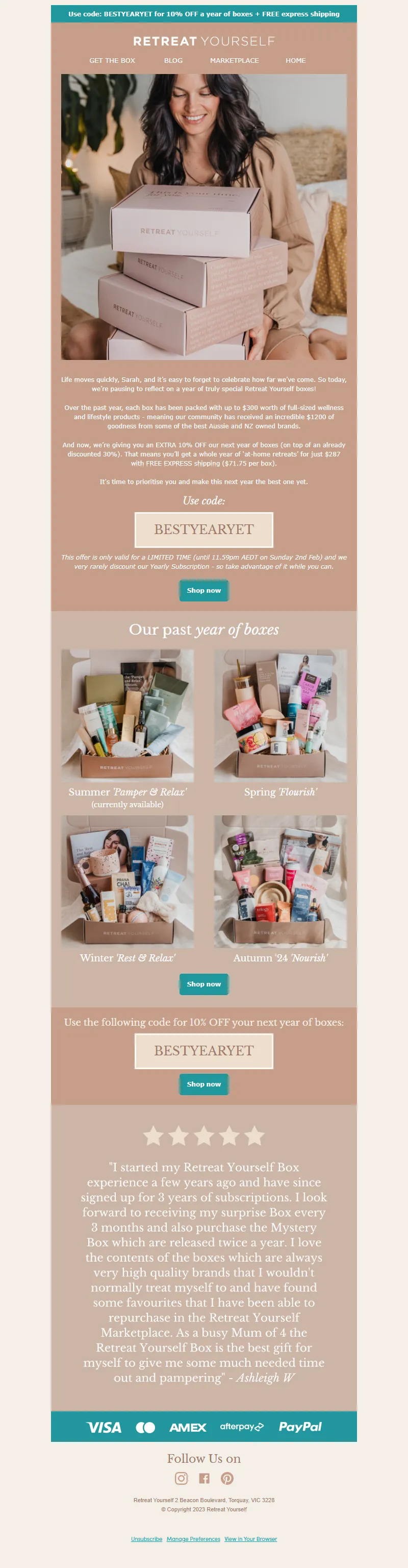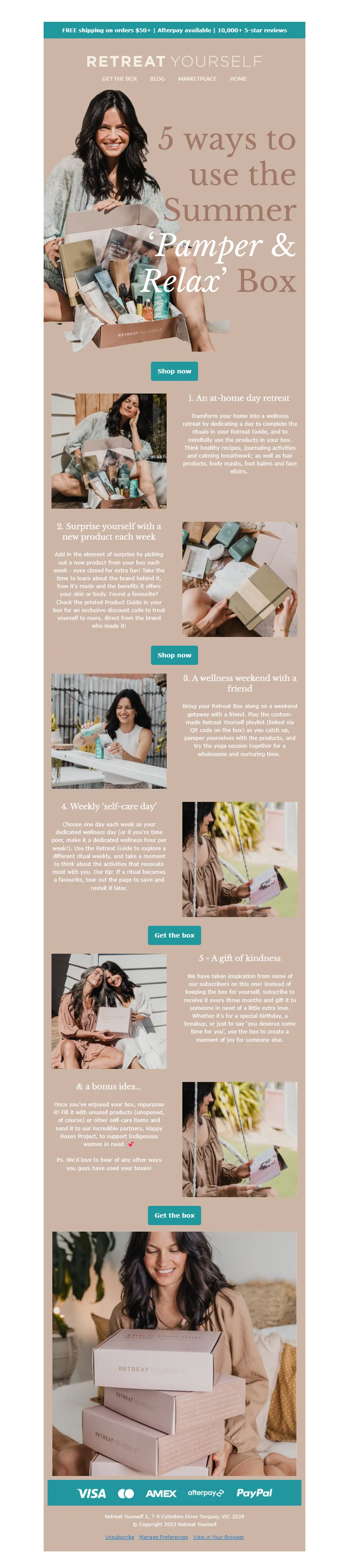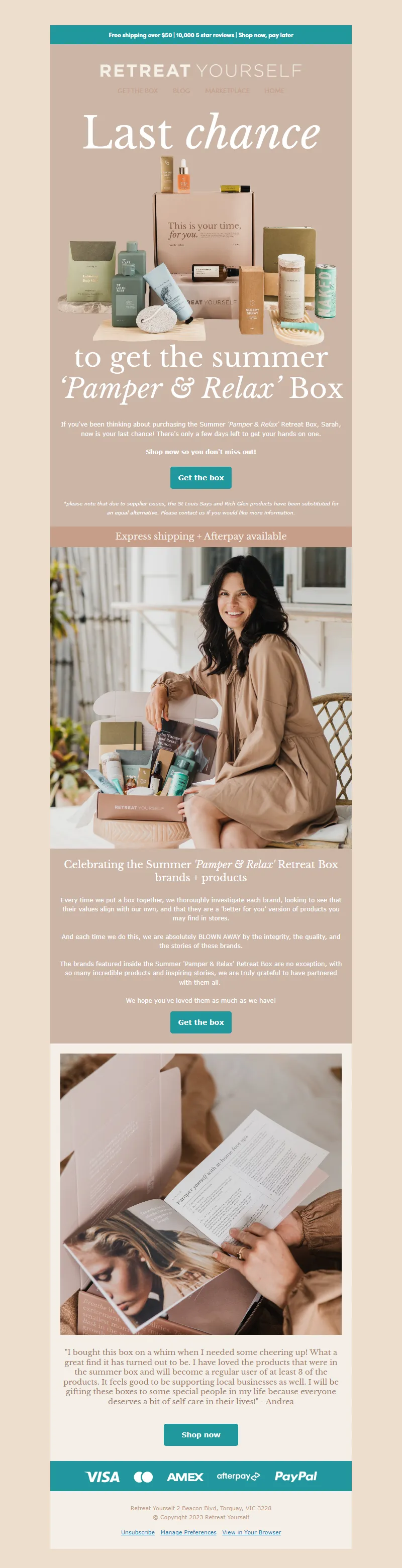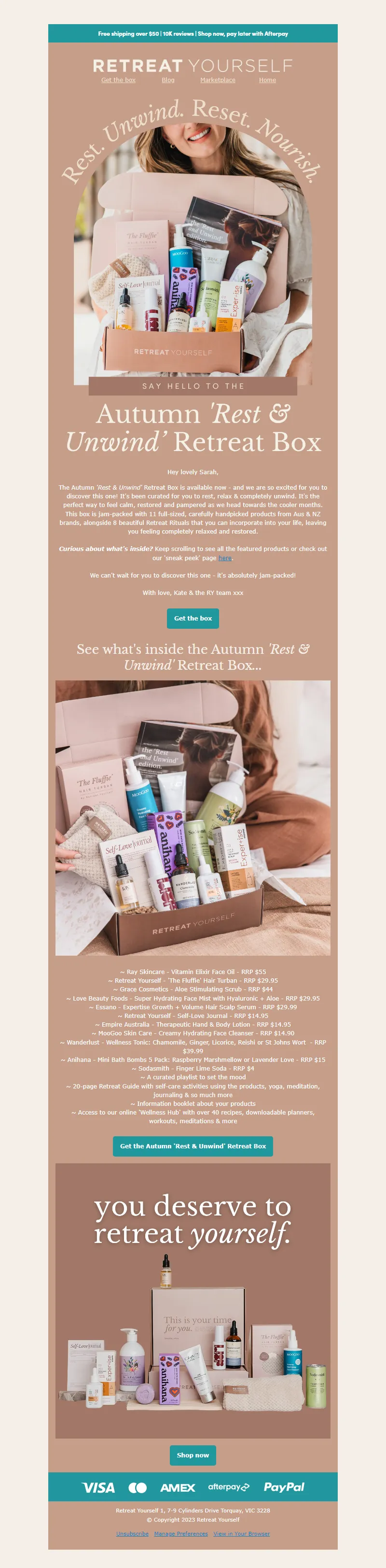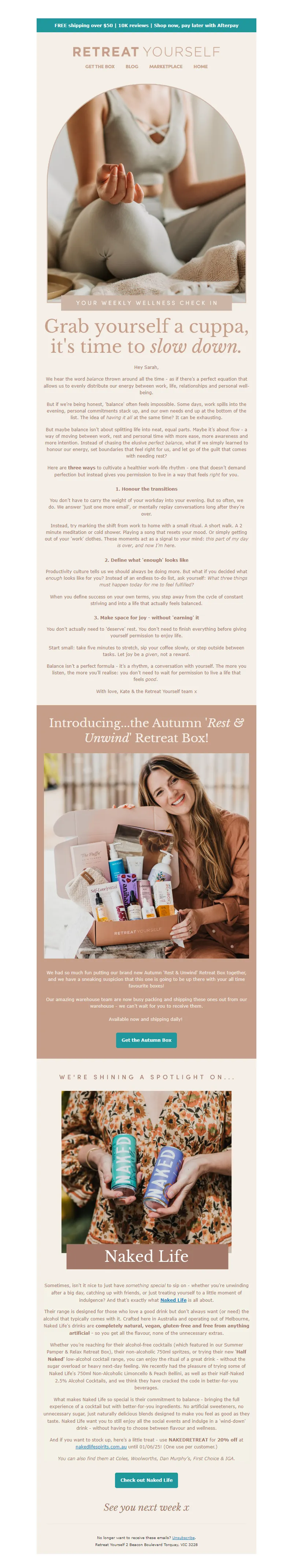 Explore campaign email examples from Retreat Yourself, including promotions, newsletters, and product announcements. Built as a reference library for studying real ecommerce email execution.