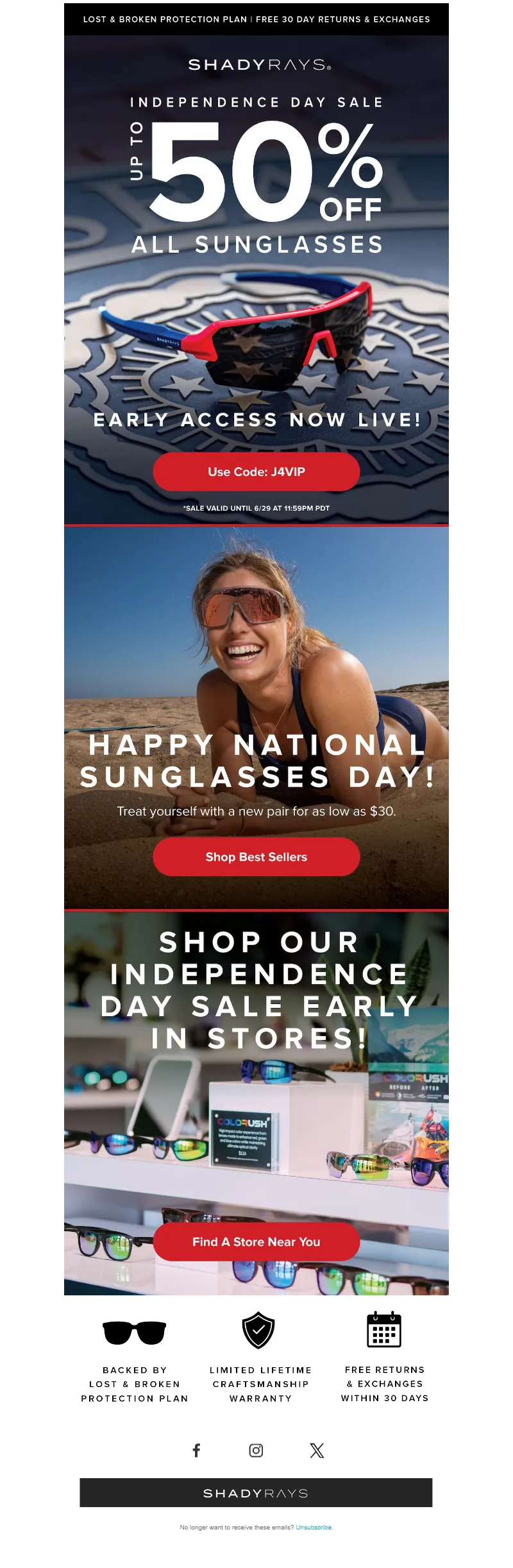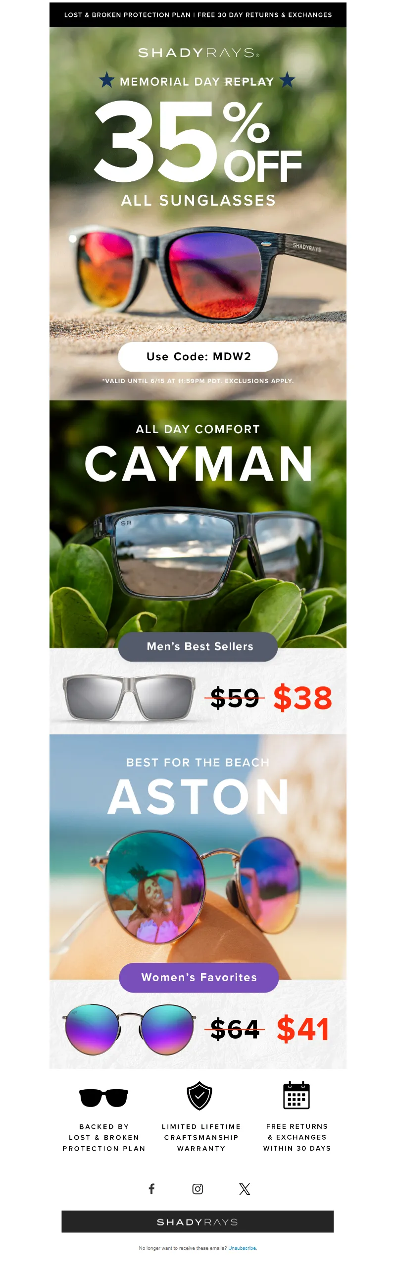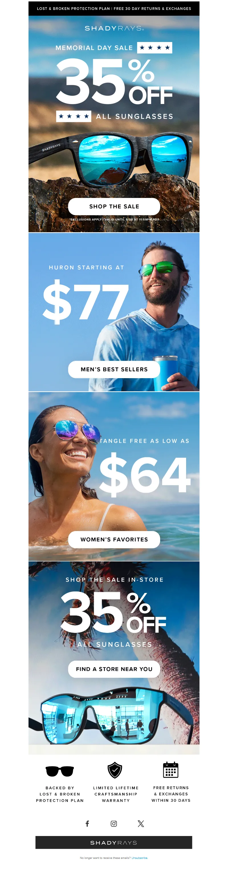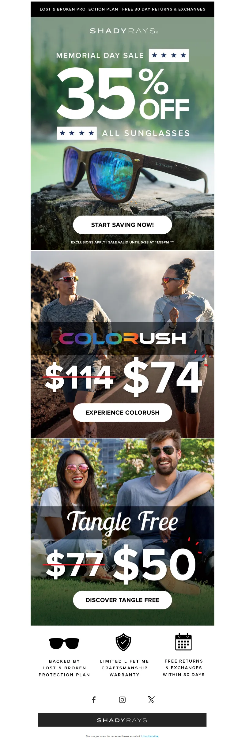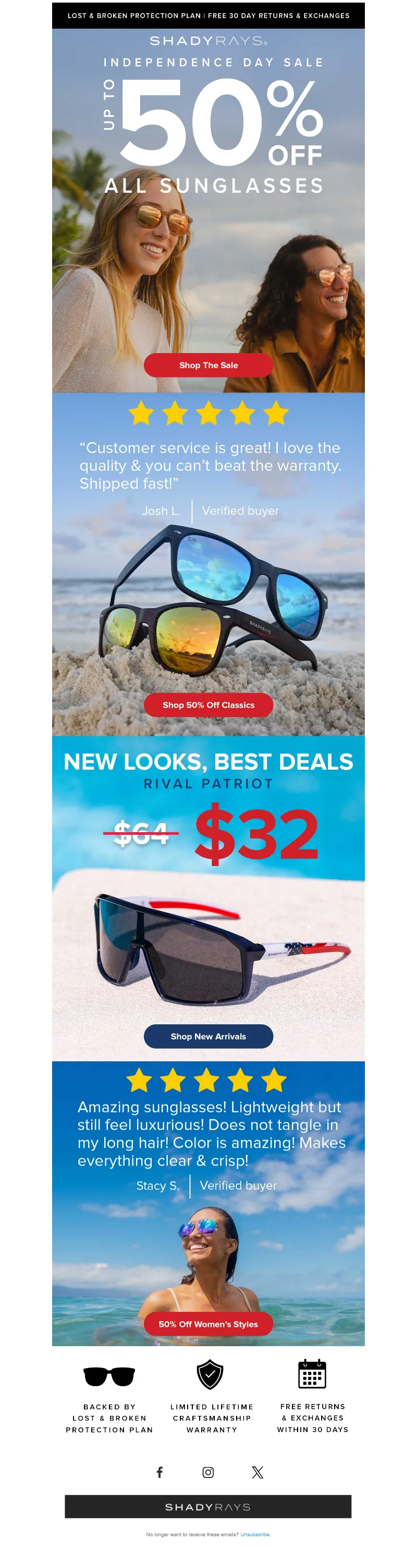 Explore campaign email examples from Shady Rays Polarized Sunglasses, including promotions, newsletters, and product announcements. Built as a reference library for studying real ecommerce email execution.
