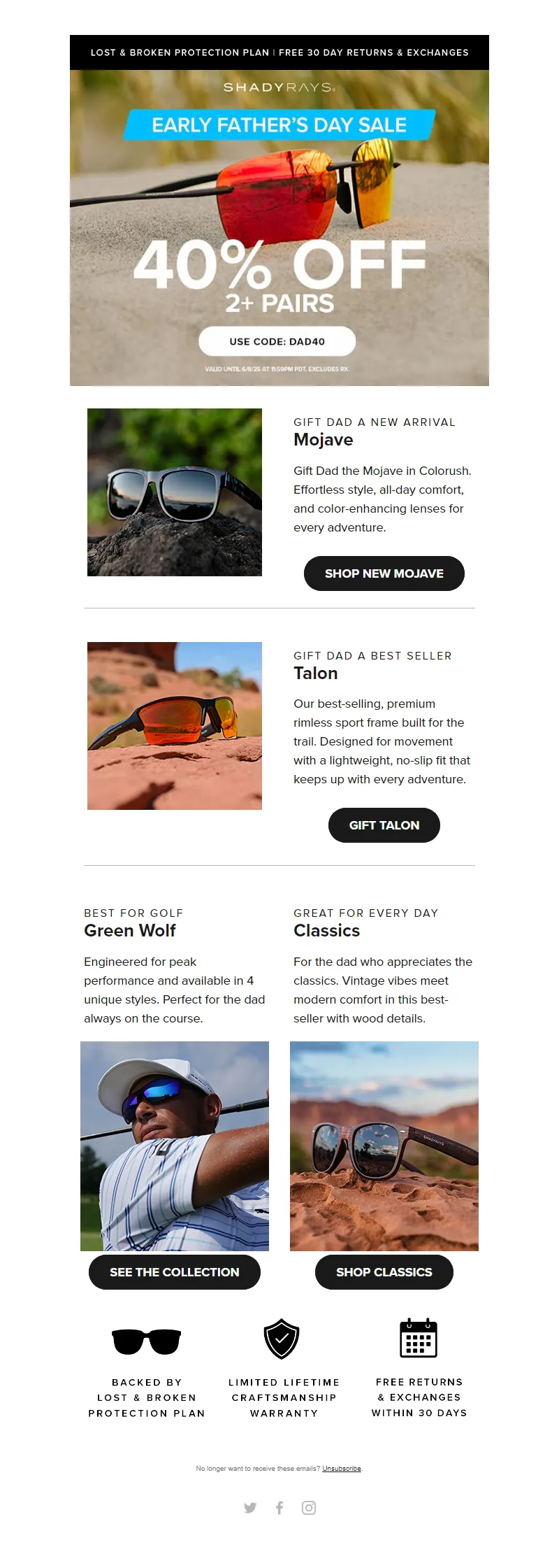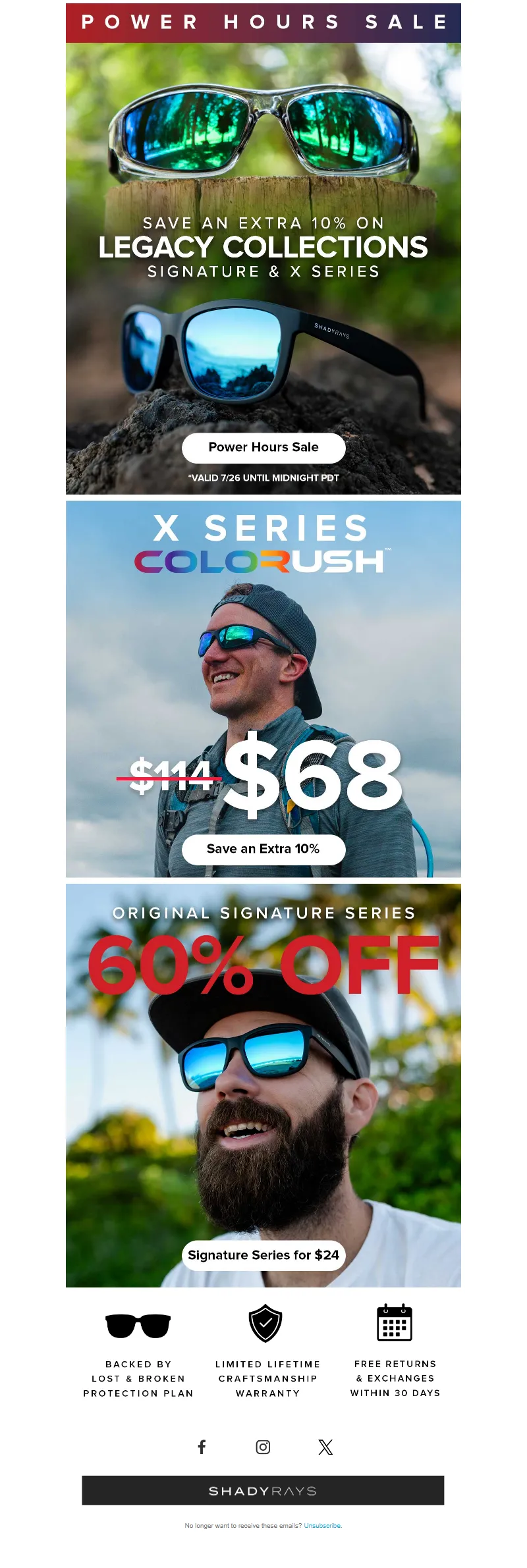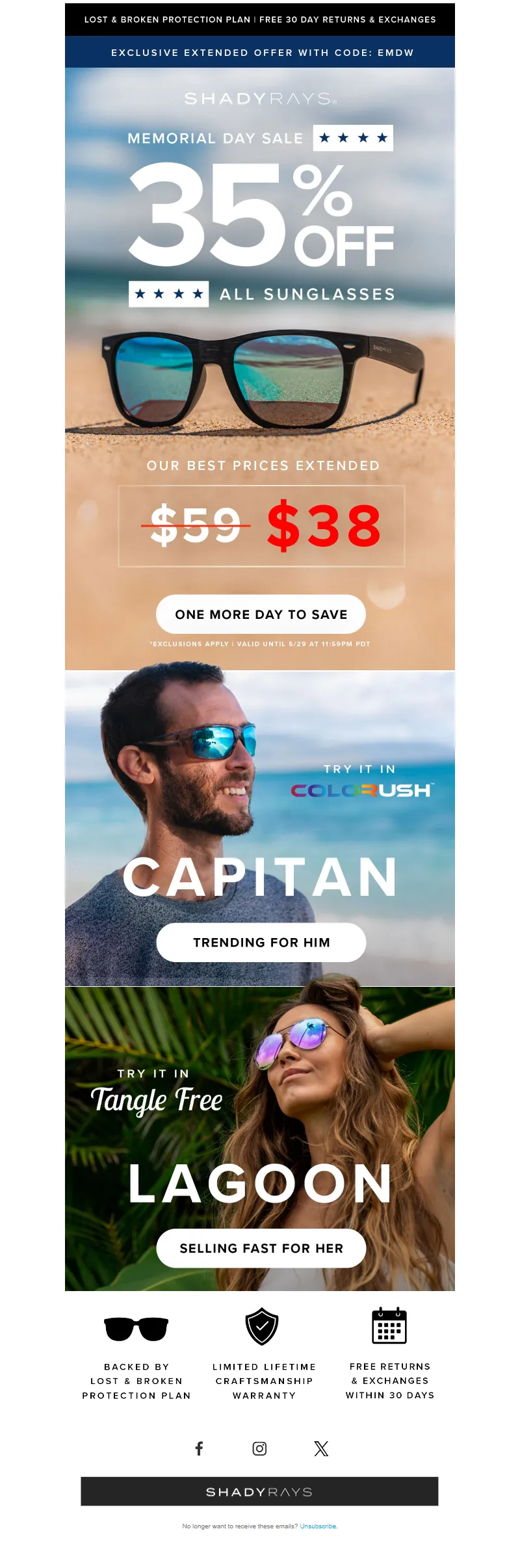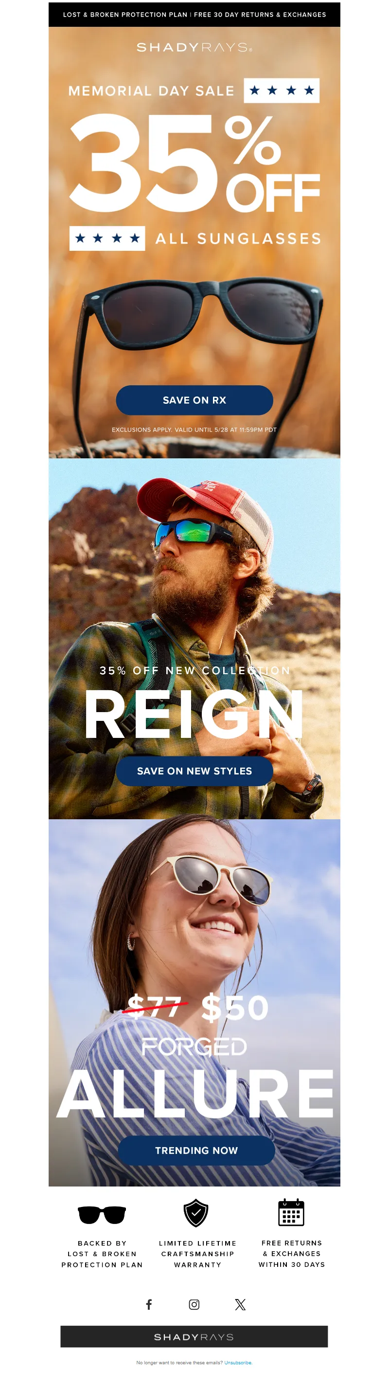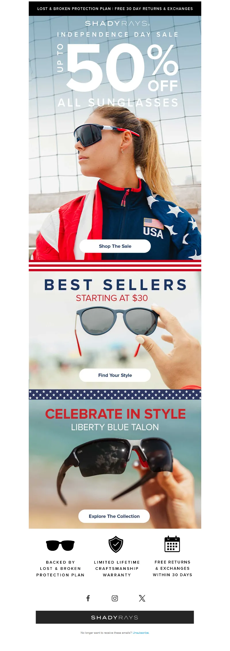 Explore campaign email examples from Shady Rays Polarized Sunglasses, including promotions, newsletters, and product announcements. Built as a reference library for studying real ecommerce email execution.