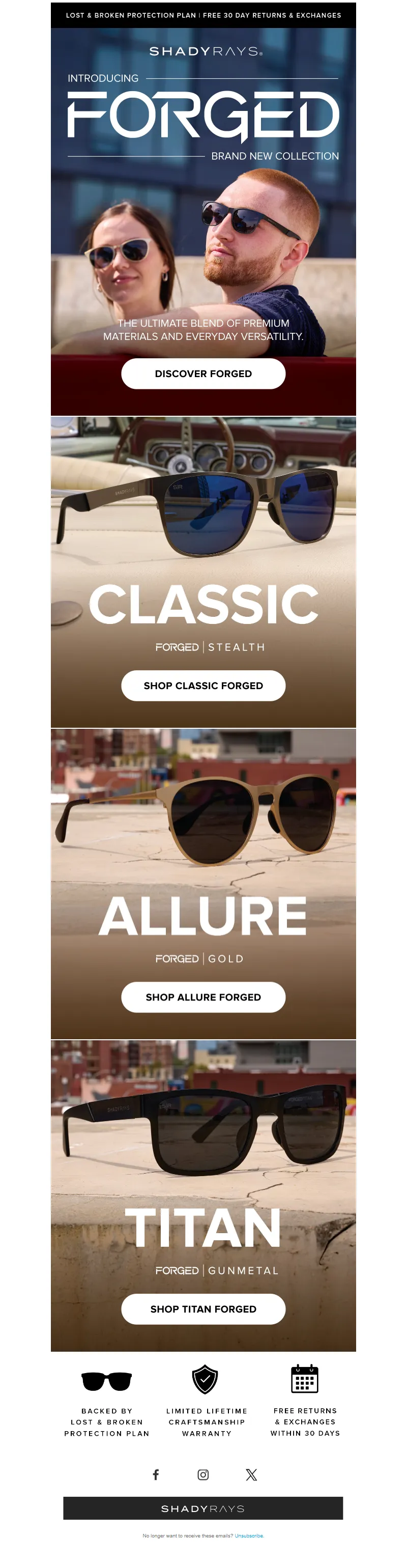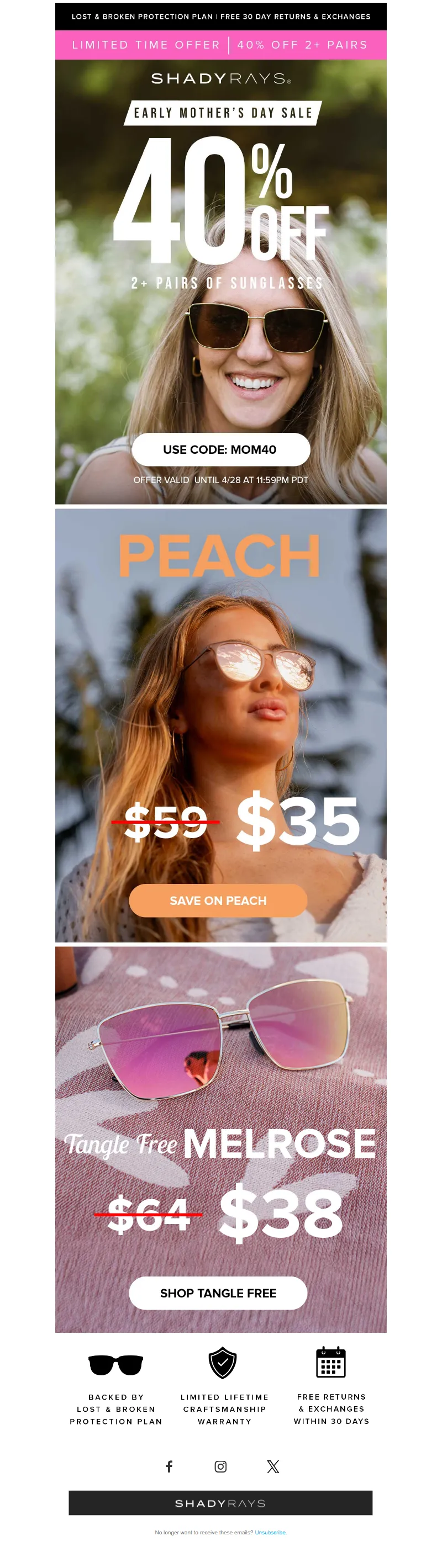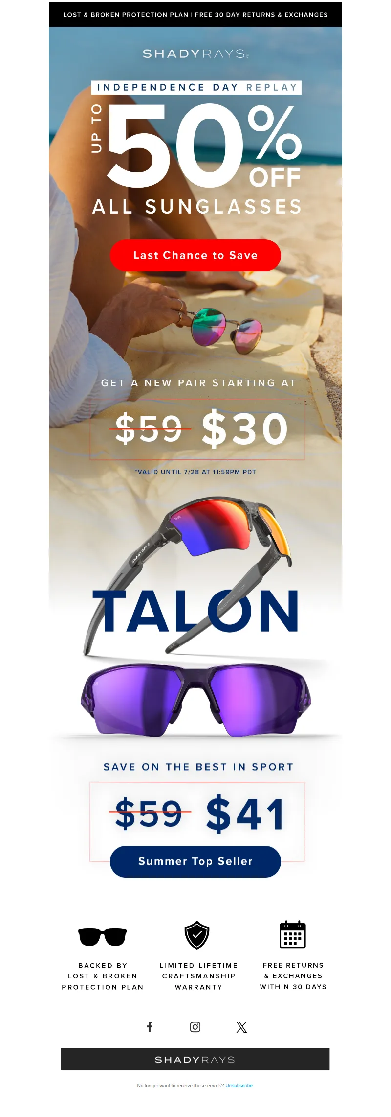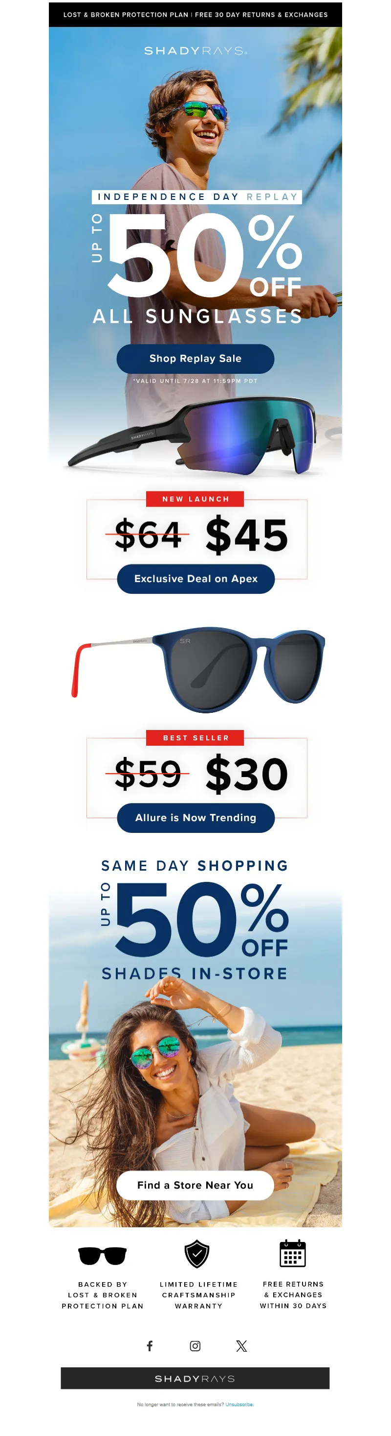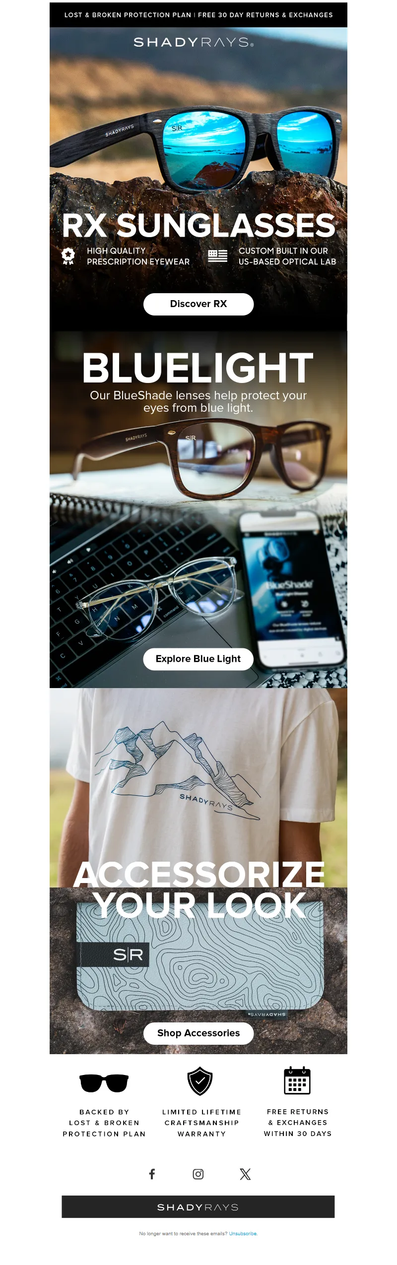Explore campaign email examples from Shady Rays Polarized Sunglasses, including promotions, newsletters, and product announcements. Built as a reference library for studying real ecommerce email execution.
