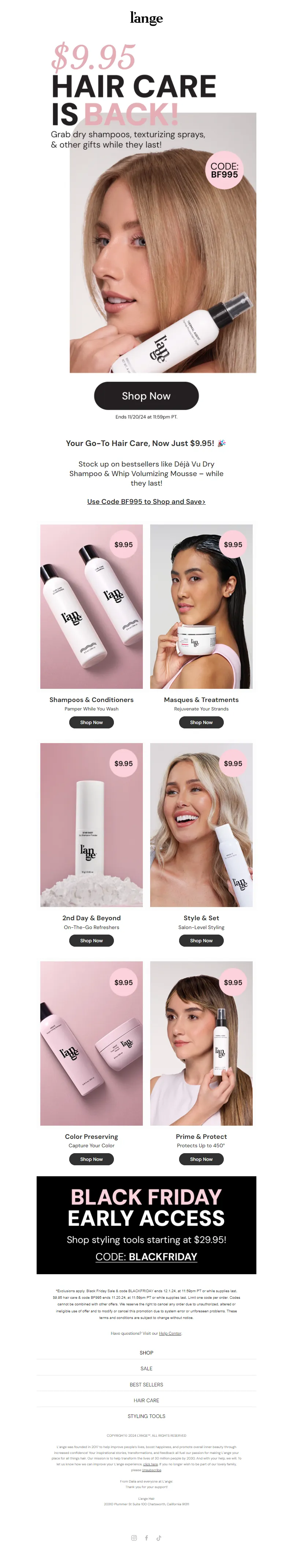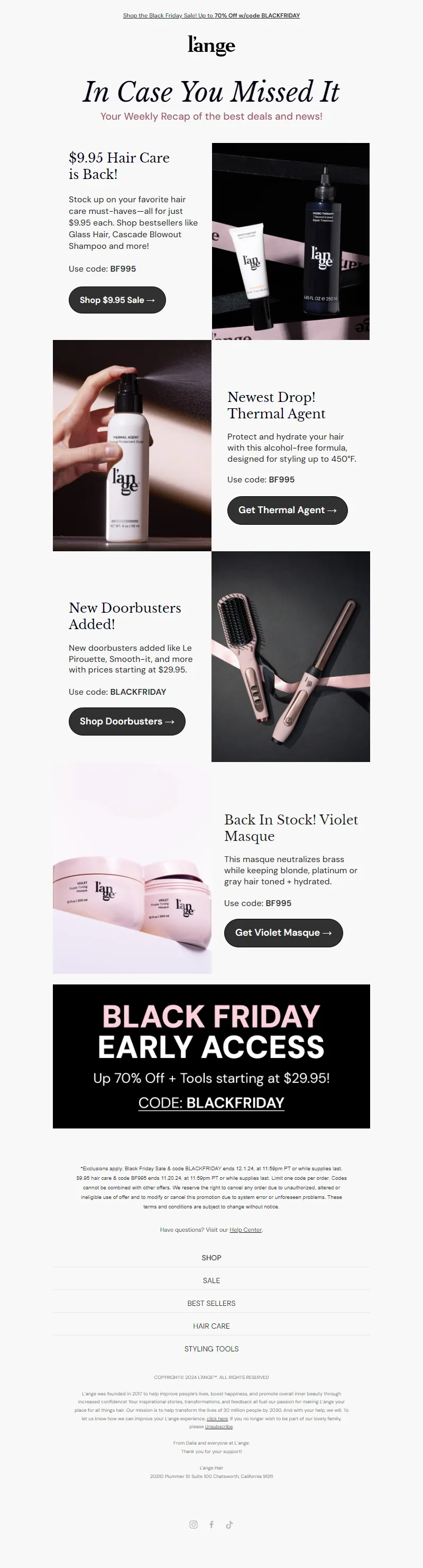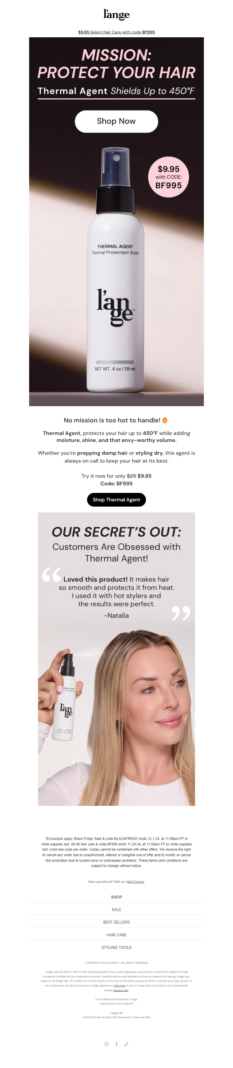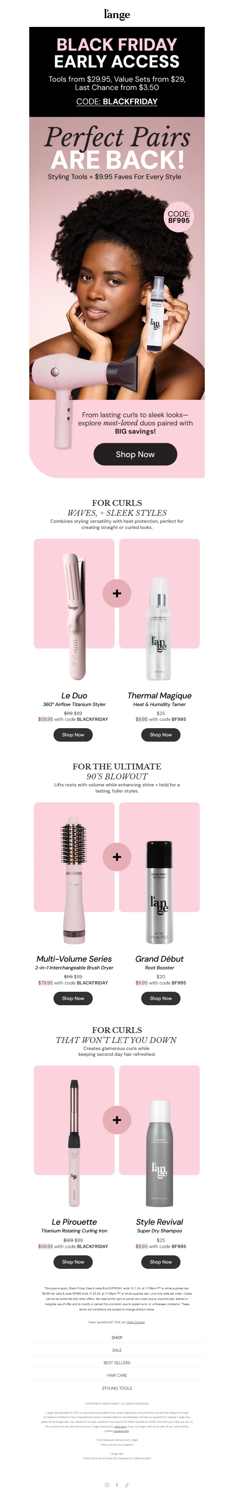 Explore campaign email examples from L'ange Hair, including promotions, newsletters, and product announcements. Built as a reference library for studying real ecommerce email execution.