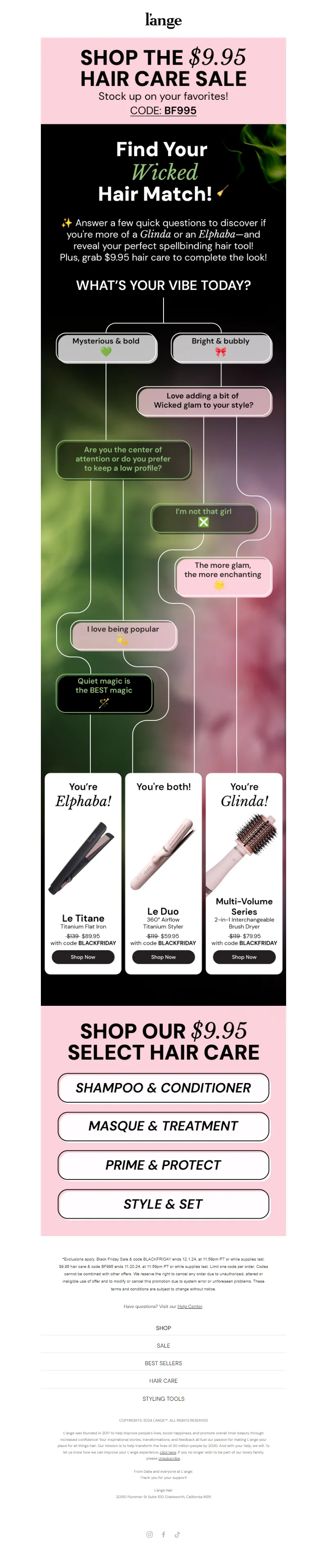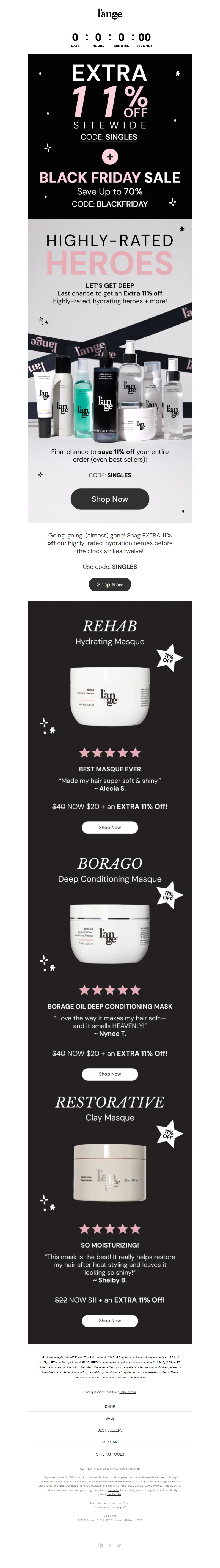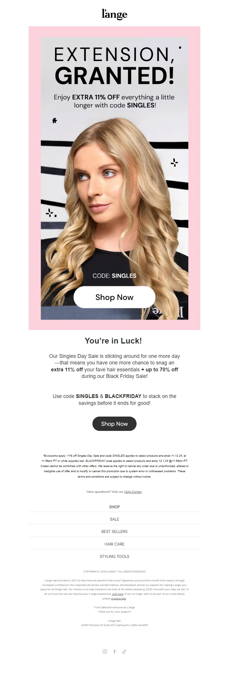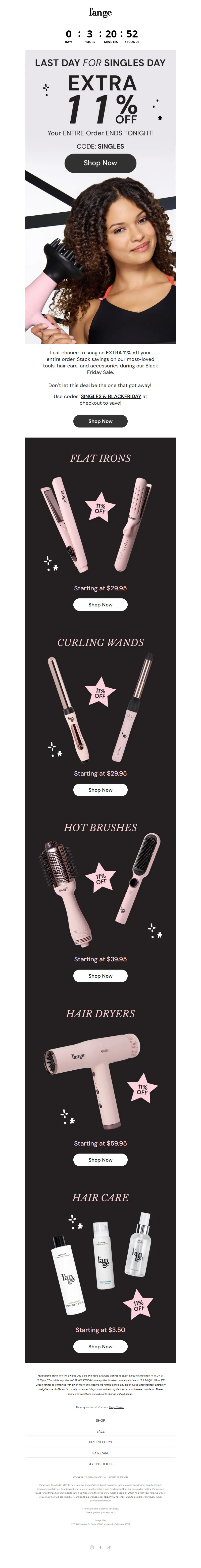 Explore campaign email examples from L'ange Hair, including promotions, newsletters, and product announcements. Built as a reference library for studying real ecommerce email execution.
