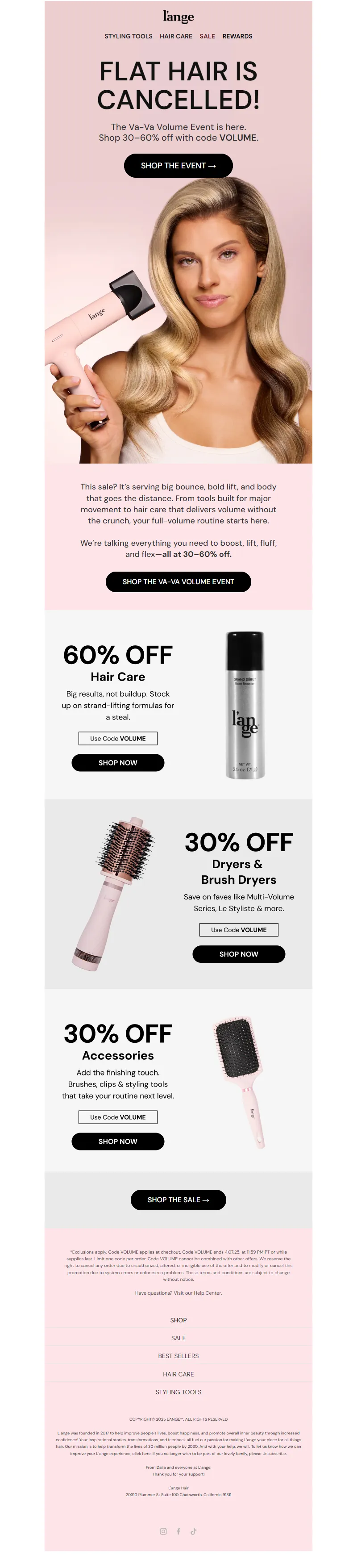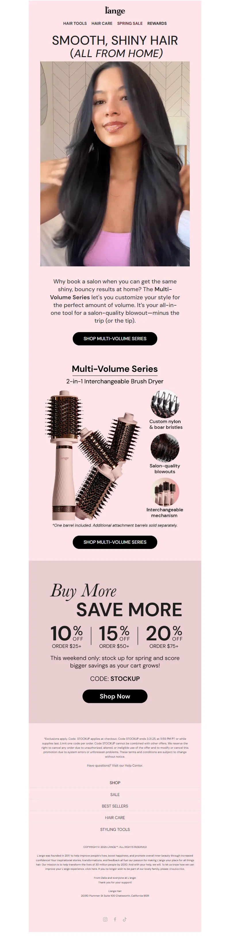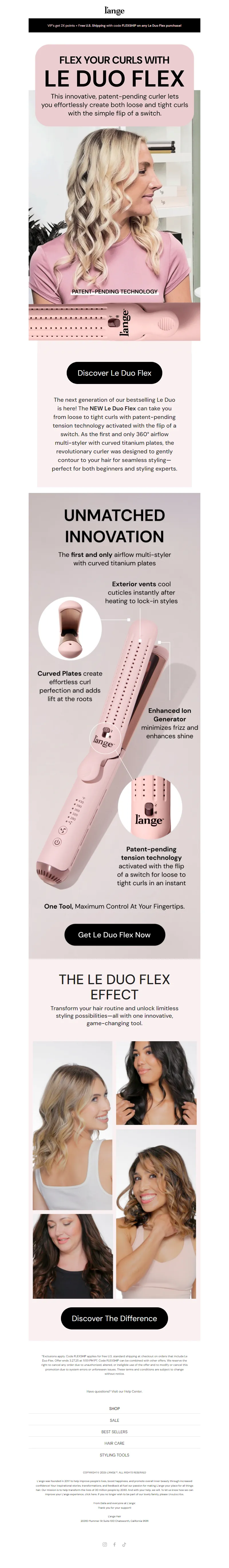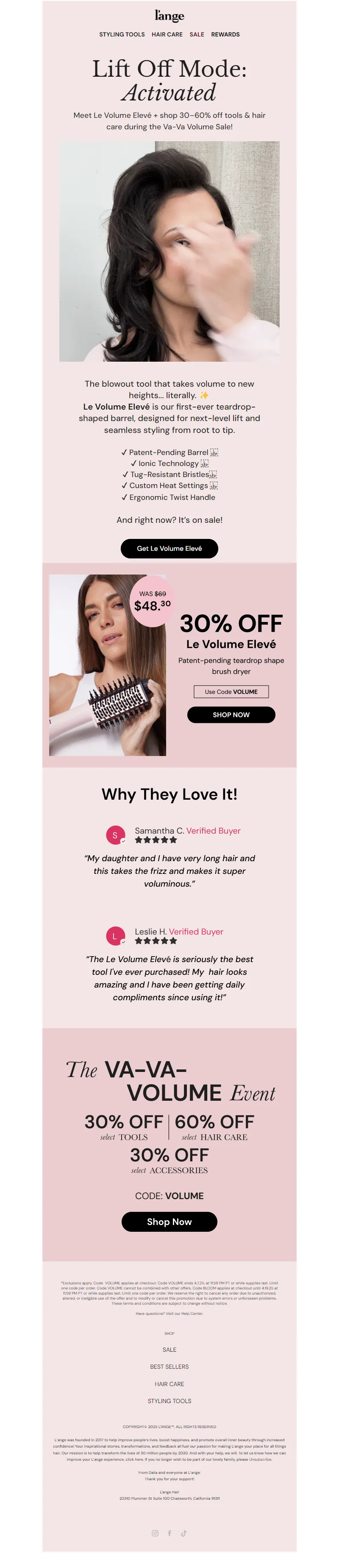 Explore campaign email examples from L'ange Hair, including promotions, newsletters, and product announcements. Built as a reference library for studying real ecommerce email execution.