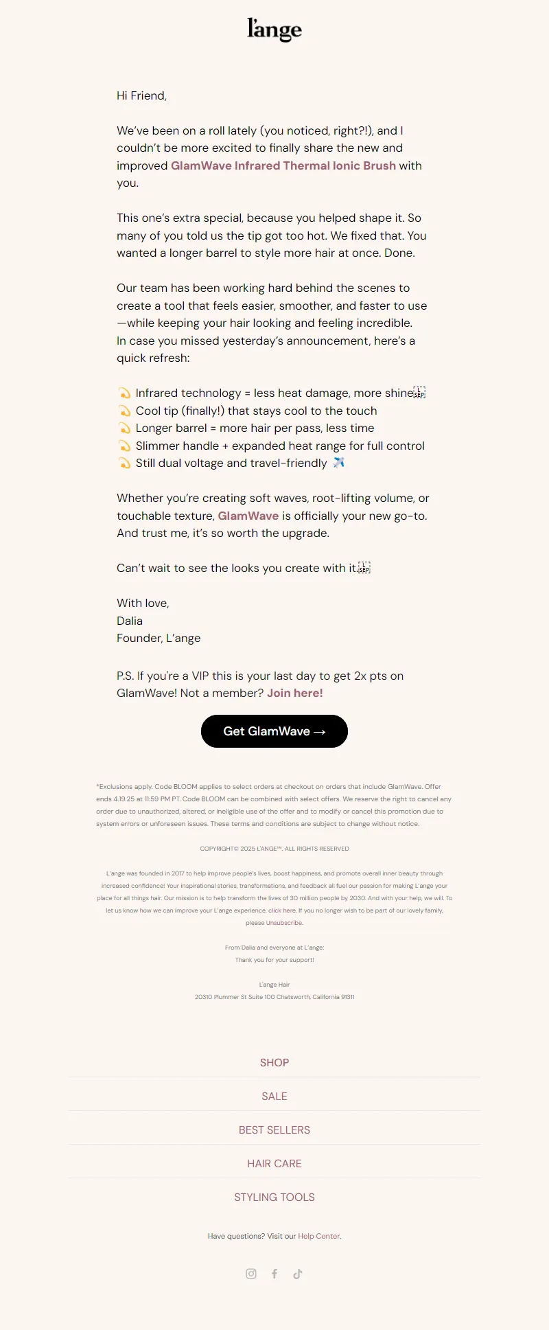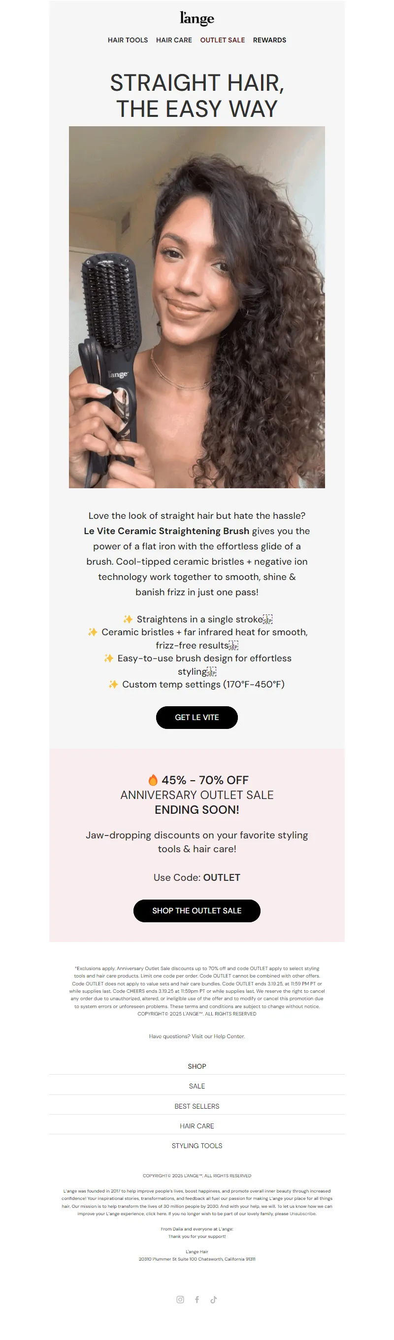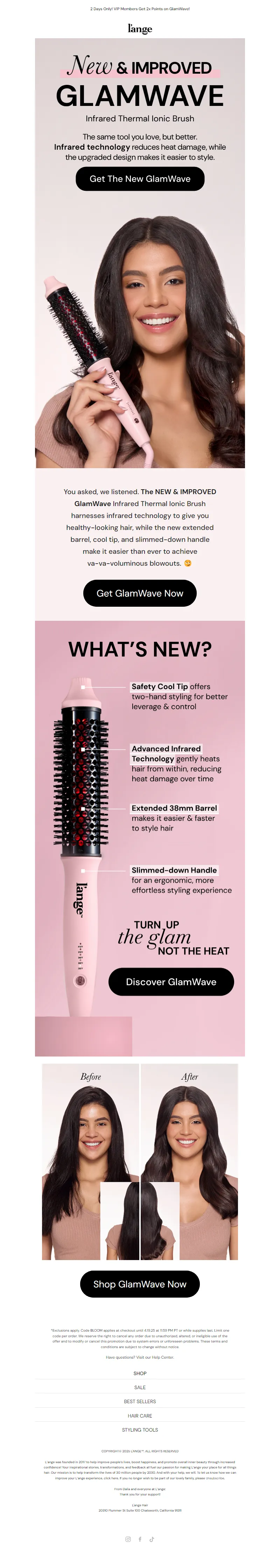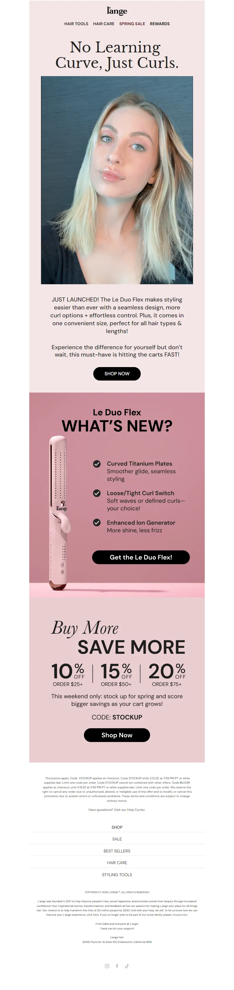 Explore campaign email examples from L'ange Hair, including promotions, newsletters, and product announcements. Built as a reference library for studying real ecommerce email execution.