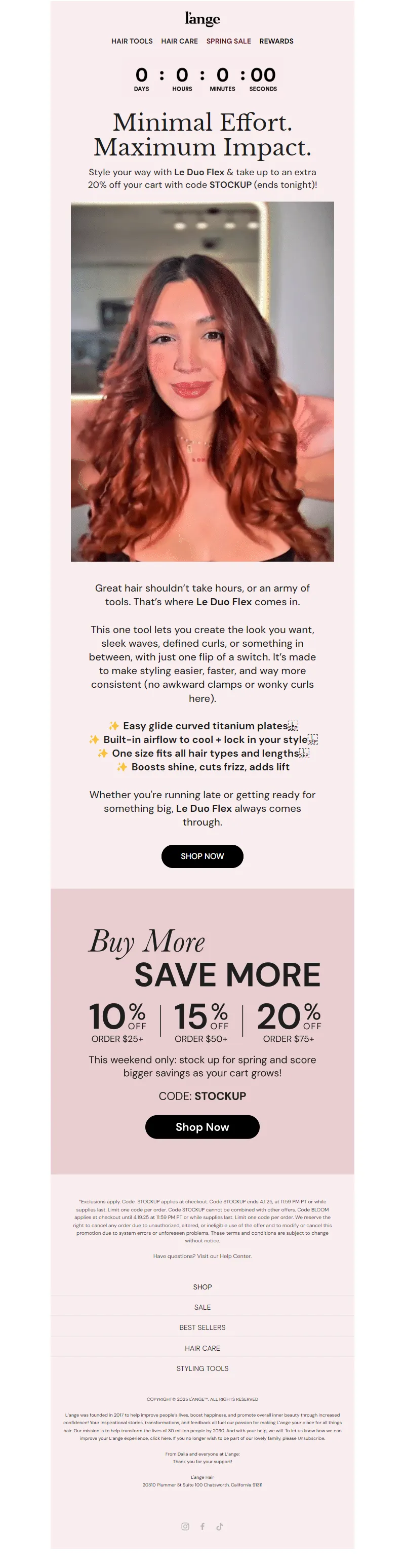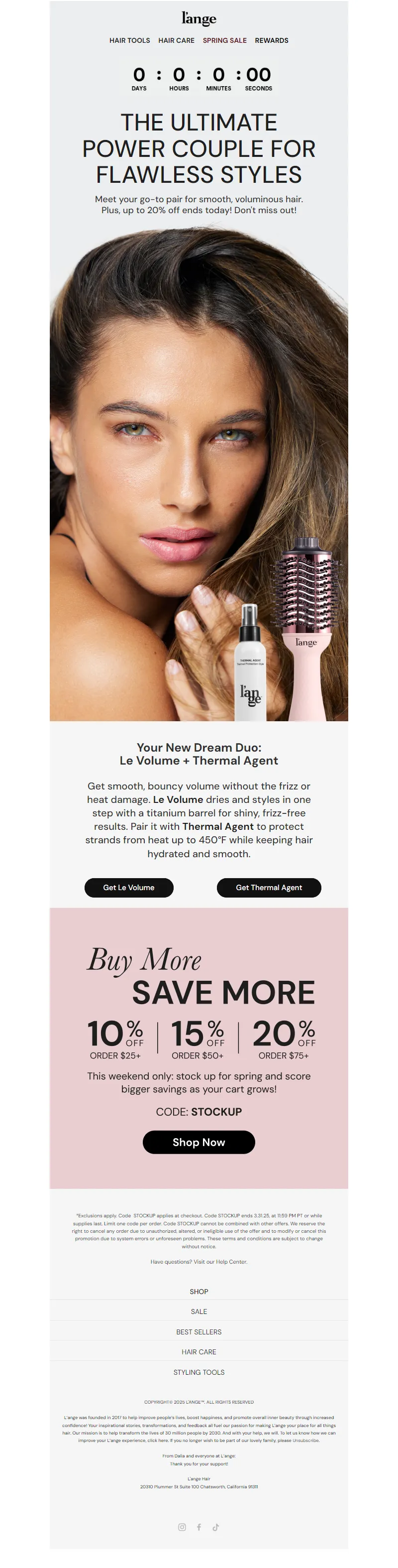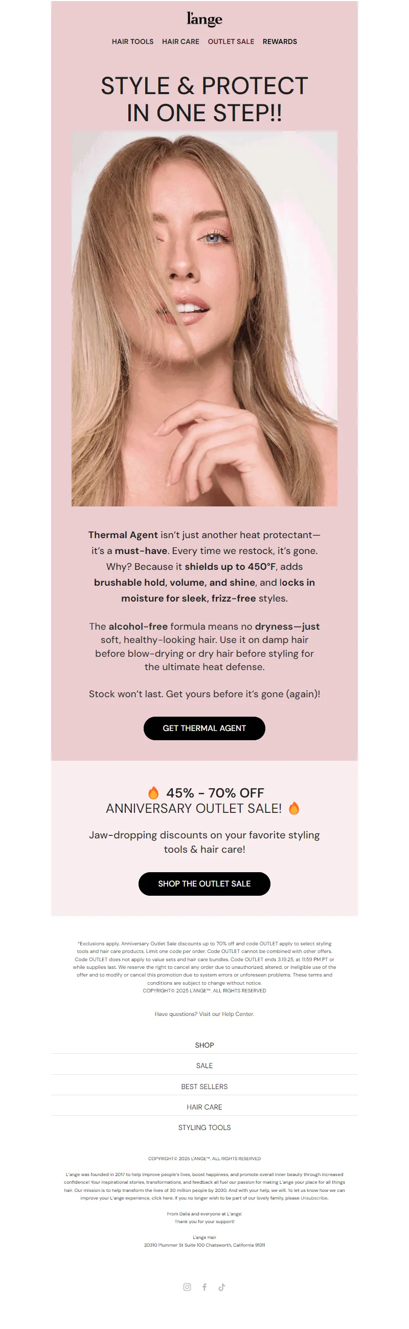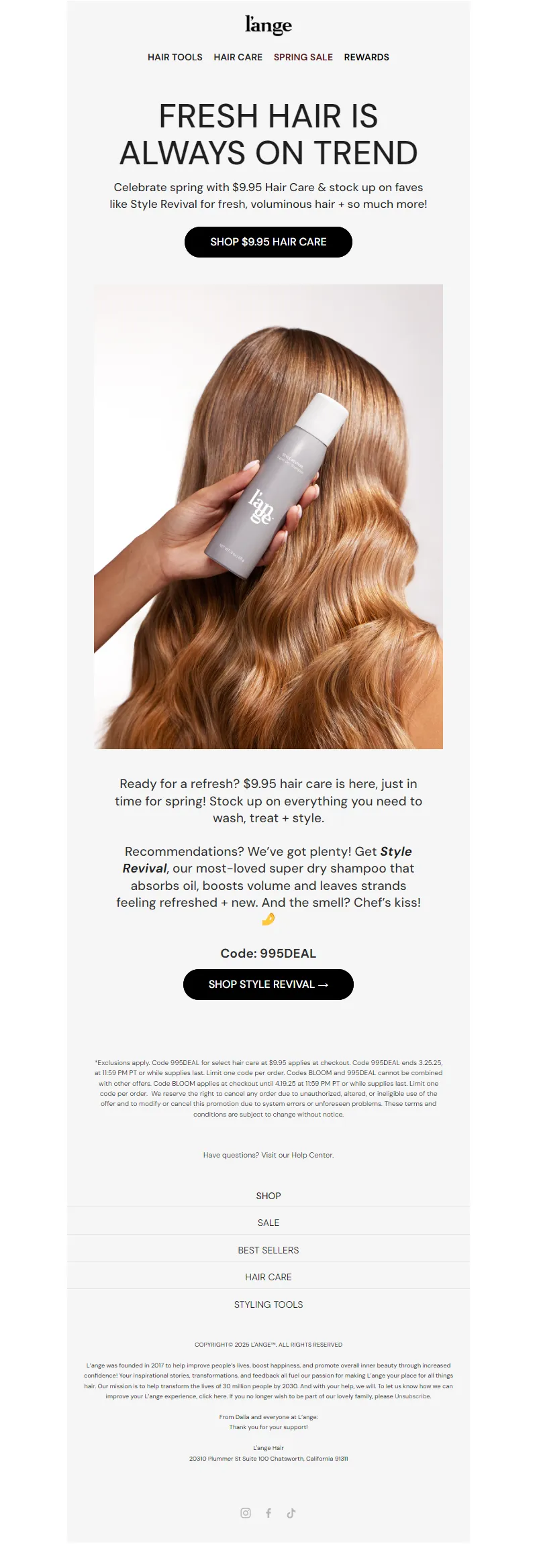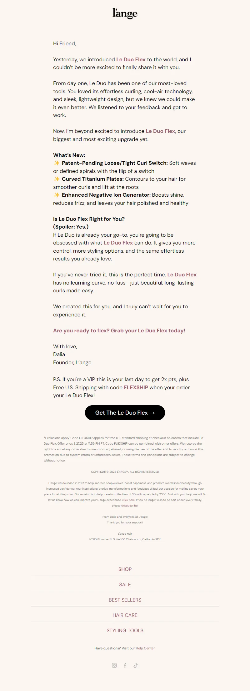 Explore campaign email examples from L'ange Hair, including promotions, newsletters, and product announcements. Built as a reference library for studying real ecommerce email execution.
