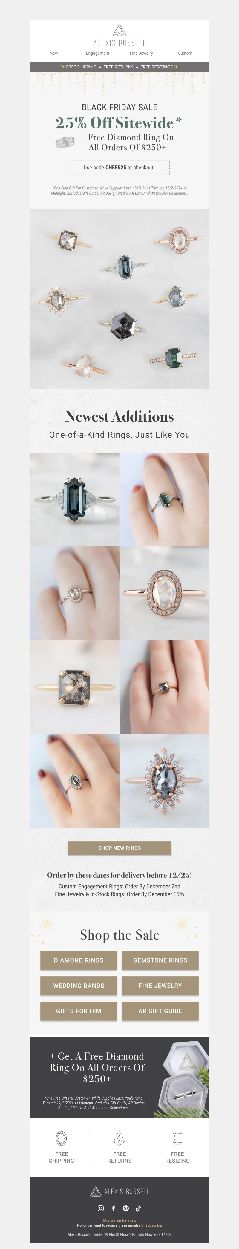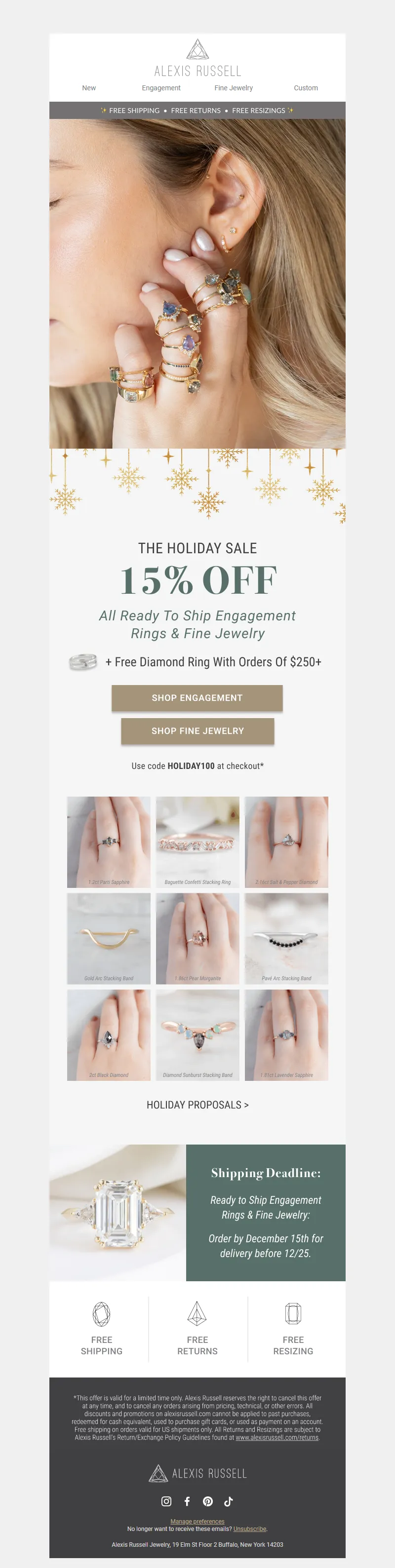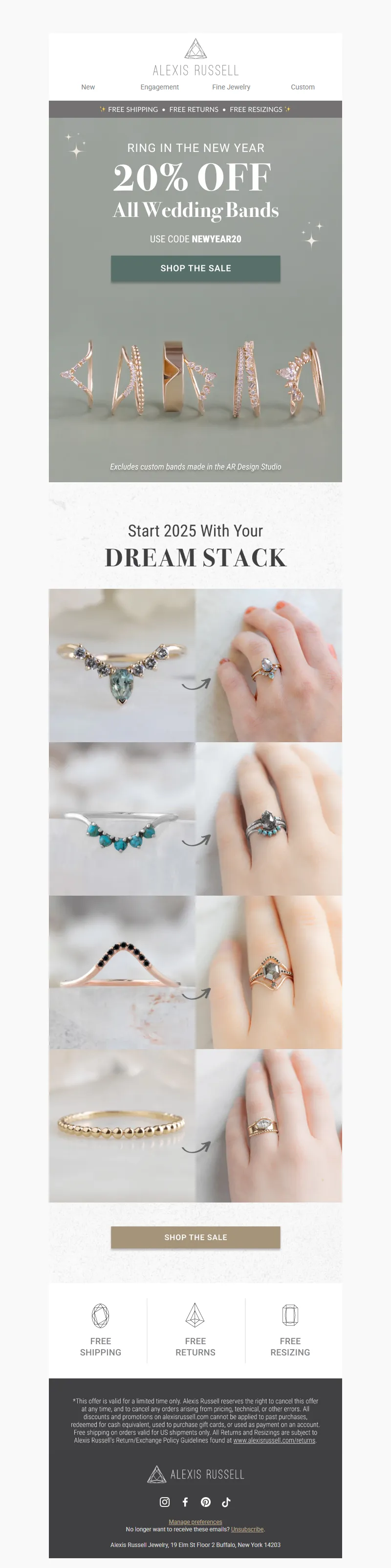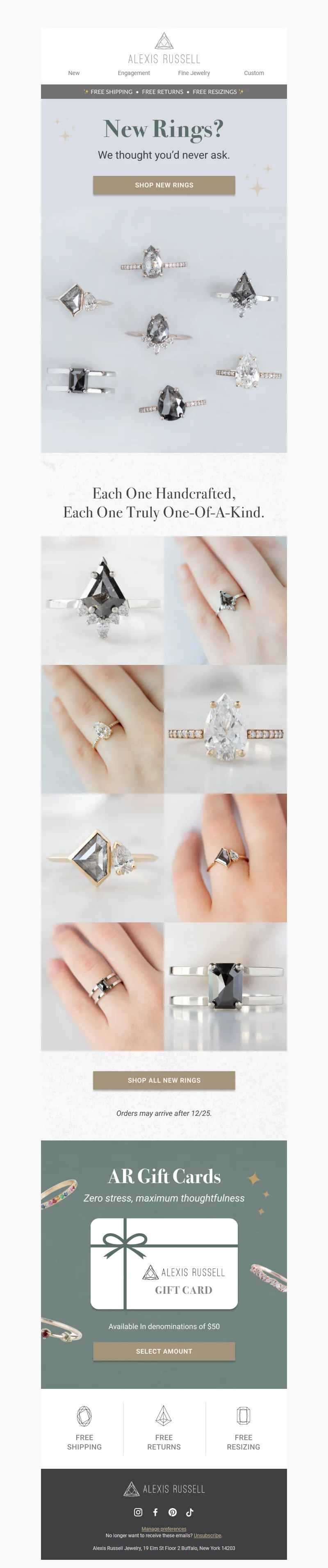 Explore campaign email examples from Alexis Russell Jewelry, including promotions, newsletters, and product announcements. Built as a reference library for studying real ecommerce email execution.