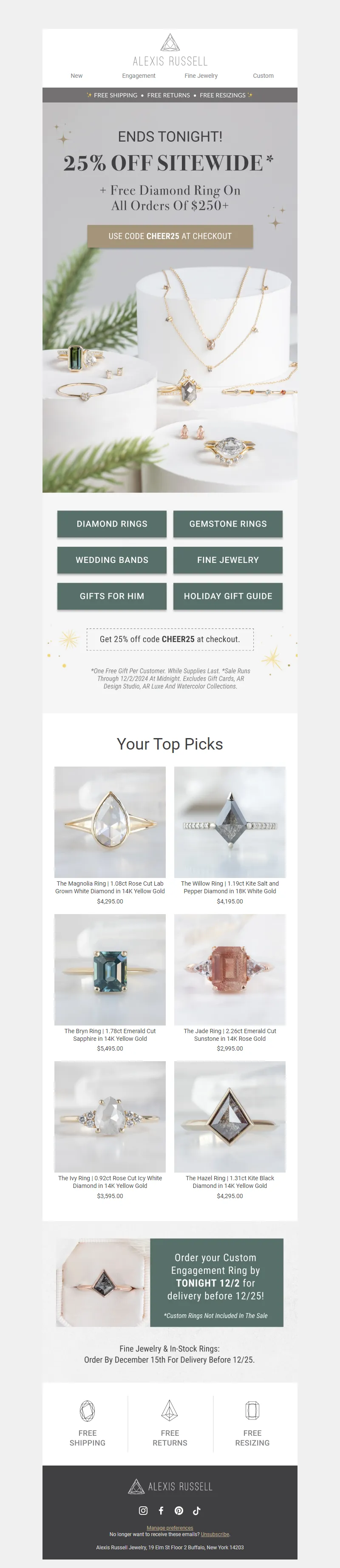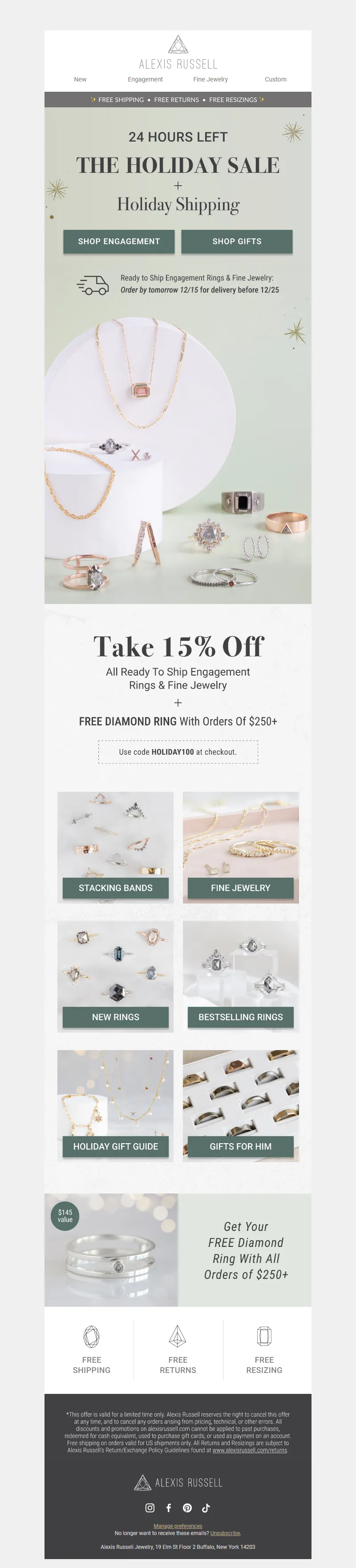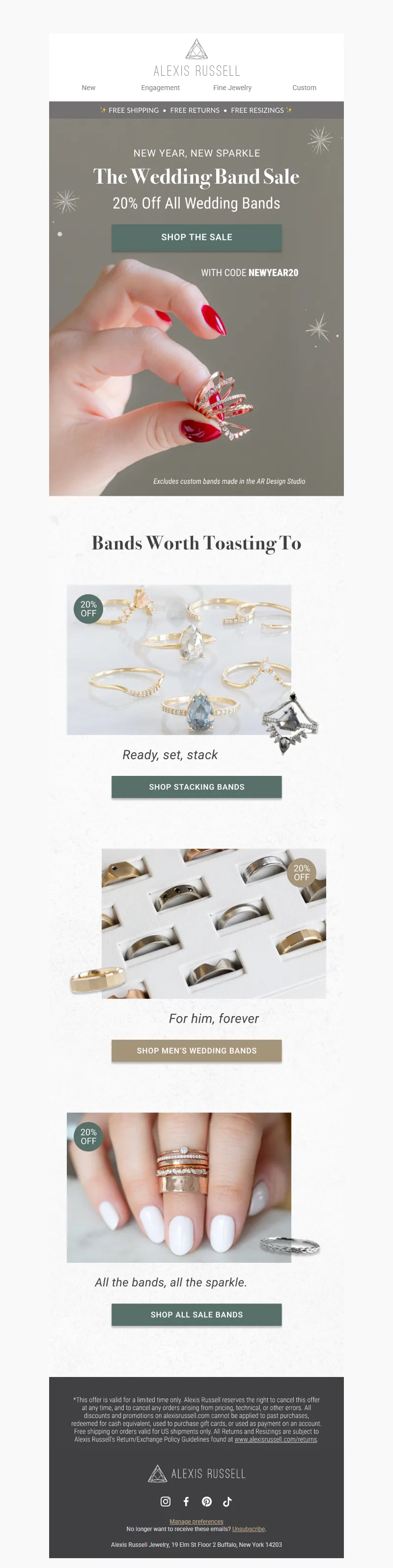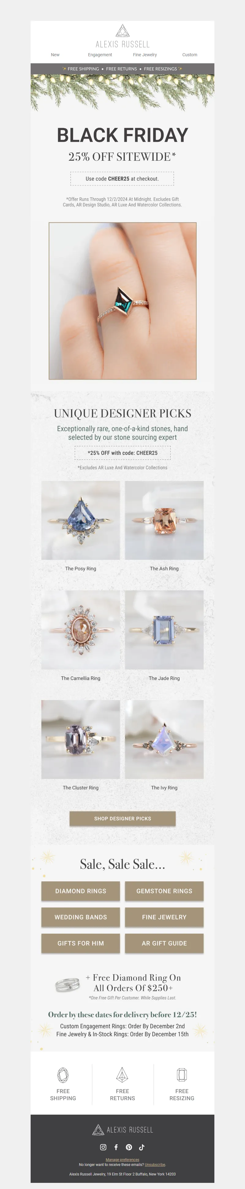 Explore campaign email examples from Alexis Russell Jewelry, including promotions, newsletters, and product announcements. Built as a reference library for studying real ecommerce email execution.