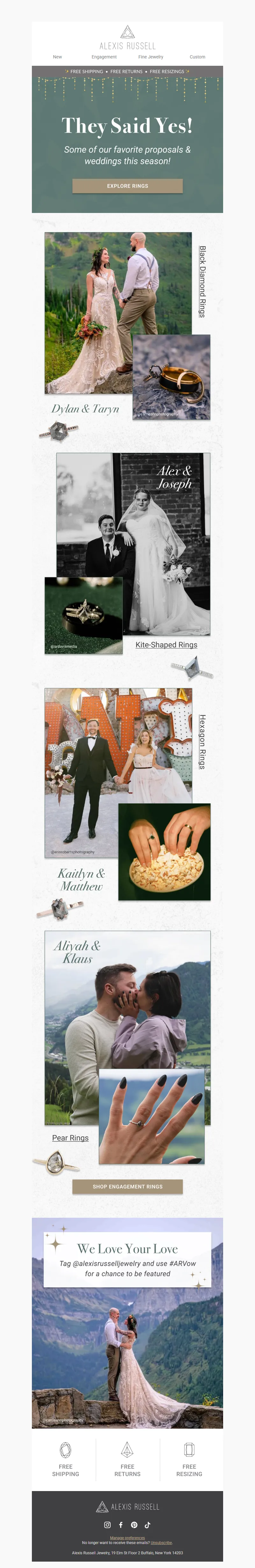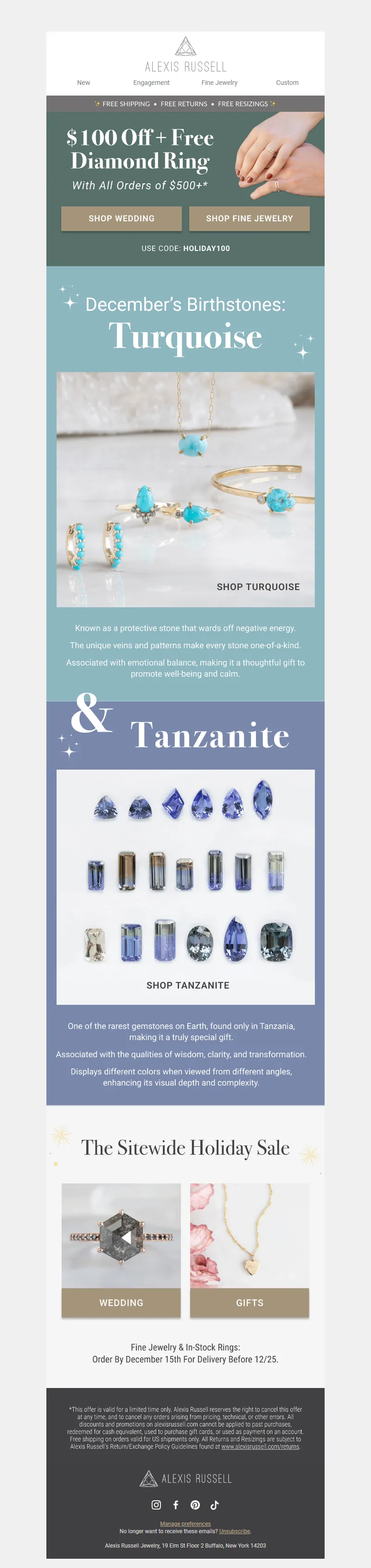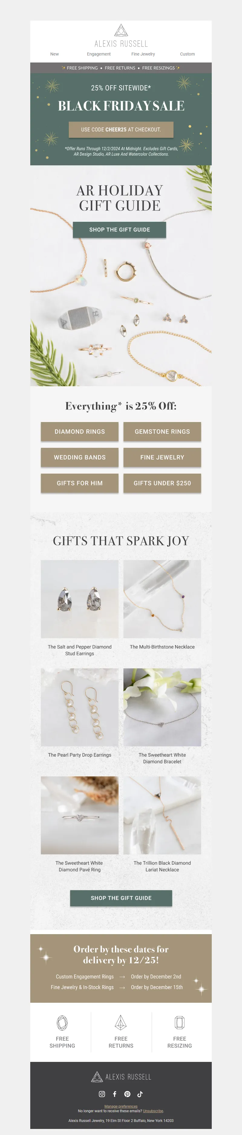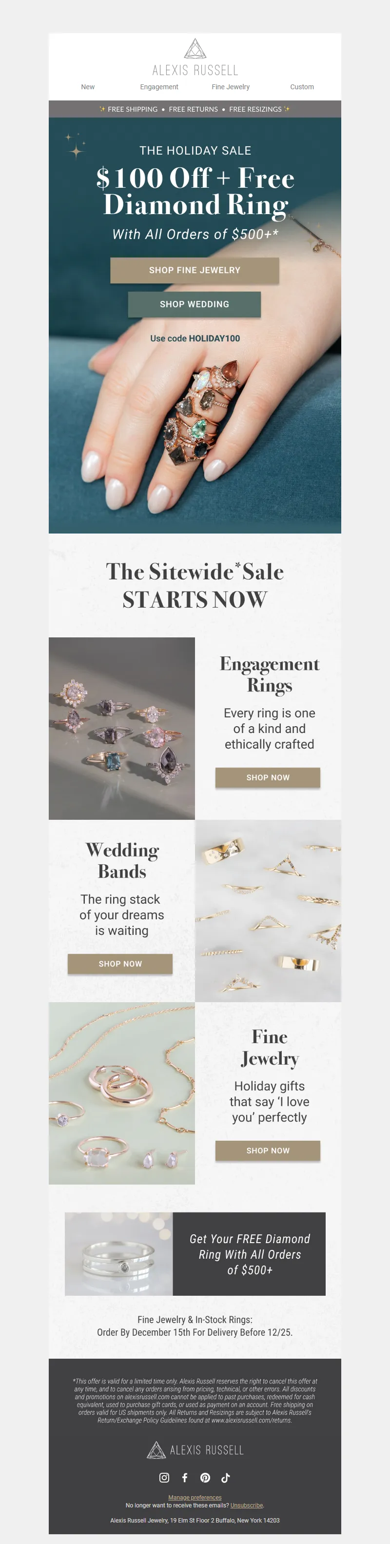 Explore campaign email examples from Alexis Russell Jewelry, including promotions, newsletters, and product announcements. Built as a reference library for studying real ecommerce email execution.