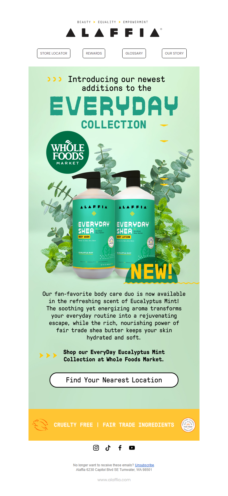 Explore campaign email examples from Alaffia, including promotions, newsletters, and product announcements. Built as a reference library for studying real ecommerce email execution.