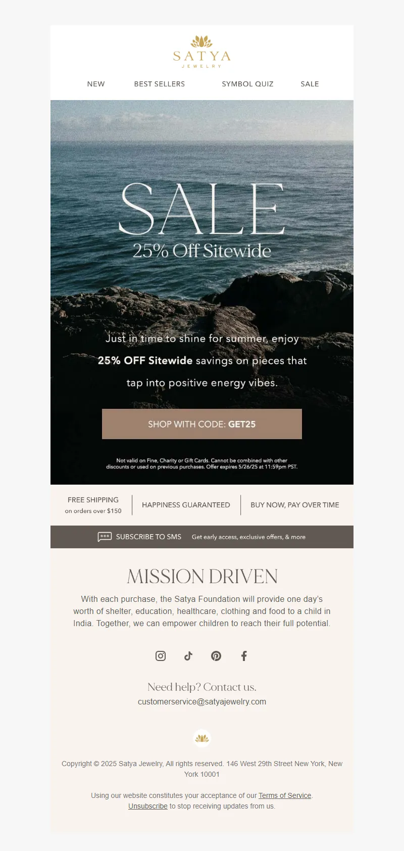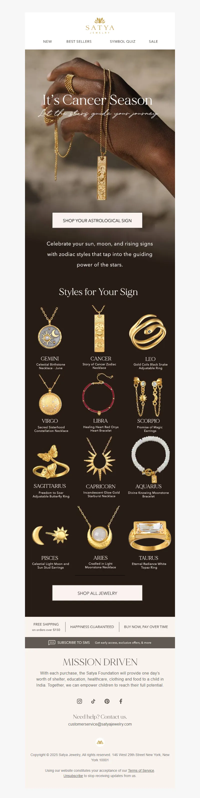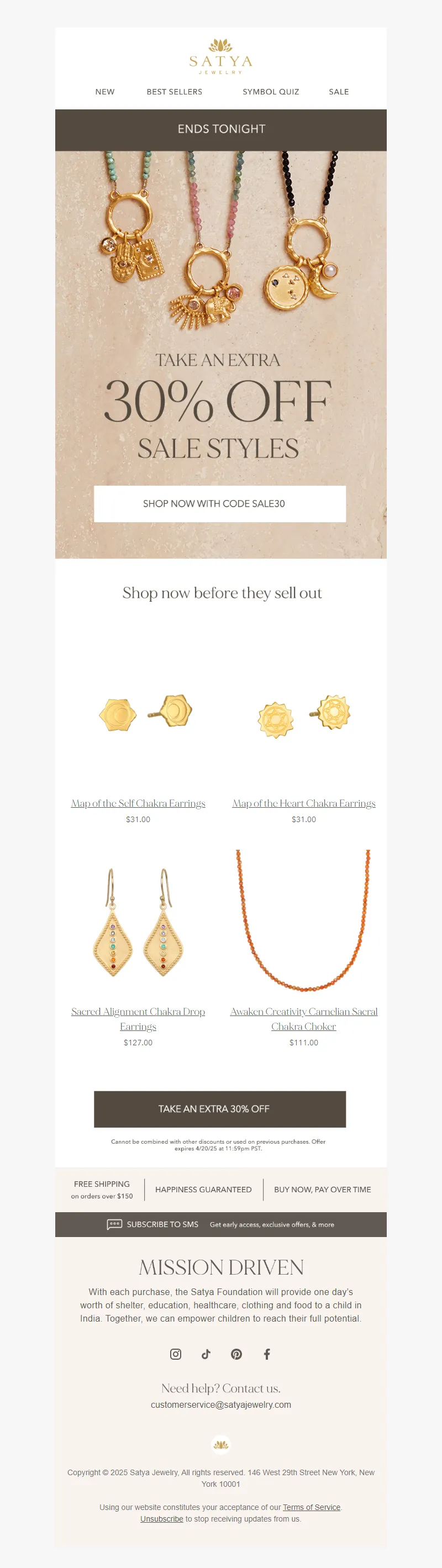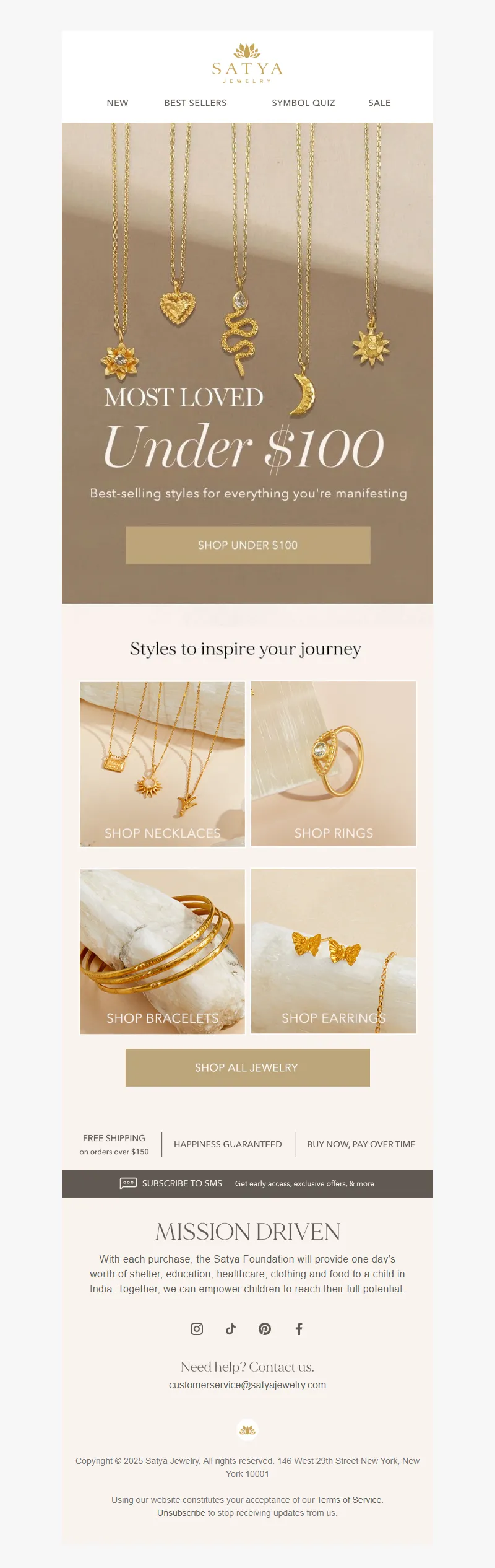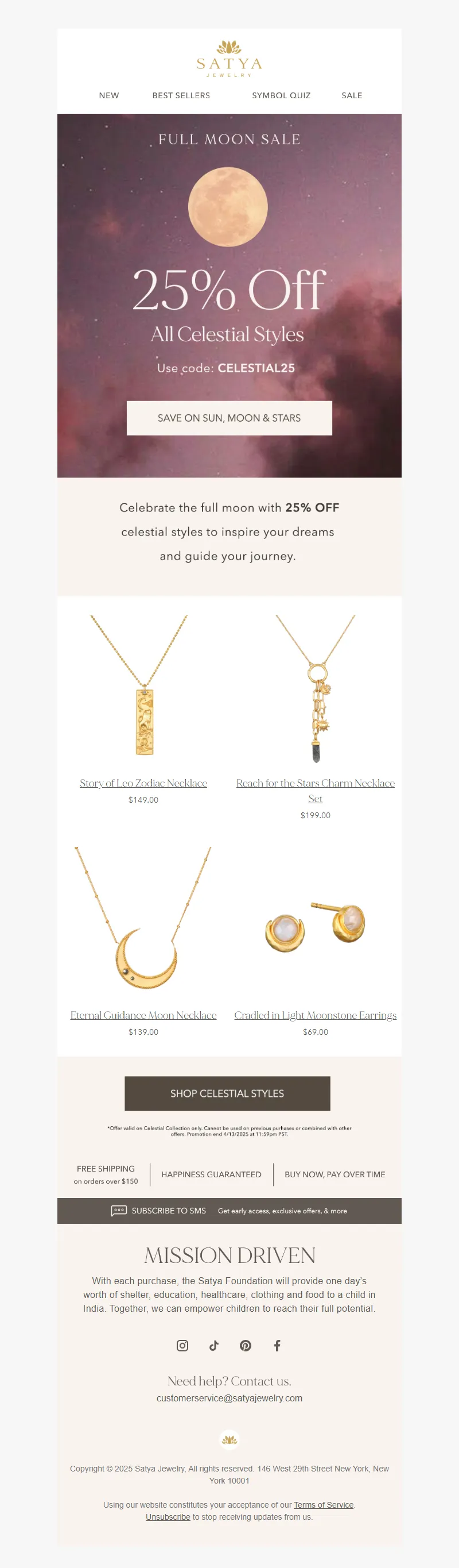Explore campaign email examples from Satya Jewelry, including promotions, newsletters, and product announcements. Built as a reference library for studying real ecommerce email execution.