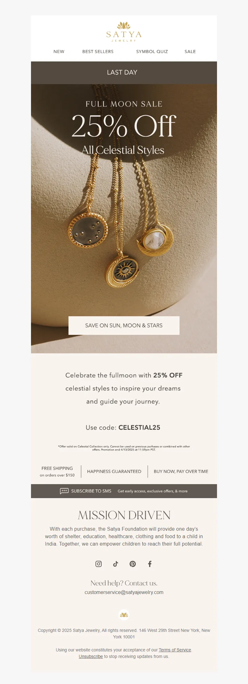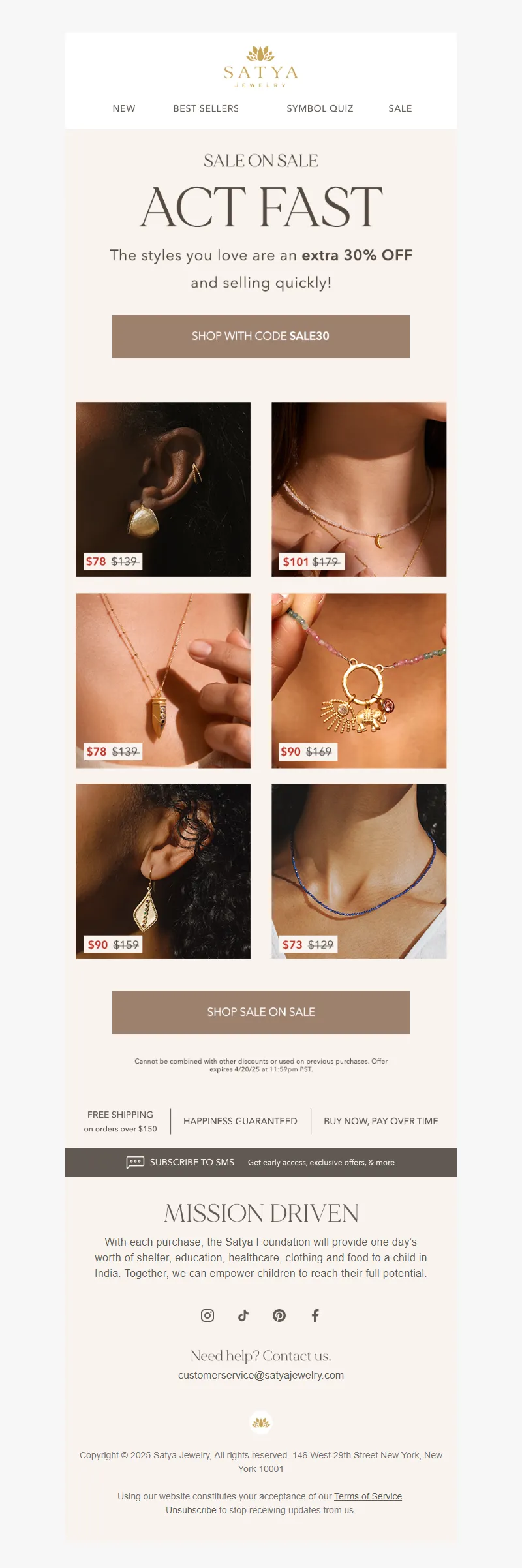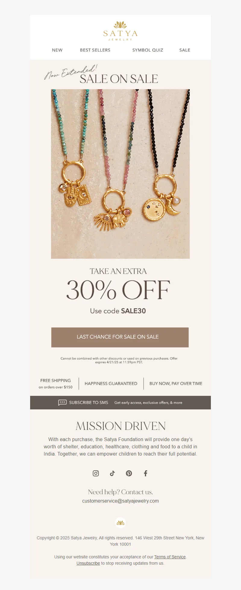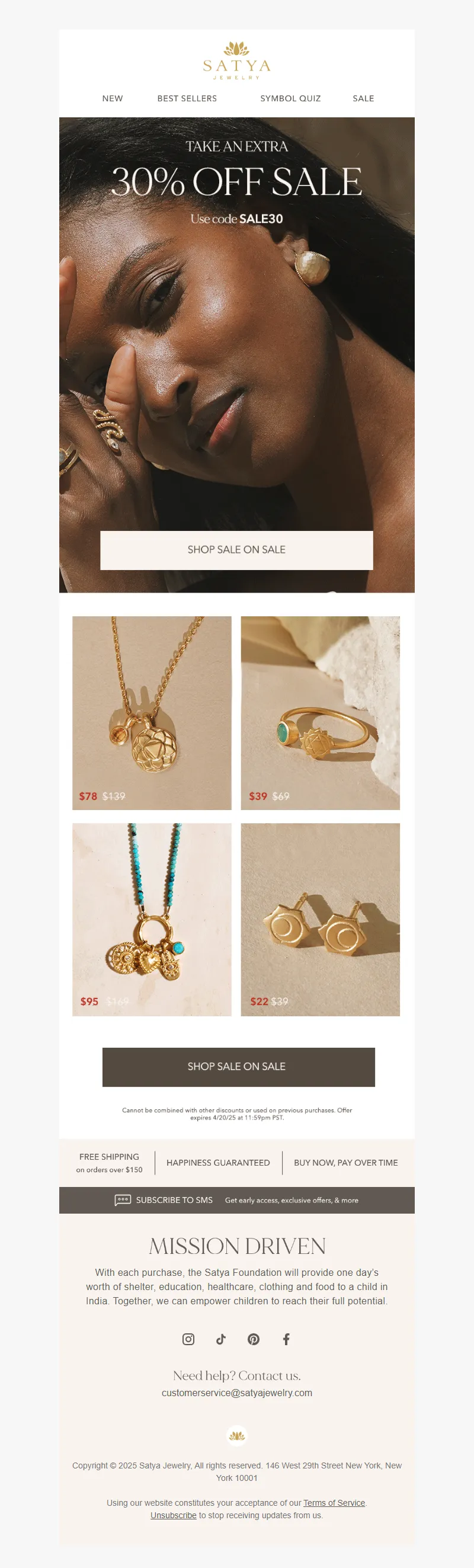Explore campaign email examples from Satya Jewelry, including promotions, newsletters, and product announcements. Built as a reference library for studying real ecommerce email execution.
