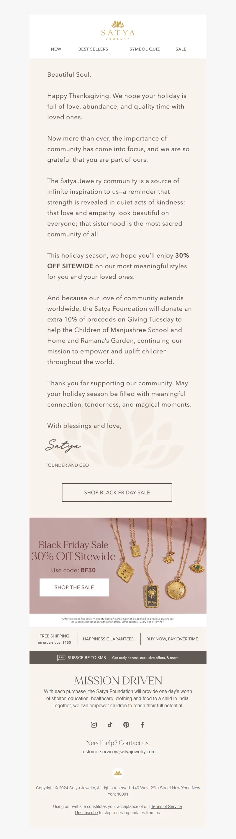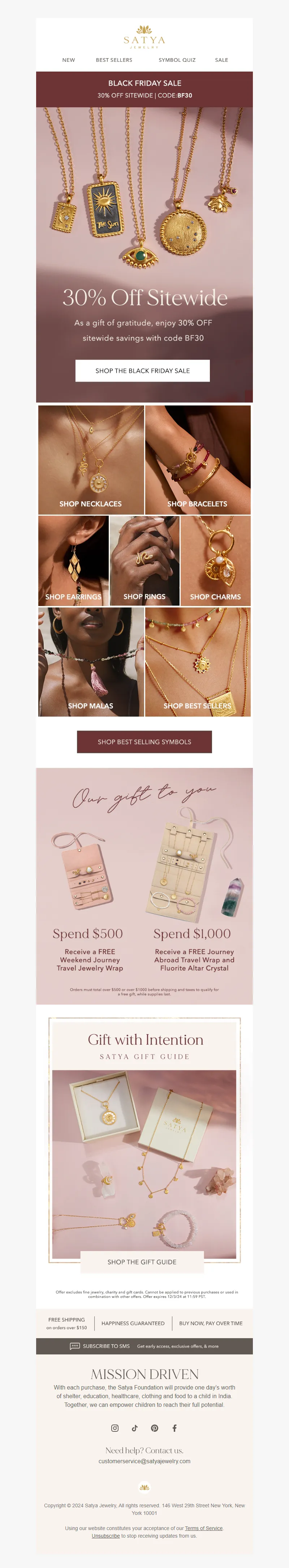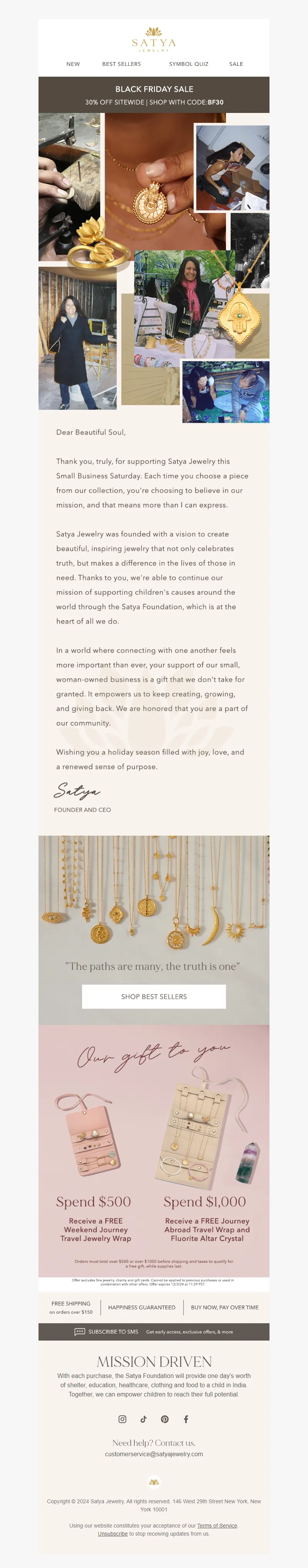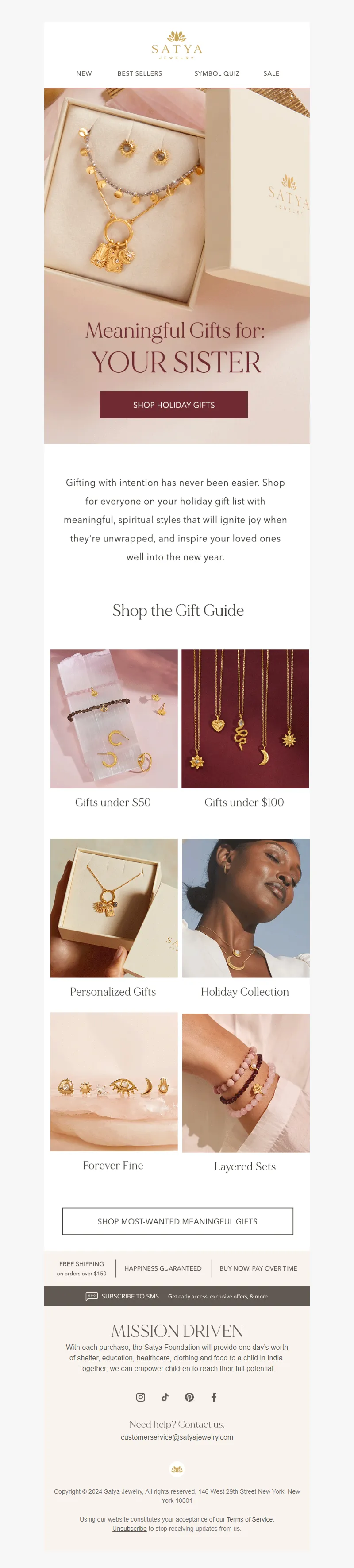 Explore campaign email examples from Satya Jewelry, including promotions, newsletters, and product announcements. Built as a reference library for studying real ecommerce email execution.