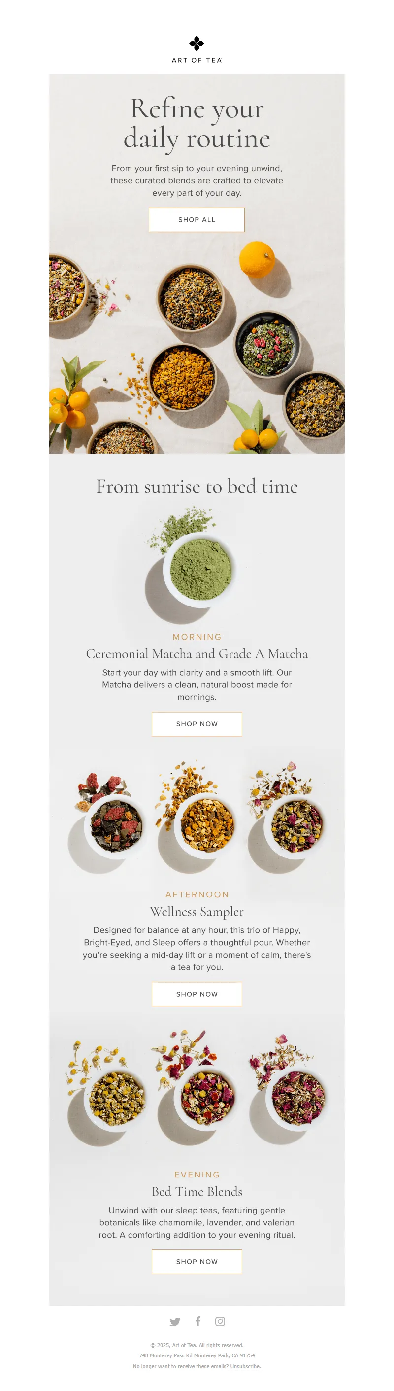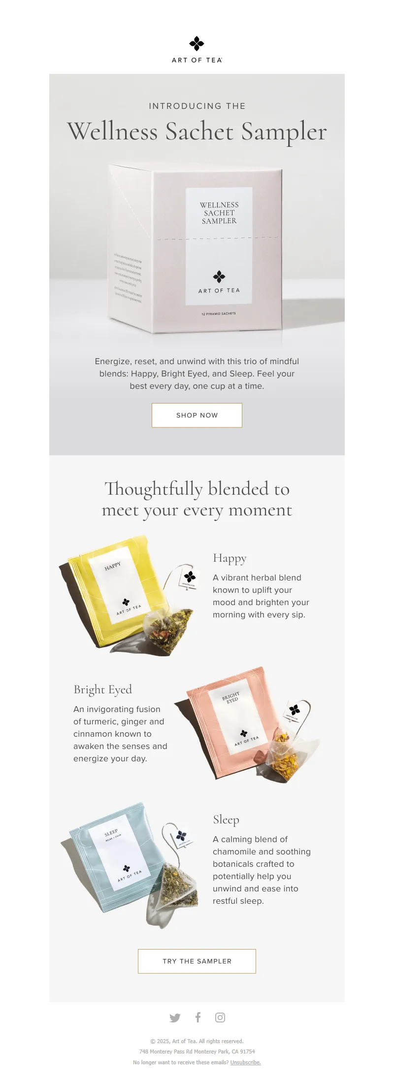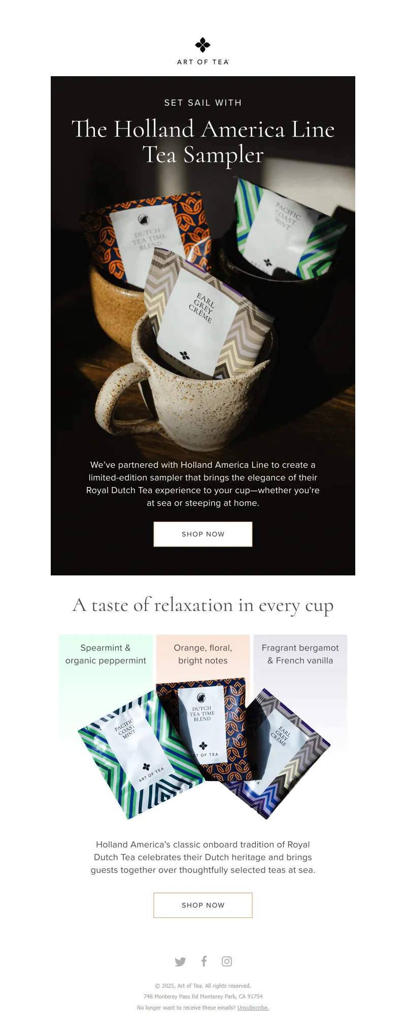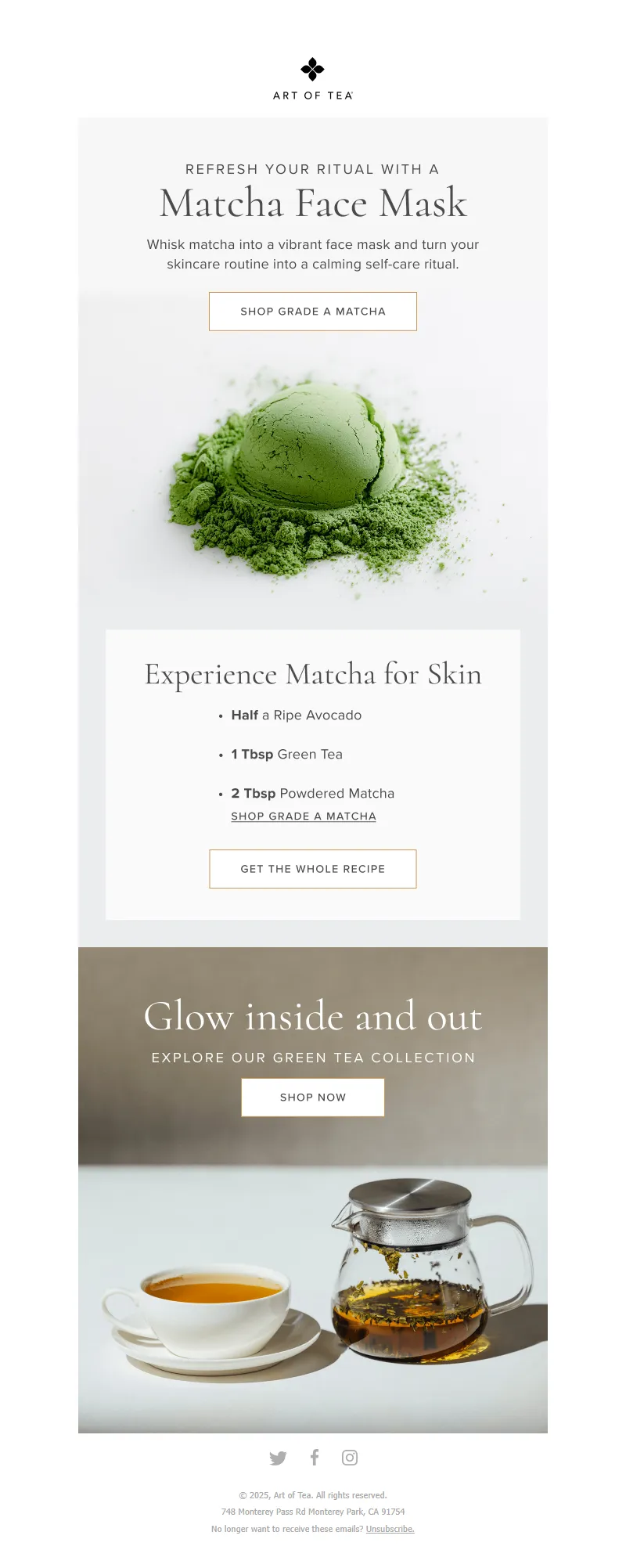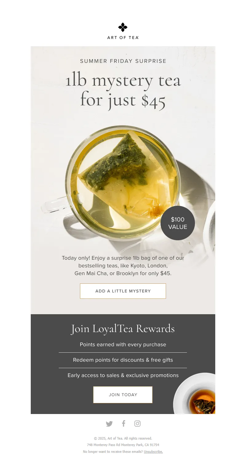 Explore campaign email examples from Art of Tea, including promotions, newsletters, and product announcements. Built as a reference library for studying real ecommerce email execution.