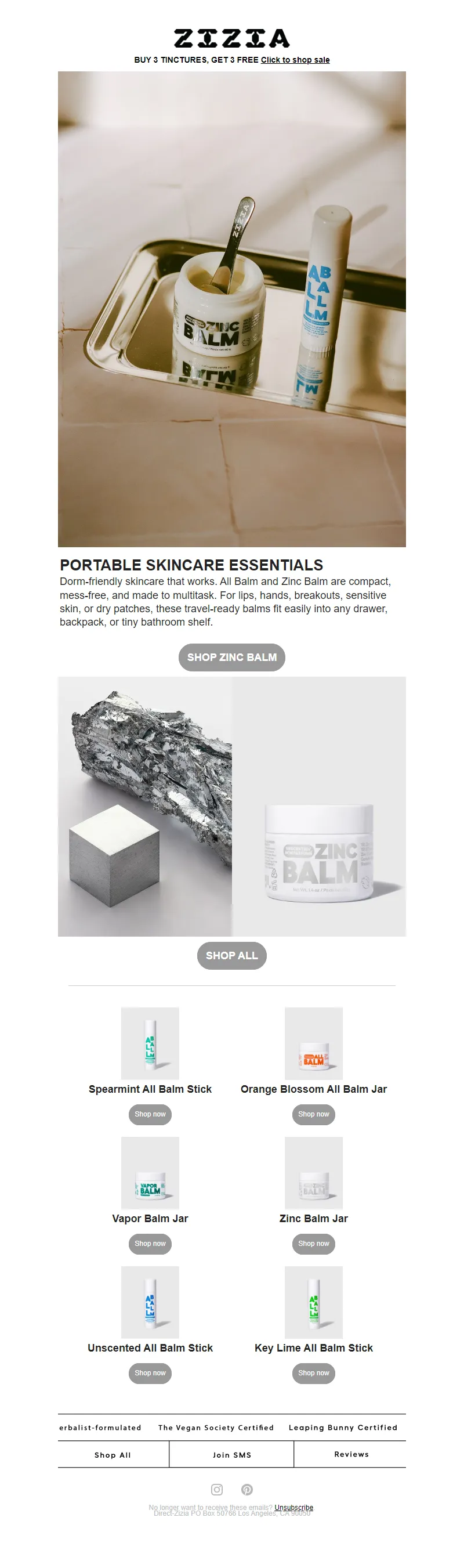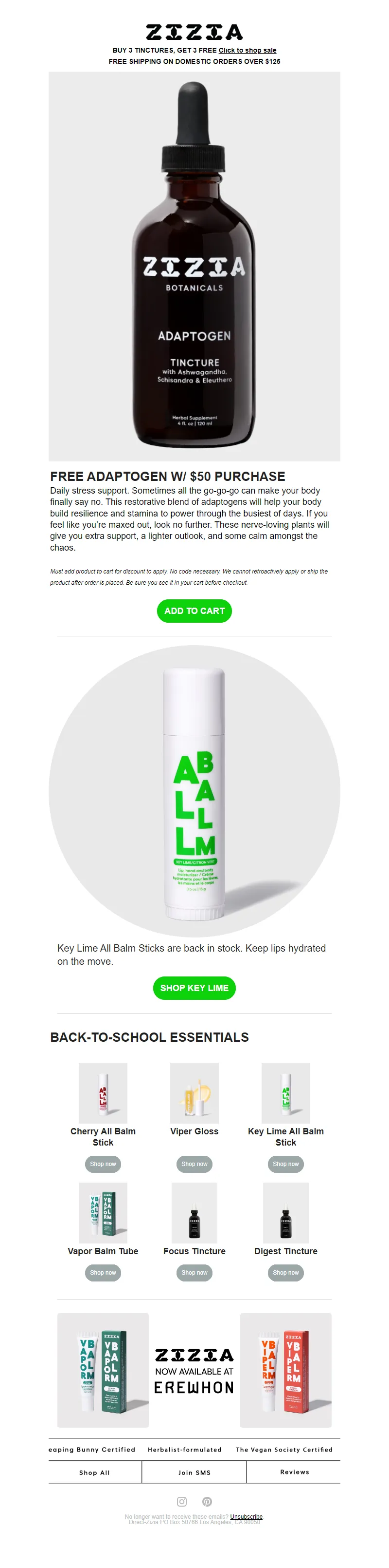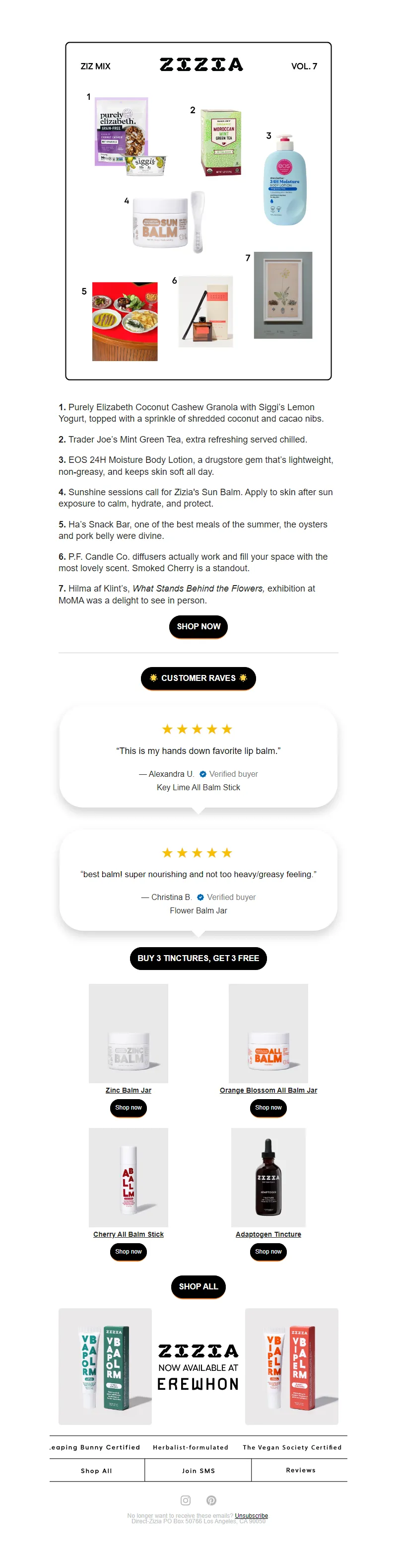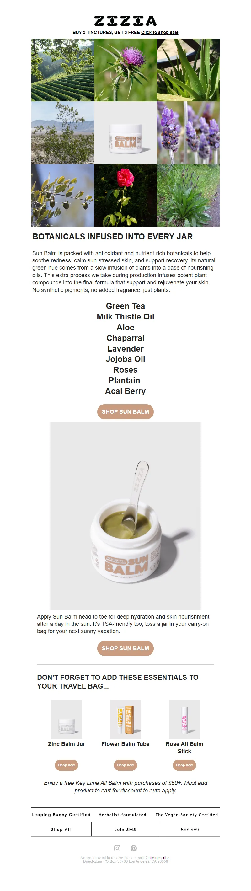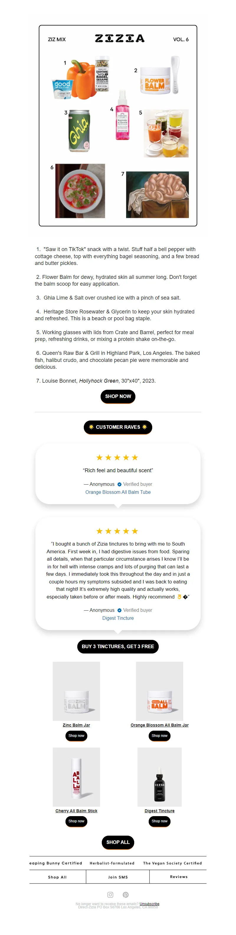 Explore campaign email examples from Zizia Botanicals, including promotions, newsletters, and product announcements. Built as a reference library for studying real ecommerce email execution.