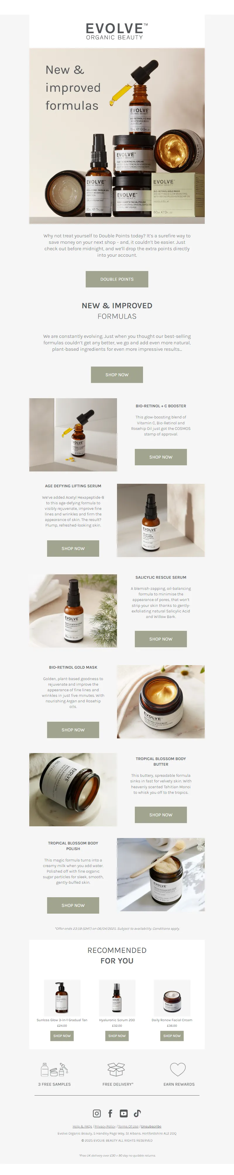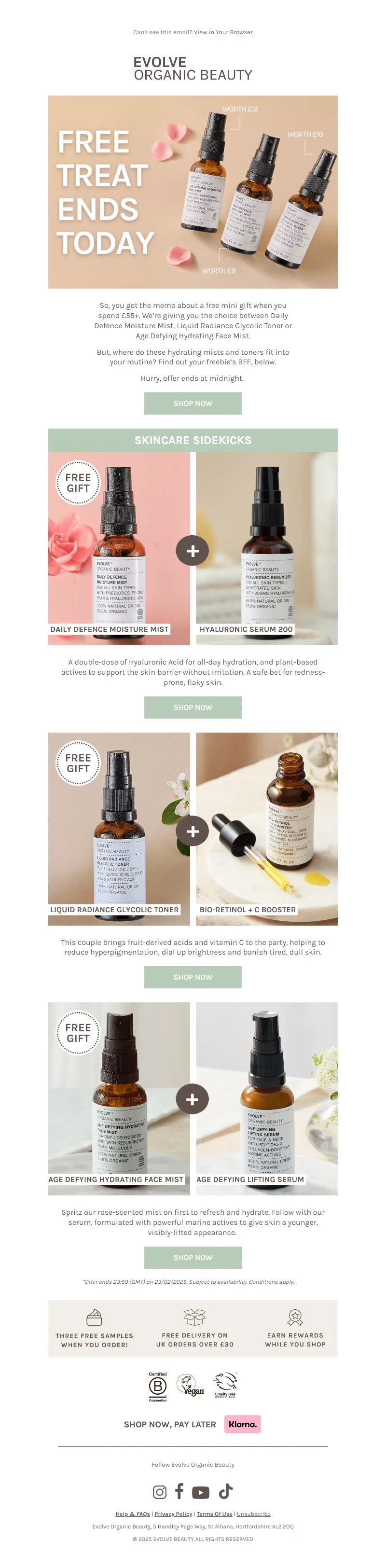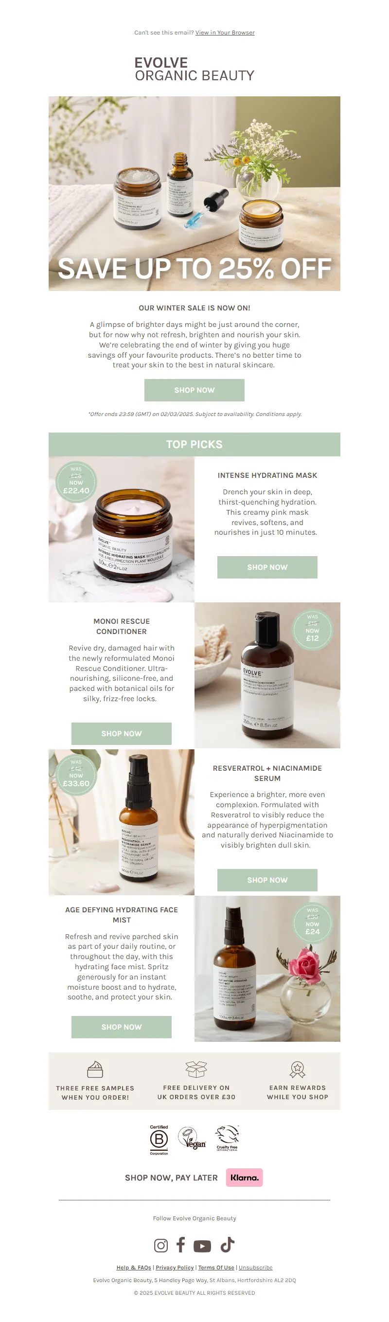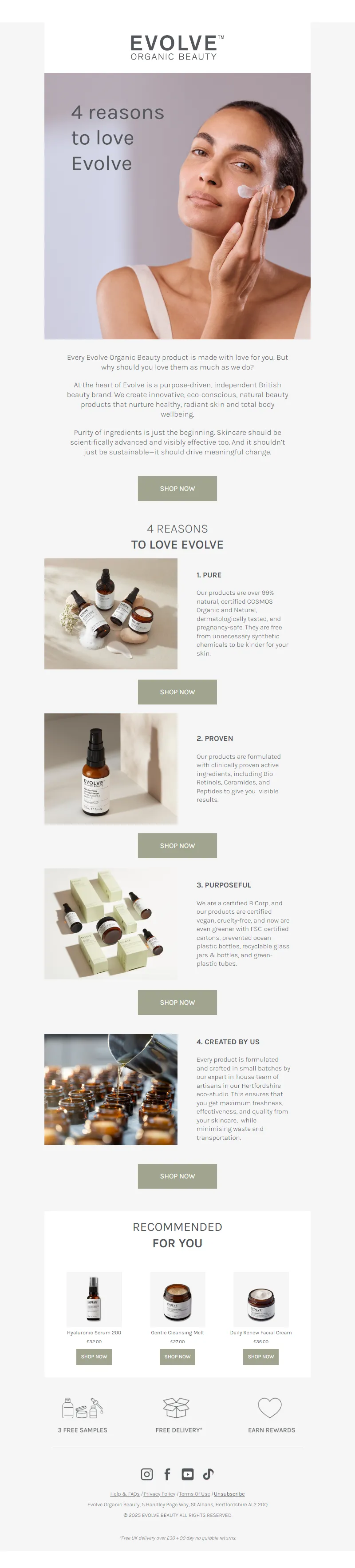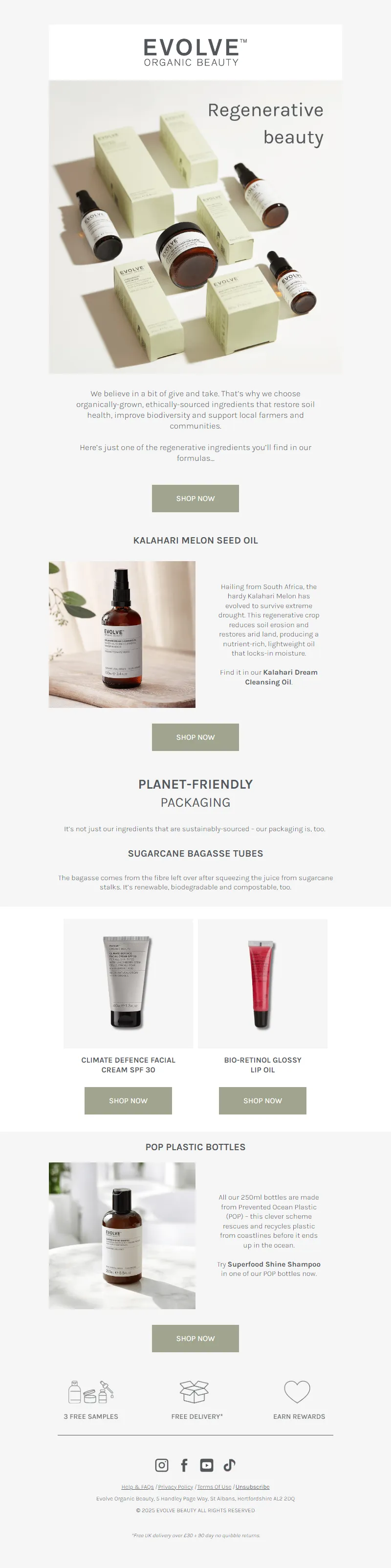 Explore campaign email examples from Evolve Organic Beauty, including promotions, newsletters, and product announcements. Built as a reference library for studying real ecommerce email execution.