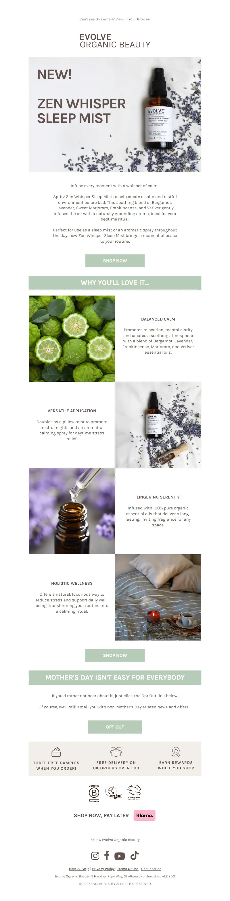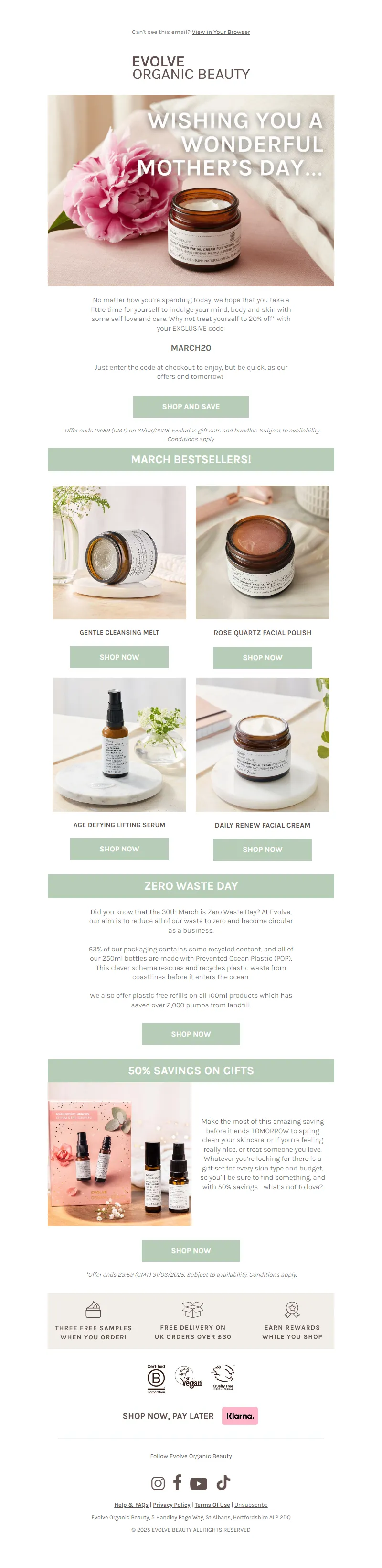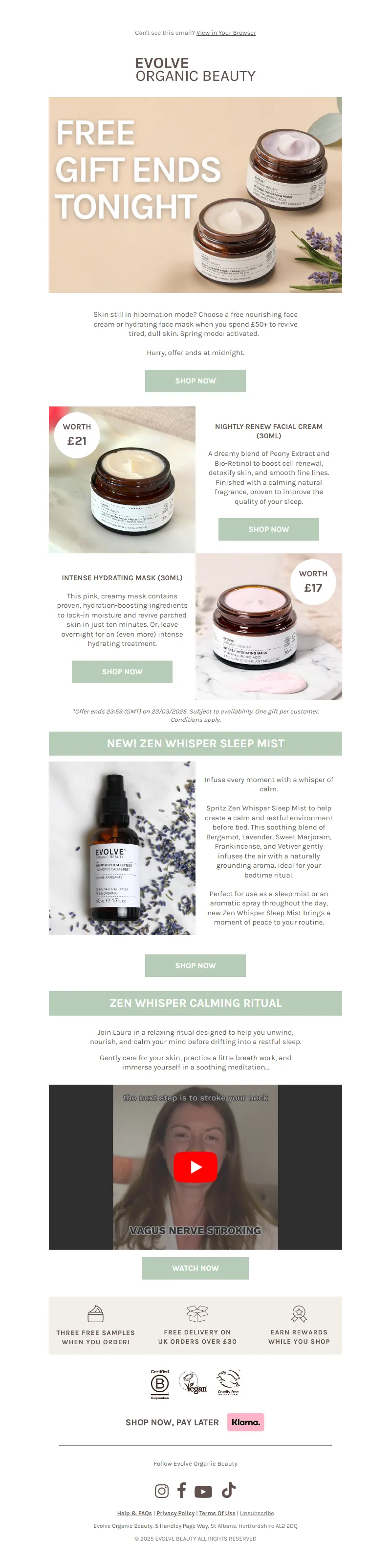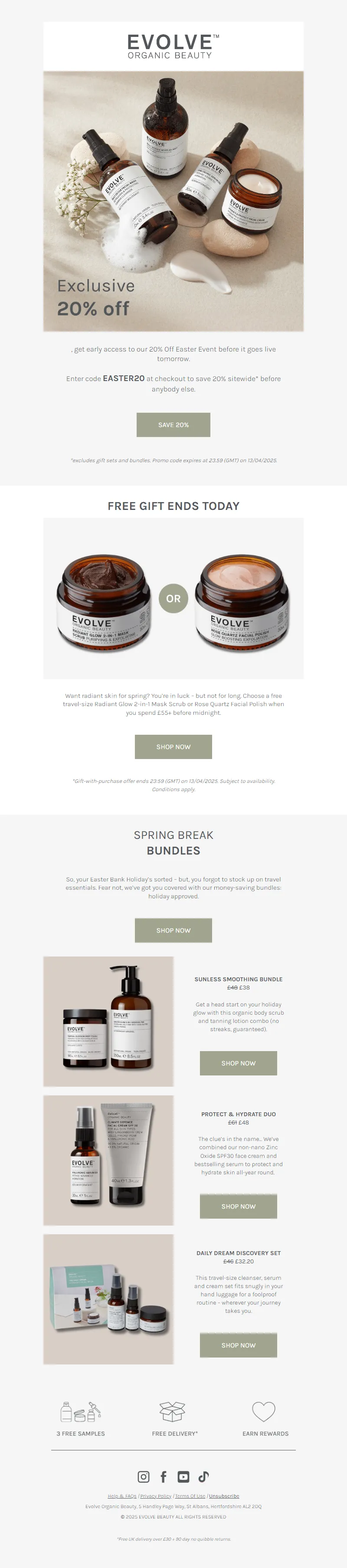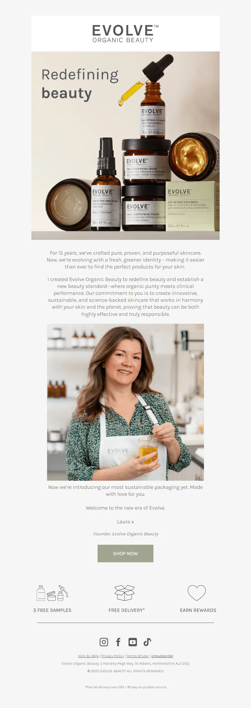 Explore campaign email examples from Evolve Organic Beauty, including promotions, newsletters, and product announcements. Built as a reference library for studying real ecommerce email execution.