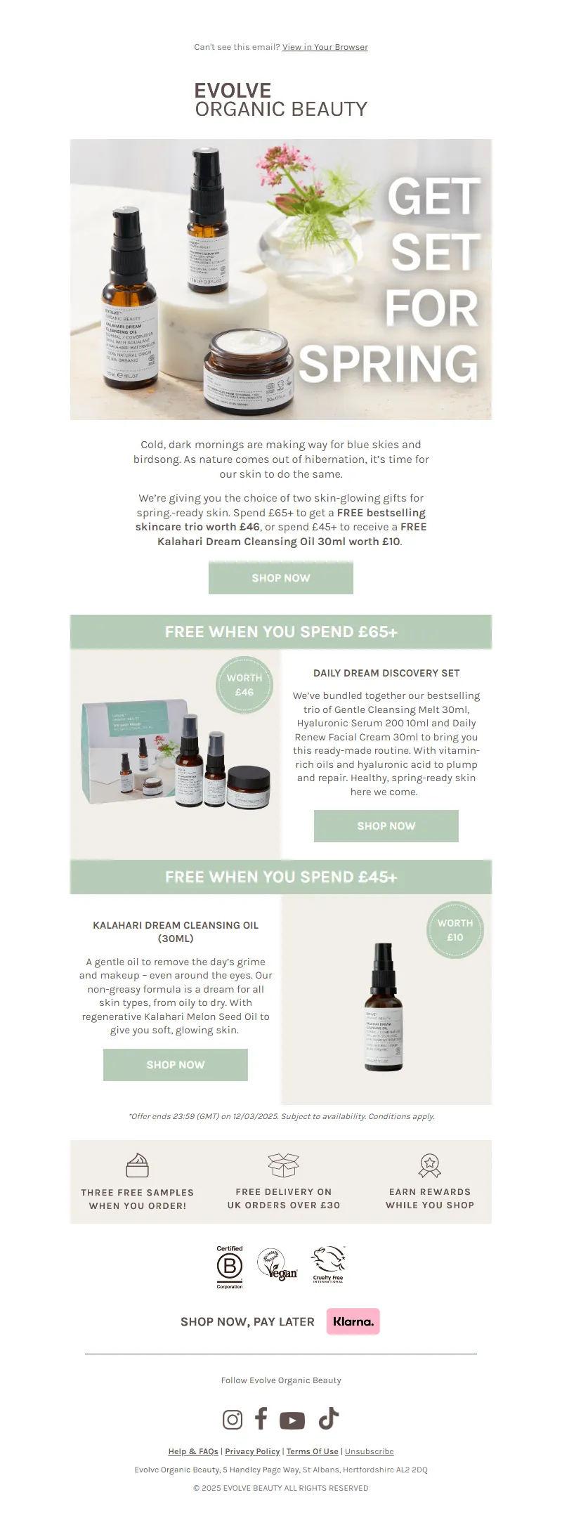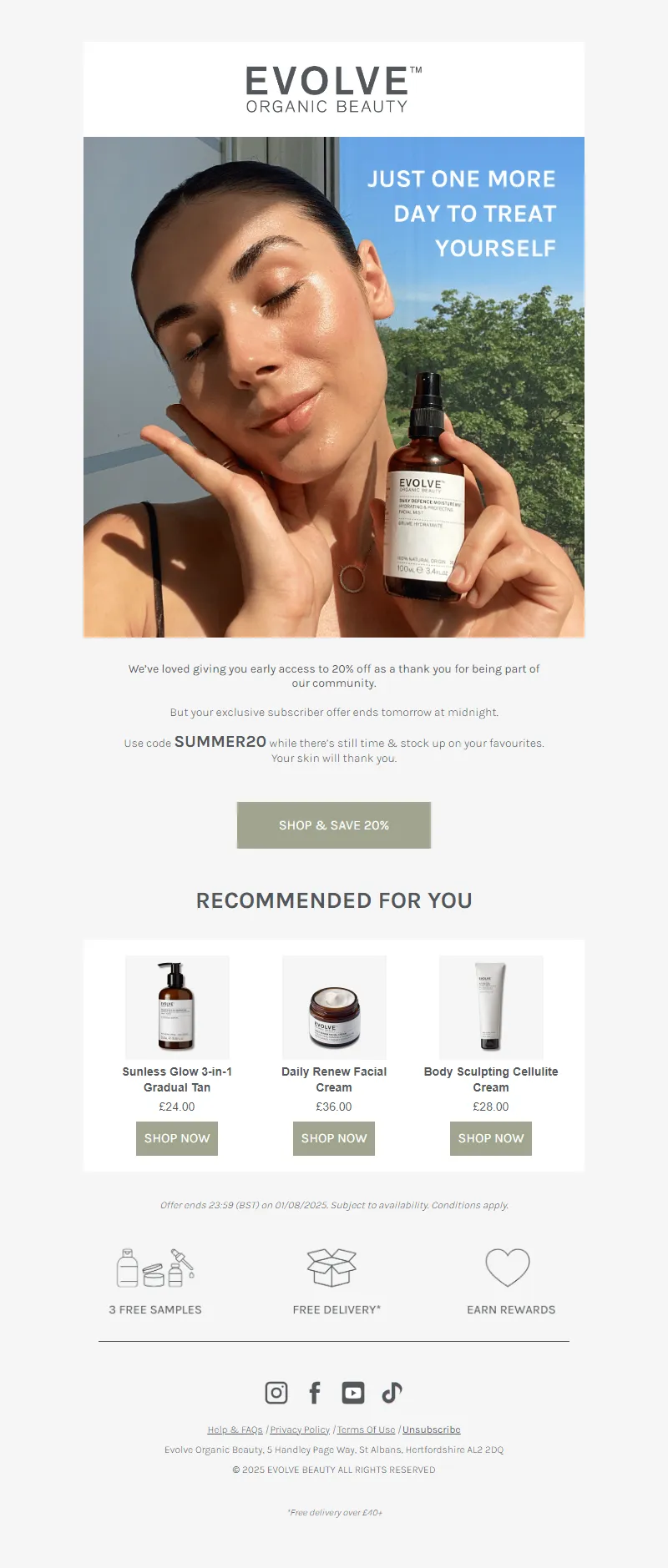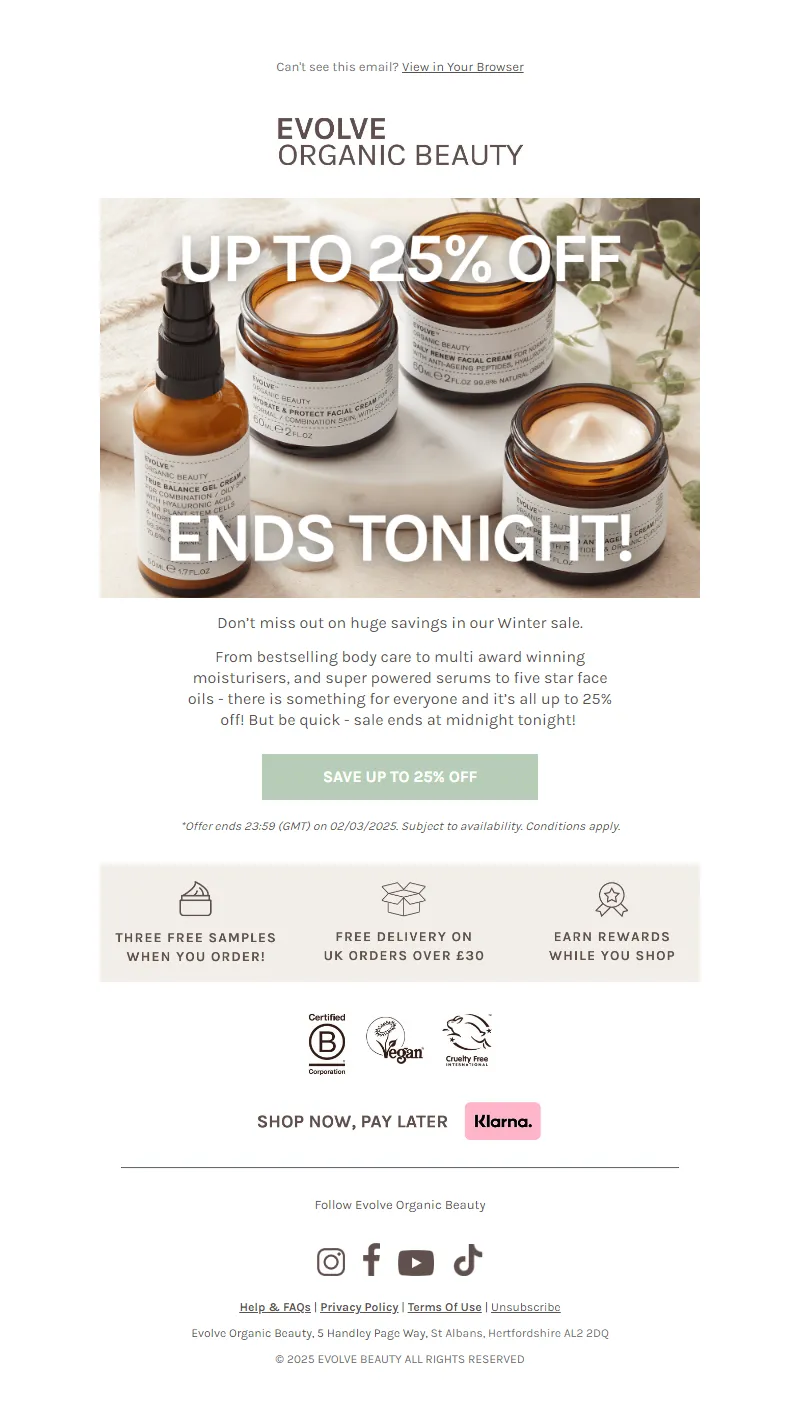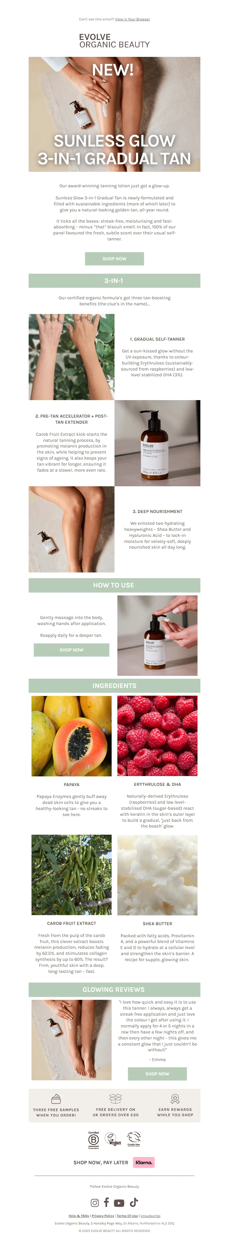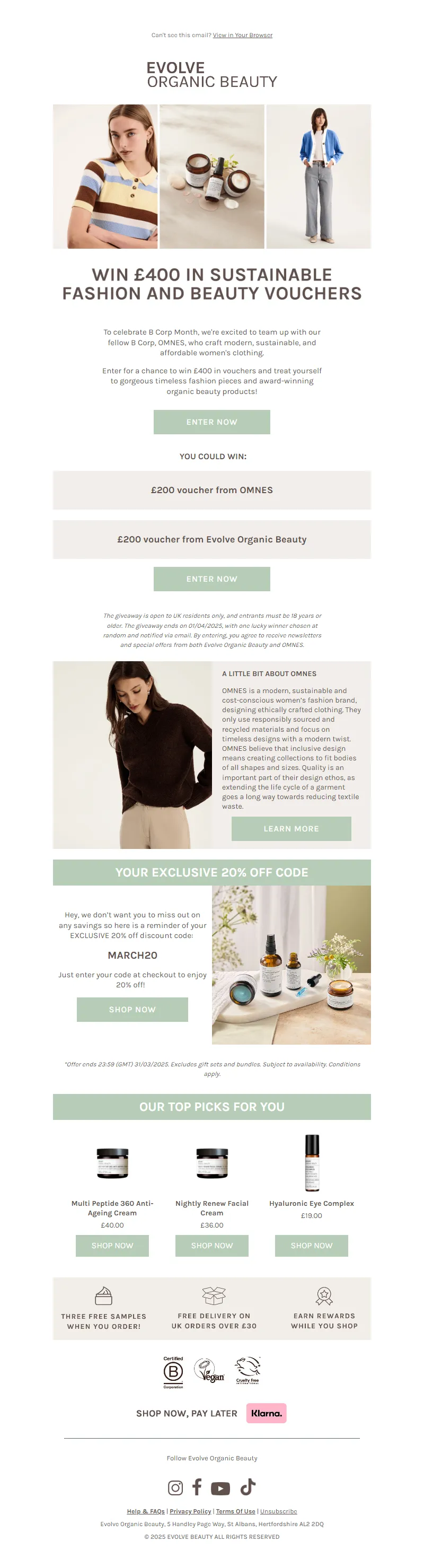 Explore campaign email examples from Evolve Organic Beauty, including promotions, newsletters, and product announcements. Built as a reference library for studying real ecommerce email execution.