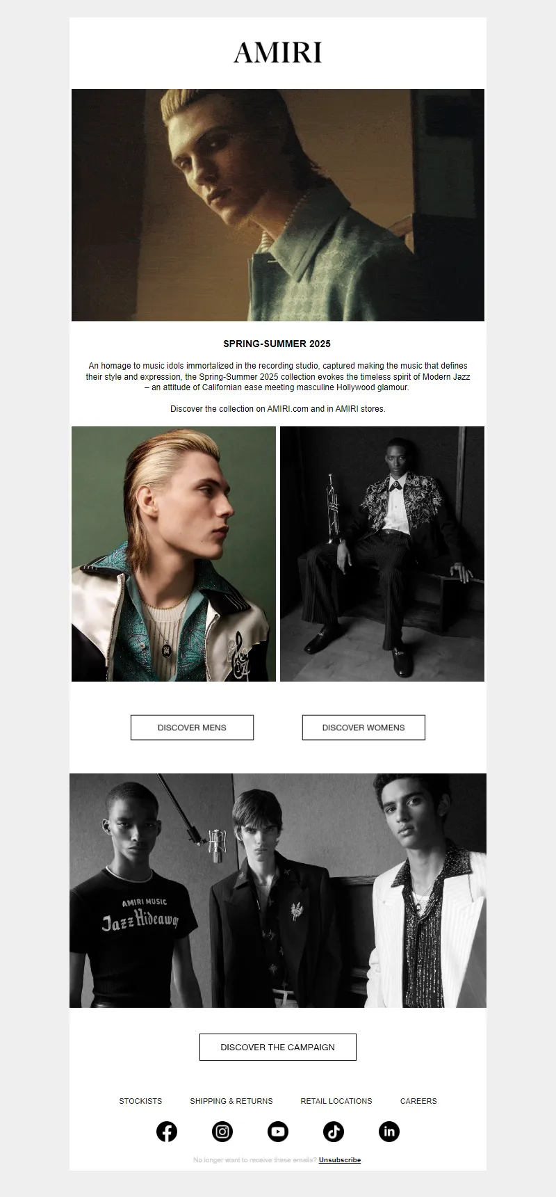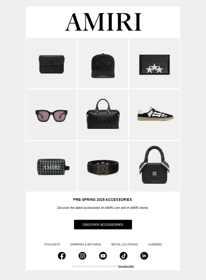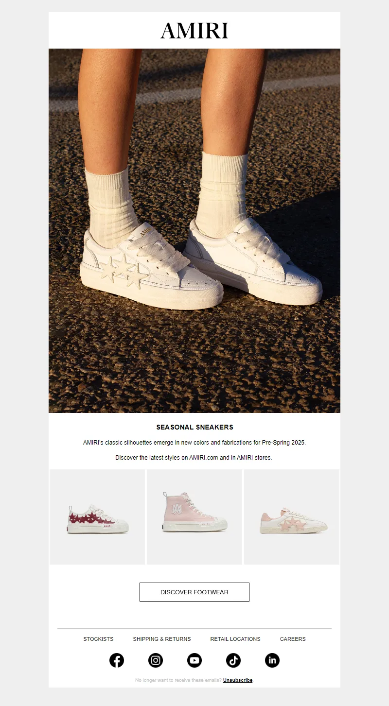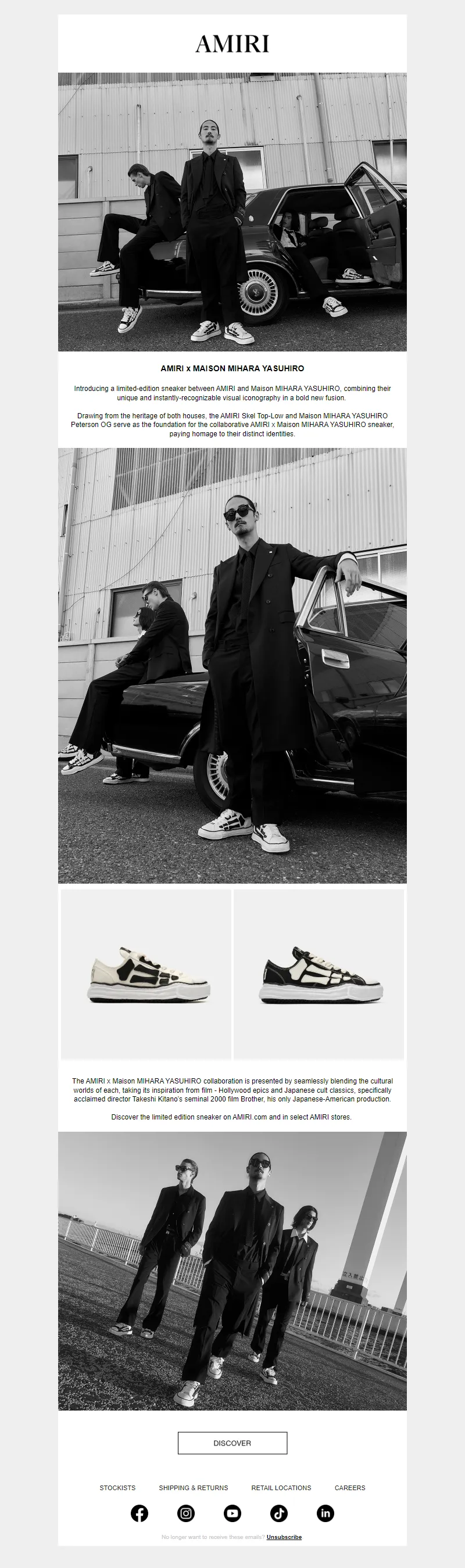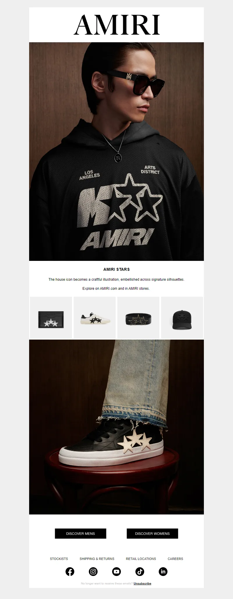 Explore campaign email examples from AMIRI, including promotions, newsletters, and product announcements. Built as a reference library for studying real ecommerce email execution.