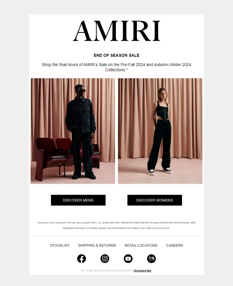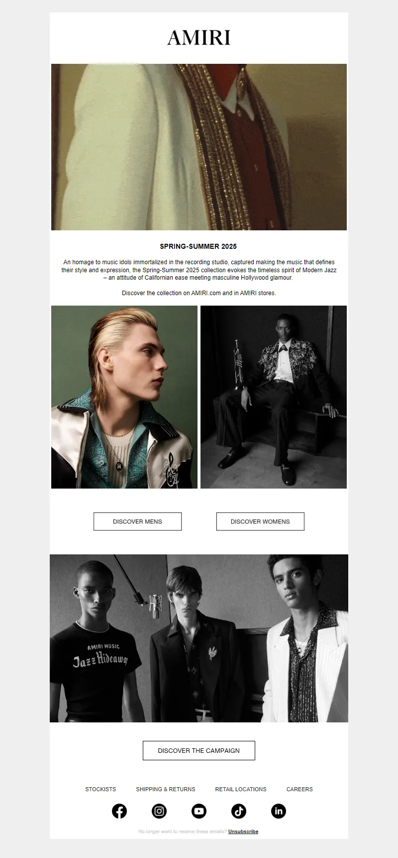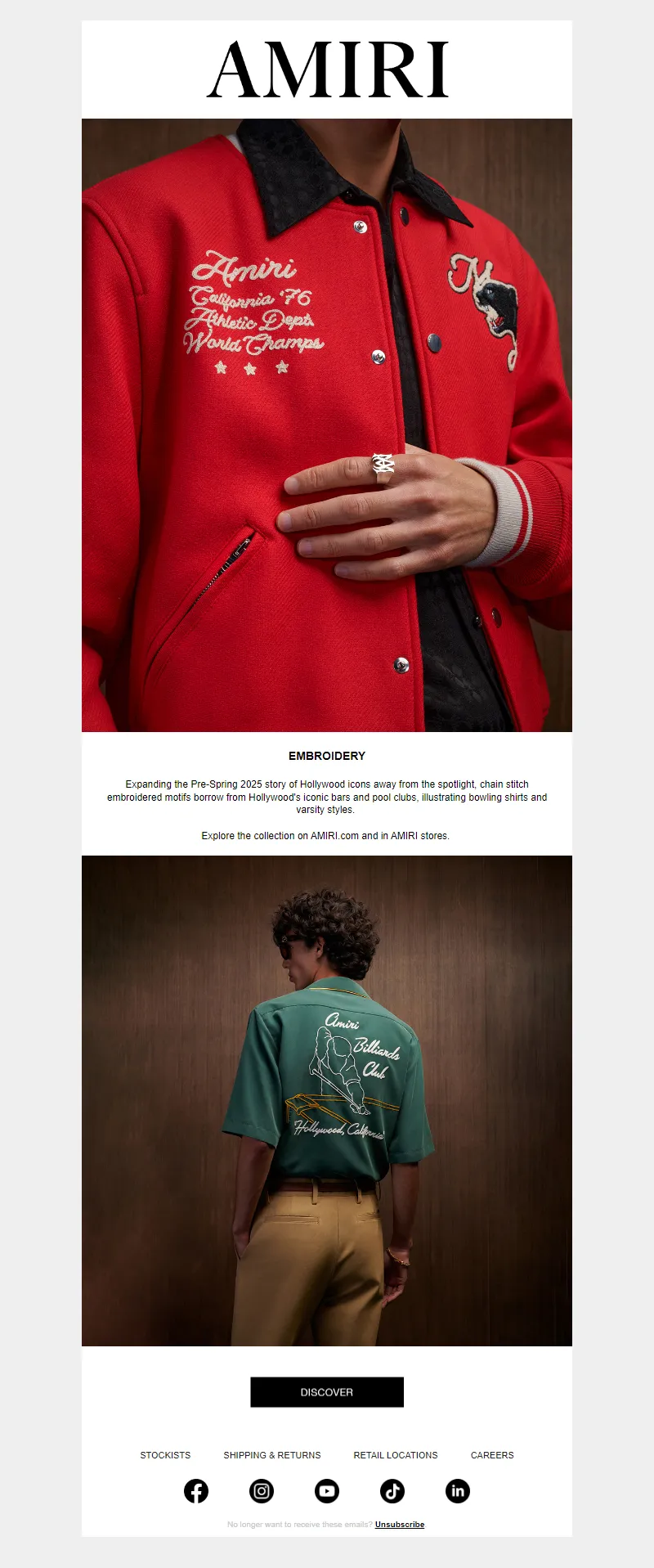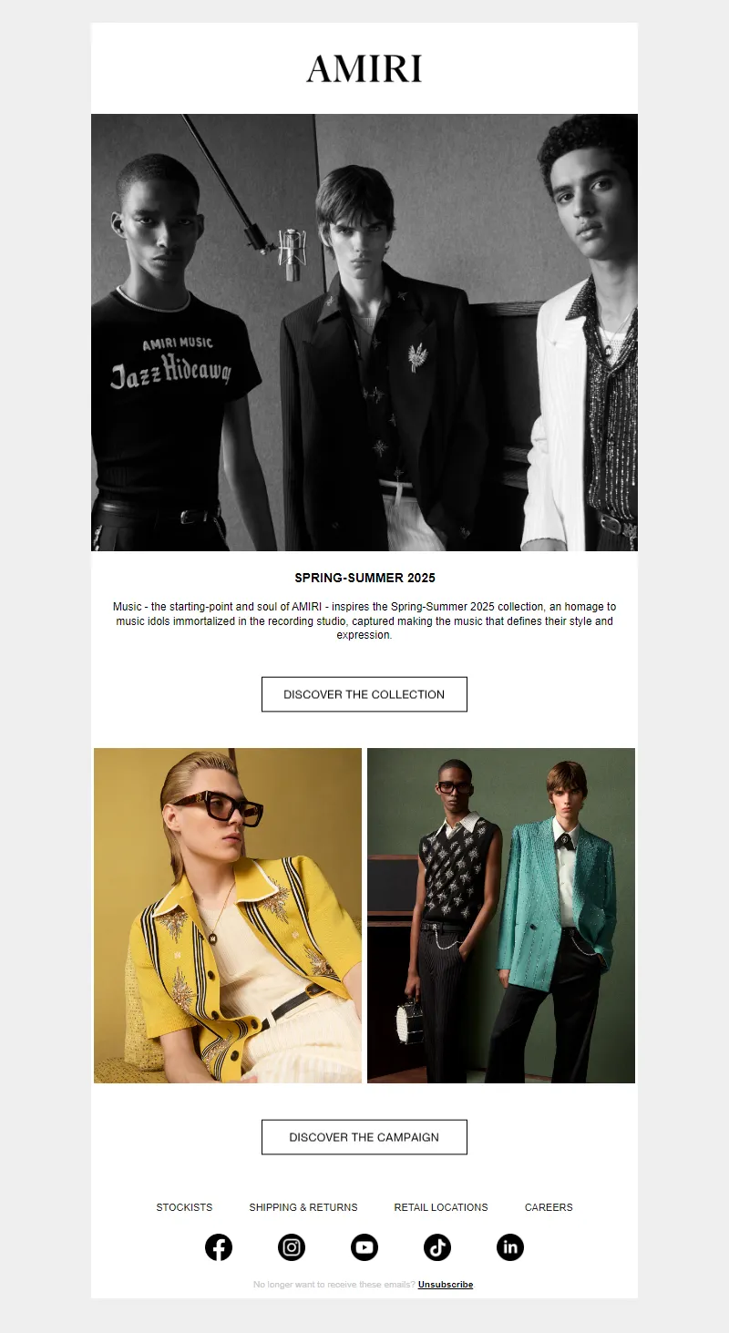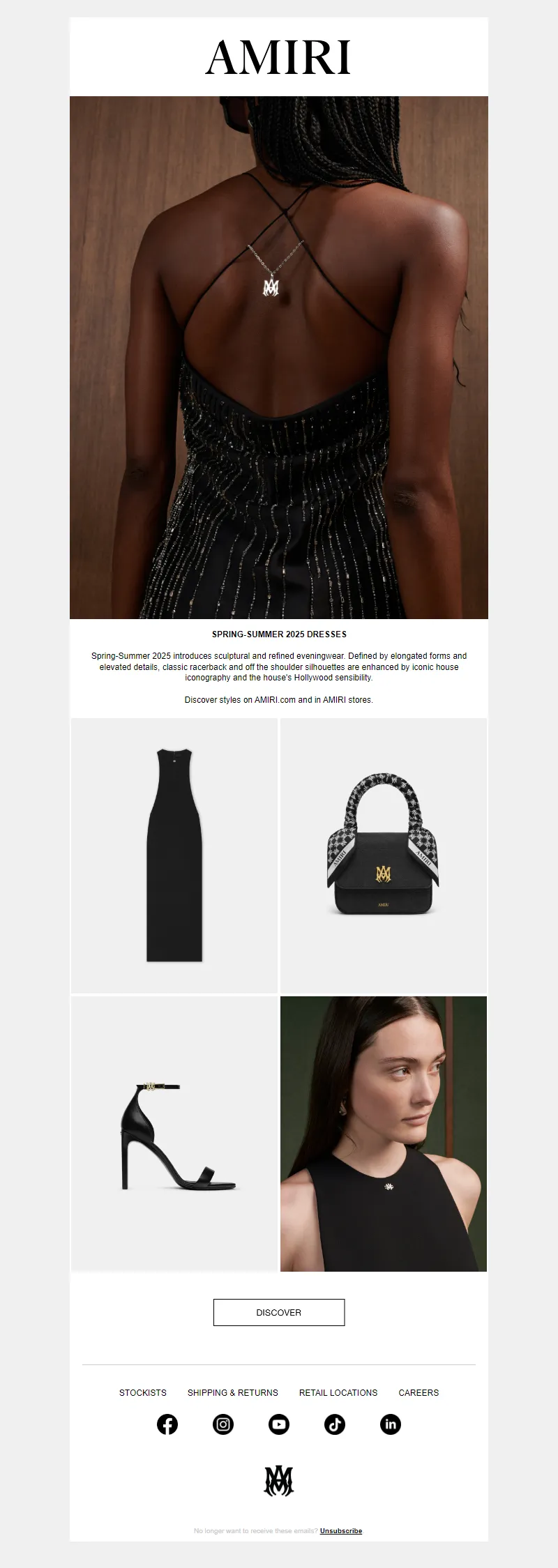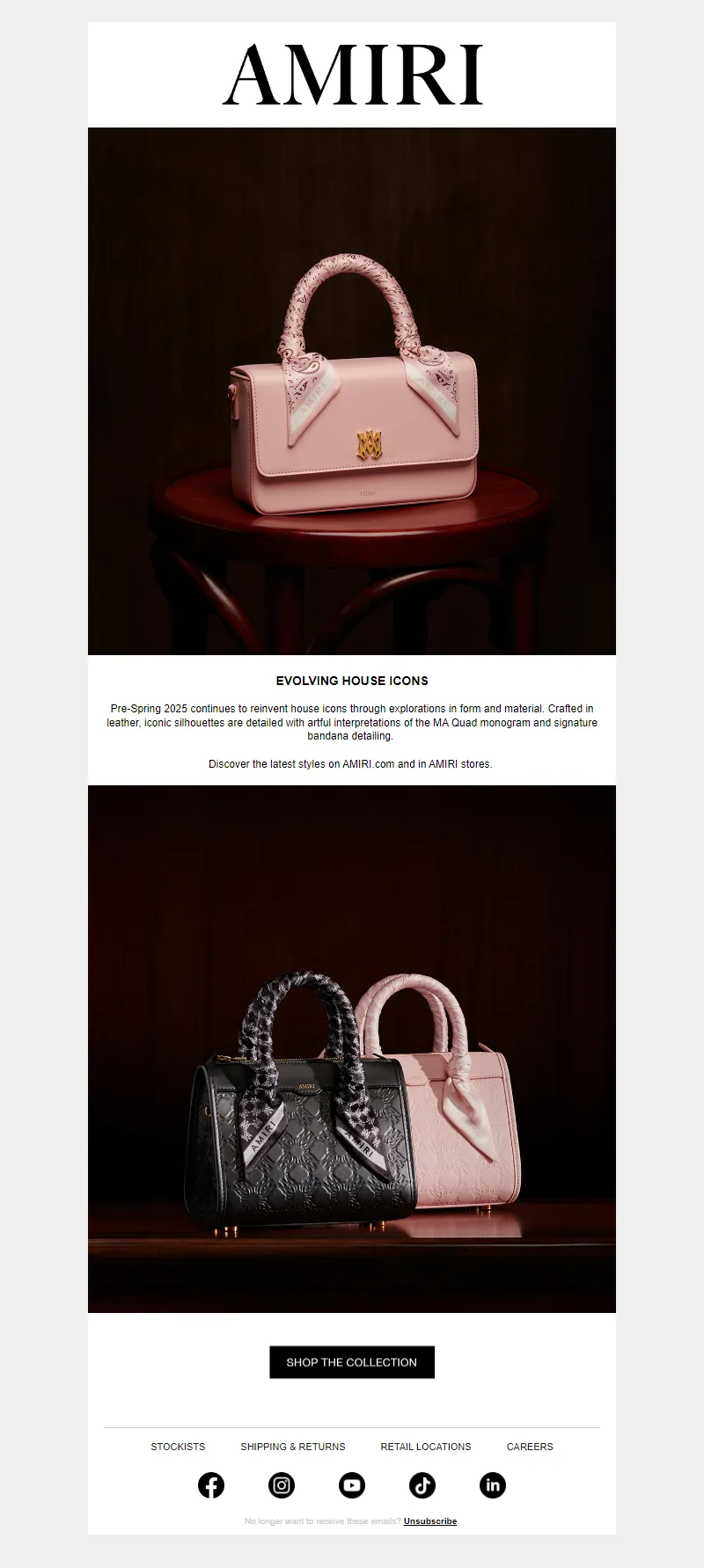 Explore campaign email examples from AMIRI, including promotions, newsletters, and product announcements. Built as a reference library for studying real ecommerce email execution.