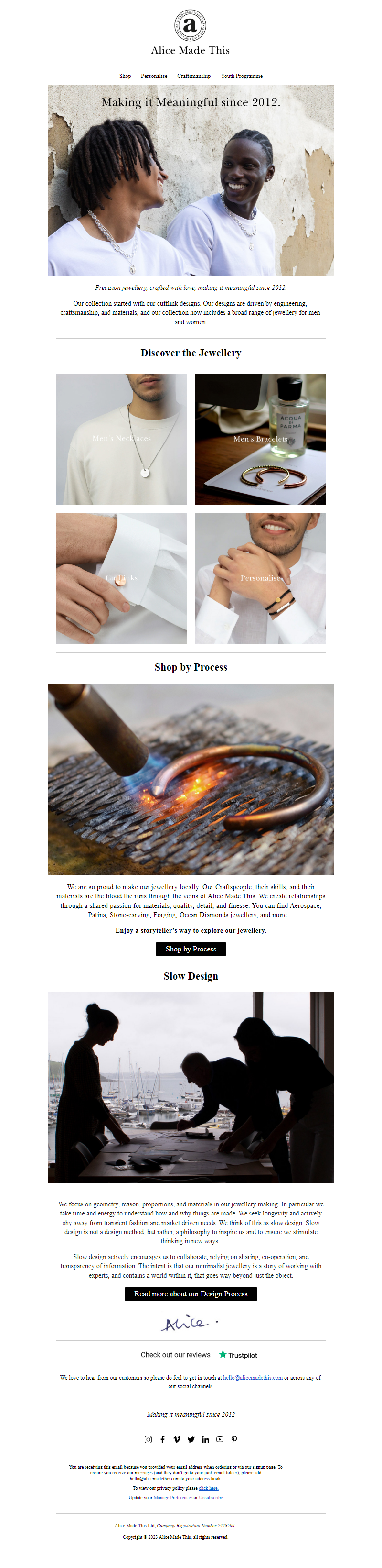 At Alice Made This we do everything to celebrate Craftsmanship. It is a core value and something that is a way of life. We have juxtaposed our passion for raw materials, age-old traditions, and honedskills, with the future of engineering and mixing art and science. Precision in nature is another passion of ours. There is so much innovation in our natural world and this is something we continually explore through its past evolution, its present wonder, and its future potential. We pair exploration in geo-technology, biomimicry, or the ability to protect and preserve through natural means, with the experimentation of materials and techniques. We work closely with craftsman and engineers to tell beautiful stories through our jewellery. You can read more about our Philosophy on our Journal. See more