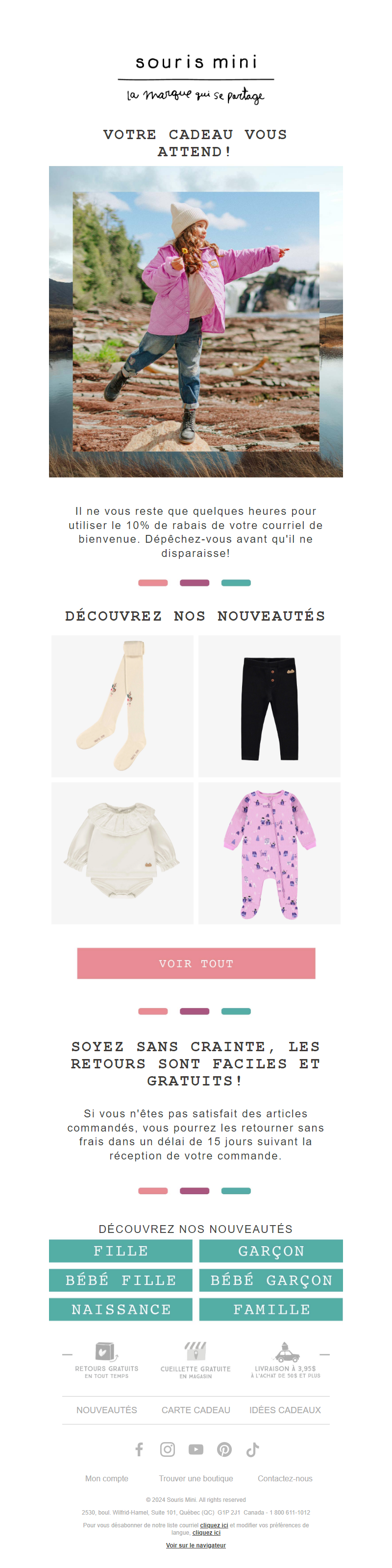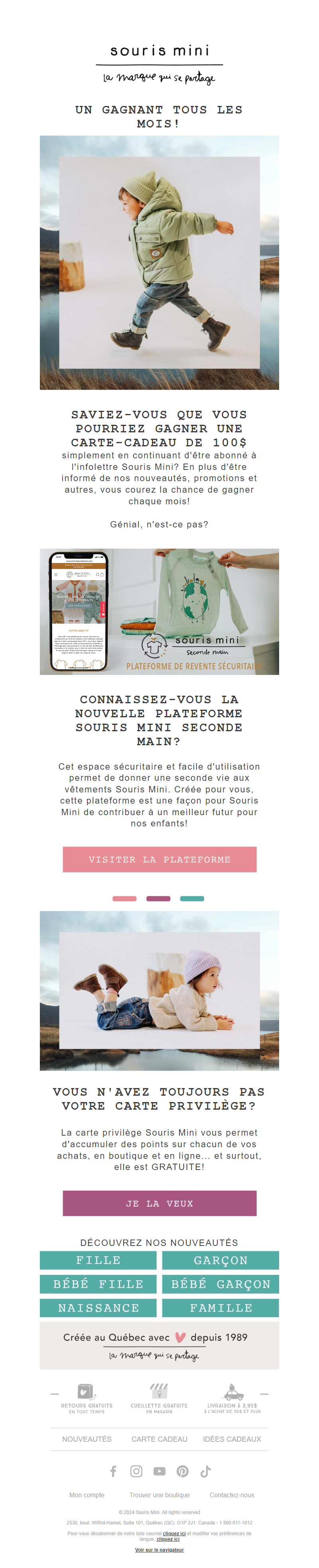 A world apart - the Souris Mini brand constitutes a playful, colourful and full of fantasy universe - for fancy-free, easy-going children who stand out without even trying and enjoy being stylish along with laughing, dreaming and expressing themselves! - for unconventional and laid-back parents who place their child's freedom and aspirations first and who want them to look elegant and fashionable, but not too stuffy. The collections are original, creative and quirky as well as ultra comfortable and durable. Every season sees hundreds of exclusive new designs for boys and girls - from tots (newborn) to ten-year-olds - for every memorable event of the day or year. Trendy outfits and accessories, fun pyjamas, multicoloured swimwear, soft underwear, elegant formal wear, snuggly layettes… The brand's Canadian roots show through, not only in the great freedom of expression and style displayed throughout all of our collections, but also through a line dedicated to mountains (slip, clothing, accessories), which features very technical details and highlights from the creative spirit of the brand. See more