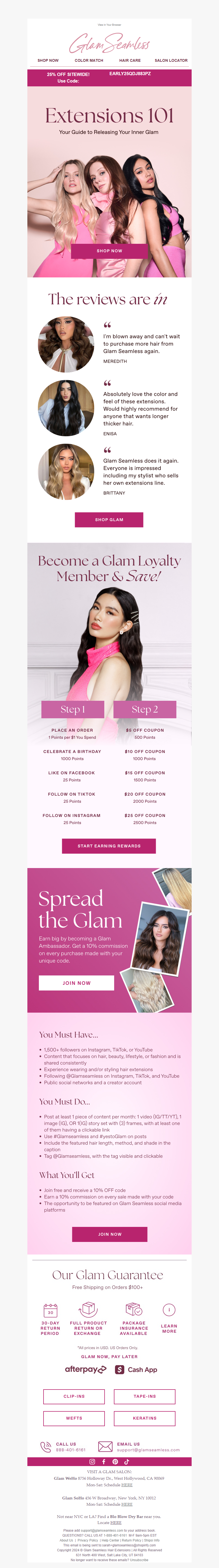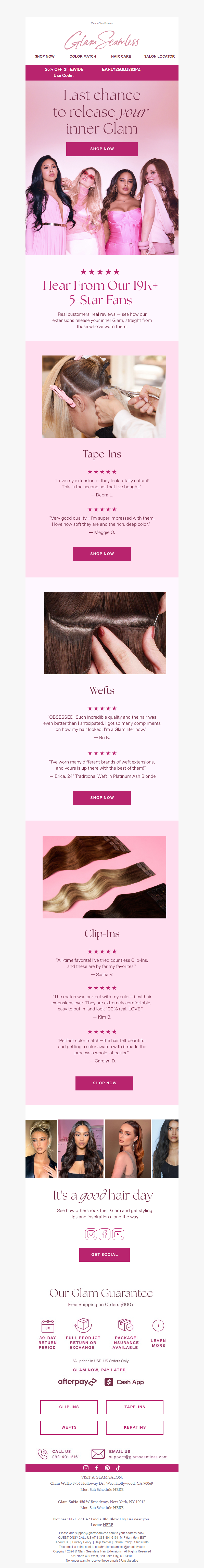 Glam Seamless is an eCommerce retailer that fully disrupted the hair industry in 2012 when it was founded by a passionate entrepreneur with $1,000 and a serious love for hair extensions. Now, it's a powerhouse company, consistently generating over eight figures yearly in revenue with a track record of growing sales 100% year over year. Traditionally, professional quality hair extensions were only sold through distributors, and stylists could only receive extension training in salons. Glam Seamless completely revolutionized the game by making premium hair extensions available to the public and providing stylists with education and business resources online. Glam Seamless now offers eight hair extension collections at affordable prices, a robust online education program for hairstylists, and a rapidly expanding community of devoted customers who confidently rock Glam Seamless extensions on a daily basis. With the unbeatable hair quality, Glam Seamless is the top choice for celebrity hairstylists and salon professionals worldwide. At the center of Glam Seamless is a mission to empower women. Whether it's customers, stylists, or employees, every decision at Glam Seamless is made with the goal to make women feel confident, successful, and glamorous. Glam Seamless also cares about the future generation of women, with a specialized focus on young girls. Glam Seamless donates 5% of all net profits to the non-profit organization, Glam Girls, Inc., which focuses on building self confidence during the most crucial developmental stages of life. Glam Girls, Inc. teaches young girls that although makeup and hair extensions are a fabulous way to express themselves, they are not the defining core values of a woman. As Glam Seamless continues to expand at a record rate, it will continue to stay true to its mission of empowering women while selling high quality hair to inspire confidence. See more