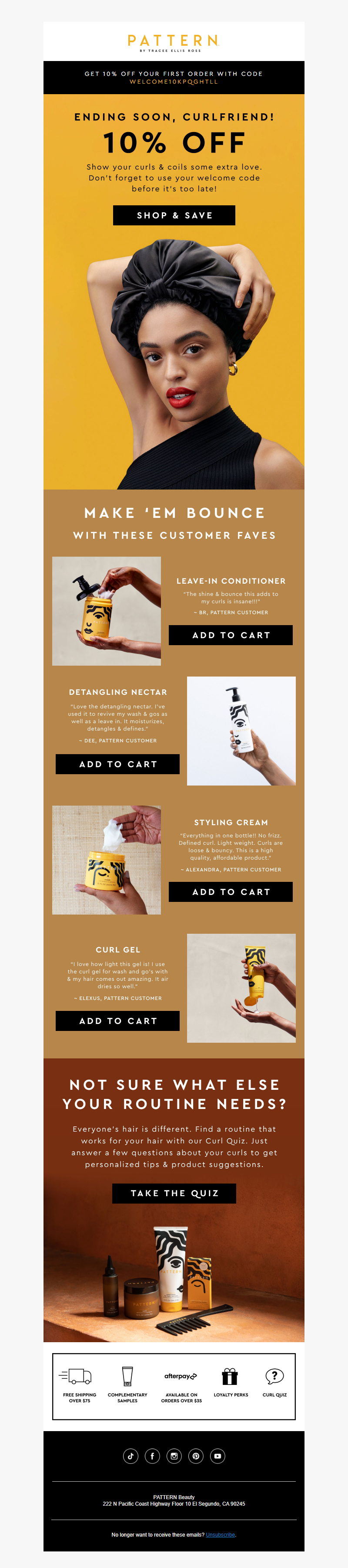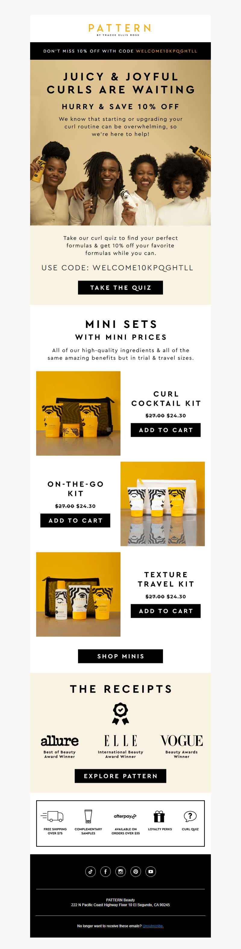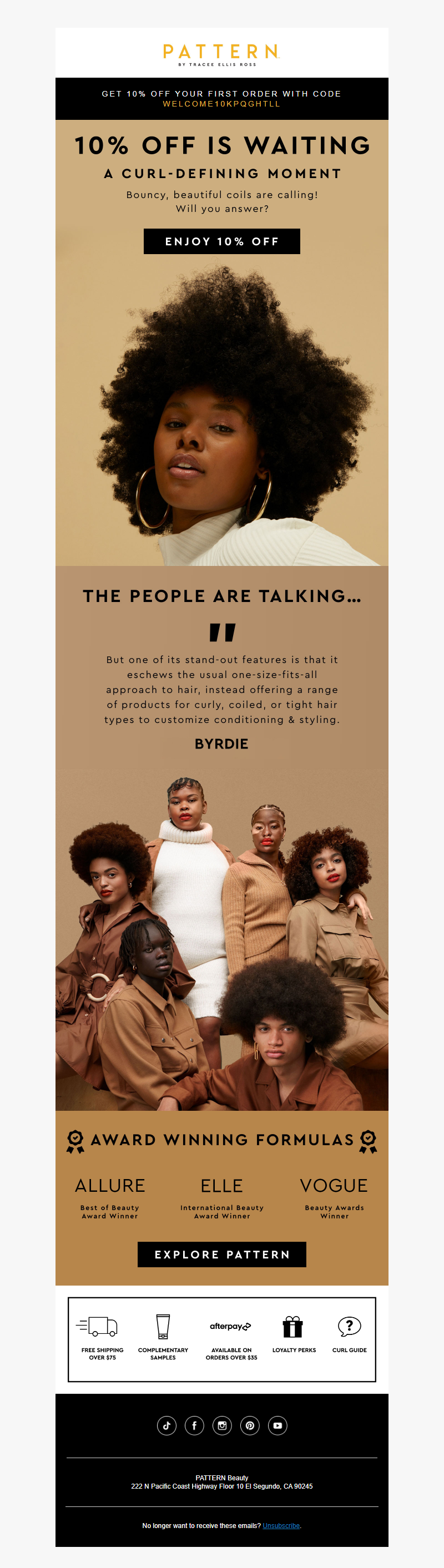Pattern Beauty, founded by Tracee Ellis Ross, is a haircare line designed to exceed the beauty needs of the curly, coily, and tight-textured masses. We are grounded in and centered around the celebration of Black beauty and creating a space for empowering and loving authentic beauty. Available at retailers including Ulta Beauty, Sephora (US + CAN), Macys, Boots and Ulta Beauty at Target, PATTERN is not only disrupting and redefining prestige hair care, we are doing so with innovative formulas and unrivaled content. PATTERN offers products in the wash, style, treat and heat categories, having won numerous awards from Allure, Ebony, ESSENCE, Marie Claire, and New Beauty. See more