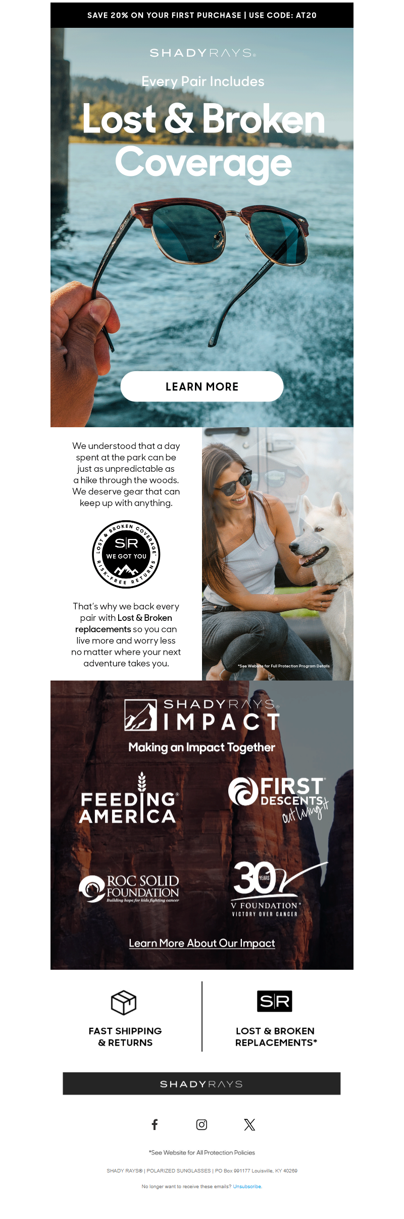 Shady Rays is one of the largest and fastest growing mid-priced lifestyle eyewear brands in the U.S. and the #1 fastest-growing company in the eyewear category (Inc. 5000 2020). Shady Rays is an inddependent, American-owned, direct-to-consumer sunglasses company with a mission to give back to individuals and organizations who make meaningful impacts in their communities. Alongside our customers, we're able to support these causes throughout the year. All shades are made with high-quality, polarized lenses in a variety of sunglass frame styles that come with Shady Rays' Limited Lifetime Craftsmanship Warranty and Lost & Broken Protection Program. Shady Rays also sells high-quality lifestyle gear including Snow Goggles, UV Shirts, Prescription glasses, Blue Light Glasses, and more. To learn more about Shady Rays, visit ShadyRays.com, one of our highly-curated retail stores in Lexington (KY) and Denver (CO), or follow us on Meta, TikTok and Twitter @shadyrays. See more