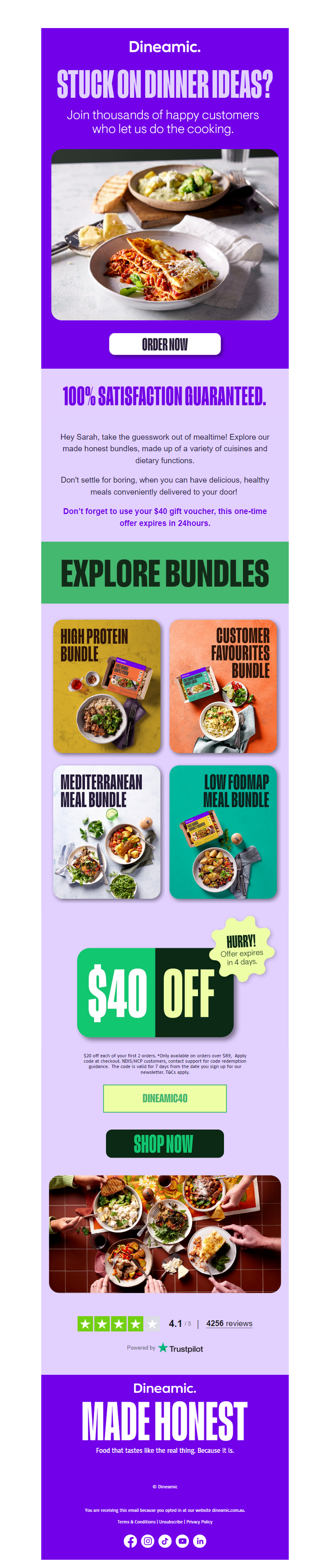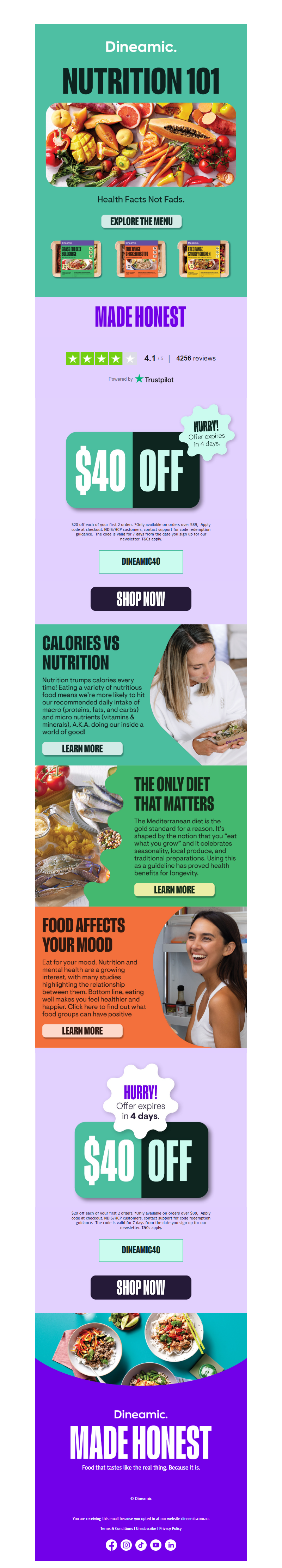 Dineamic makes the best ready made meals. It's an easy thing to say but a hard thing to do right. We make healthy eating something you want to do—and keep doing—meal after meal, day after day. No mes mess or stress, just delicious, healthy prepared food. Feel good—inside and out—knowing that we've taken care of everything, so you can focus on what's most important to you. Good ingredients, great flavours. Our chefs prepare fresh, flavourful, ready meals, made with ethically sourced ingredients from local Aussie farmers. We use the highest quality free-range chicken and pork, grass-fed beef and lamb, or sustainably fished seafood. There's no added nasties or numbers, just like your home cooking. Nutrition facts, not fads. Nutrition's in our DNA. All of our ready made meals are dietitian and nutritionist approved. We care about our premade meals and the nutritional information you have access to. We want you to feel healthier and happier through nutritious meals and education. Easy to shop, then heat and eat. We want healthy eating to be easy. Buy online for delivery to your door, from our stores, or stockists. Meal delivery for one or two, no minimums, flexible bundles, and no lock-in subscriptions, you can get what you want when you want it. Fresh food for everyone. From footy teams to families, Dineamic caters to a range of dietary preferences and lifestyles. Low FODMAP, no added dairy or gluten, high protein, low calorie, or total wellbeing—there's a Dineamic meal to suit you. We're a registered NDIS provider and work with Home Care Package providers too. Convenience today for a better tomorrow. Keeping Australia beautiful is at the forefront of our minds. We operate out of a 100% carbon neutral kitchen, prioritise low food miles, minimise waste by cooking to order, and use Halo Packs made from recycled cardboard, reducing our plastic consumption by 92%! Shop healthy ready made meals with Dineamic today. See more