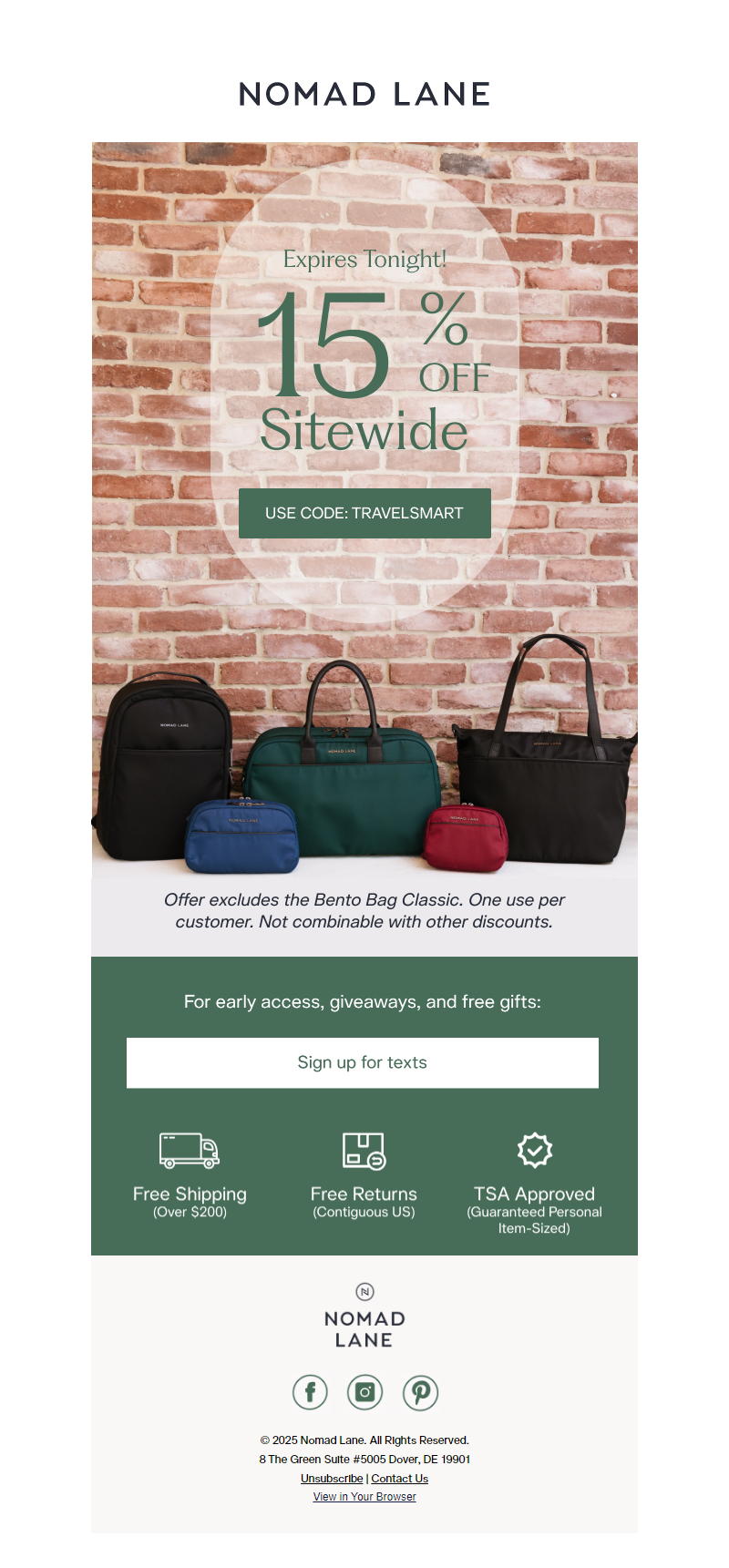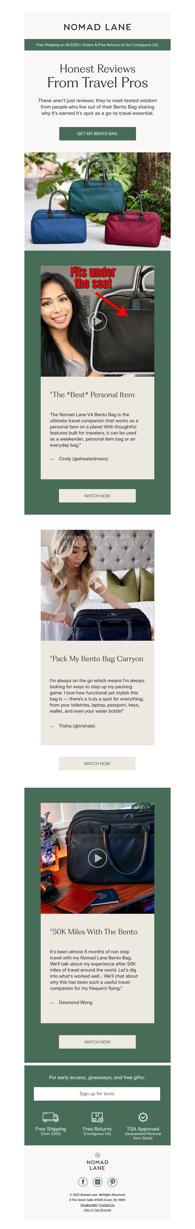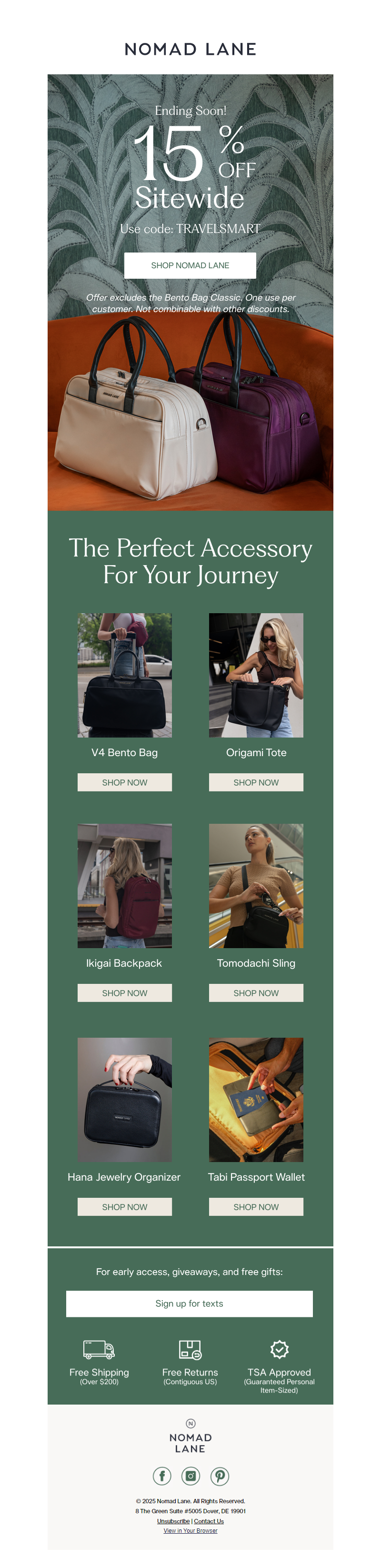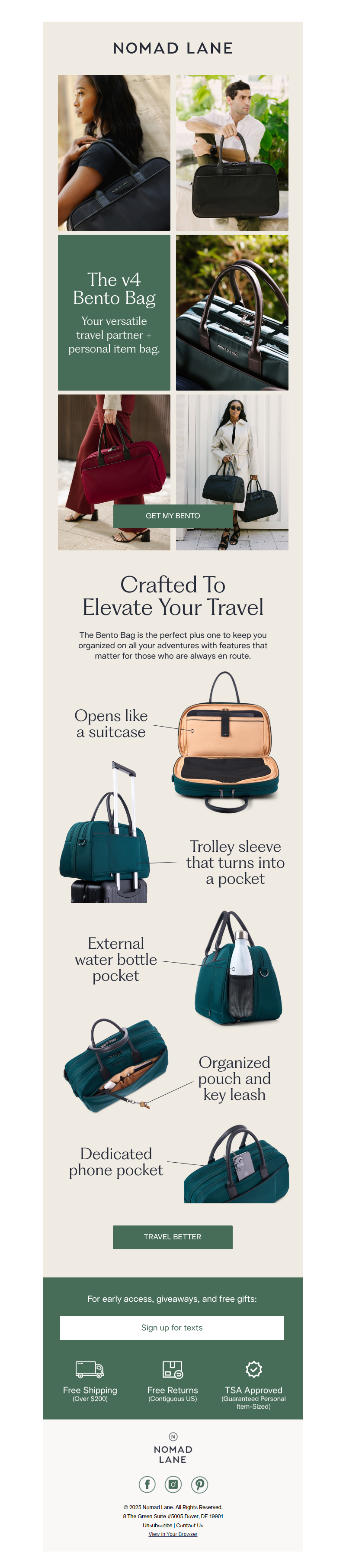 Nomad Lane is a brand of thoughtfully designed travel bags and accessories for the modern traveler. The company was founded in 2017 by Kish and Vanessa, a husband and wife team. We develop our products based around the experiences of our community of travelers. Our first travel bag, the Bento Bag, raised over $2M in pre-orders. Nomad Lane has been featured in Forbes, Fast Company, Travel + Leisure and The NY Post . See more
