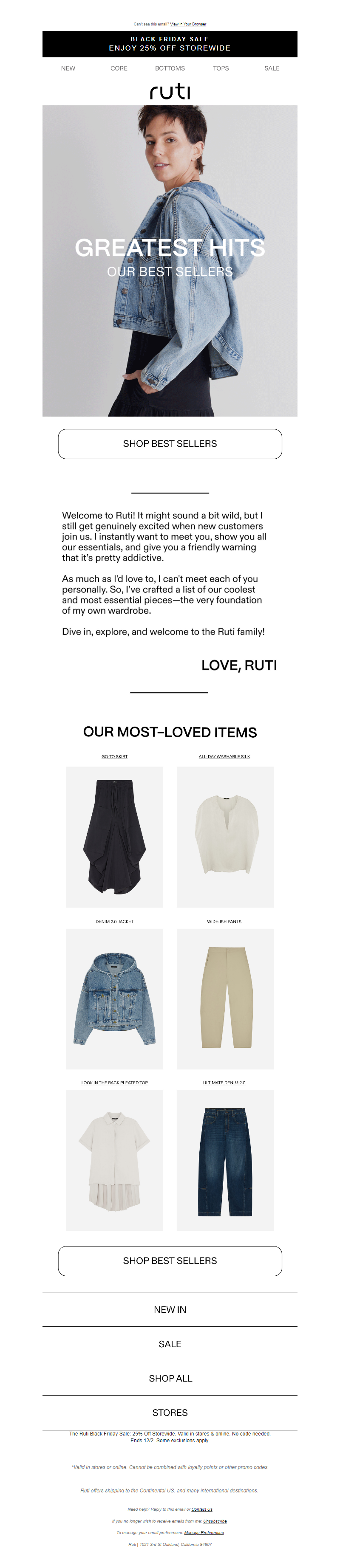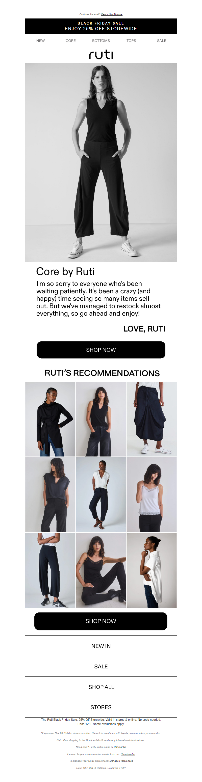 Ruti was founded in 2009 to change your relationship with your closet. We've always been told that beauty hurts - that we must give up comfort in the name of style and compromise sophistication for whatever is fashionable. That's where Ruti comes in. After years as a tech executive, Ruti Zisser took a leap of faith and struck out on her own to create a new kind of luxury brand. From that moment on, she devoted herself to creating the clothes she's been searching for all along, but was never able to find. "I have three rules for design: It must be COOL. You don't need to sacrifice the cool factor to achieve a look that is classic and sophisticated. Our clothes lend a smart and effortless touch to the woman on the go. It must be FLATTERING. Our clothes are designed to flatter a woman over the age of 35 without making her look like she's trying too hard. It must be PRACTICAL. 80% of my collection are clothes that I wear everyday. 20% of my collection is aspirational - it's for the woman I daydream of being. Love, Ruti" See more