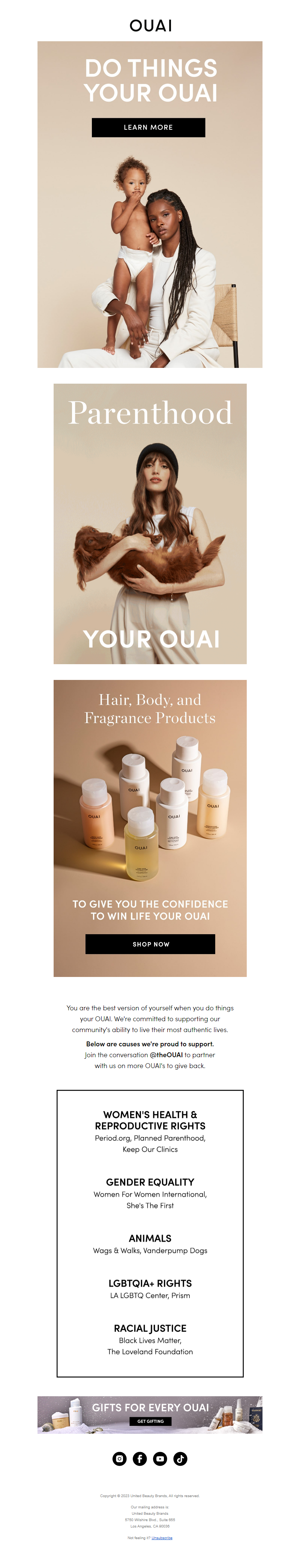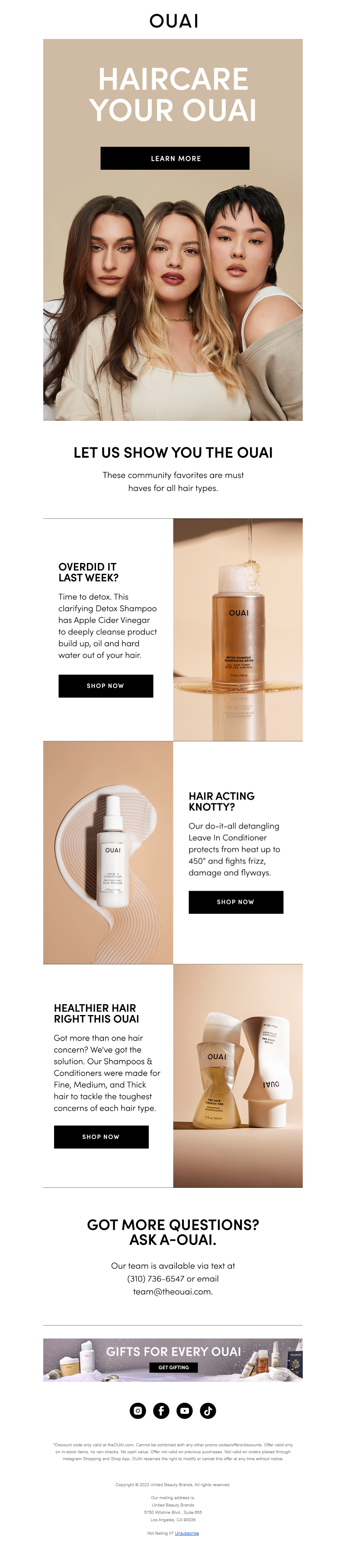 We believe that life is hard and looking good should be easy. We're giving you realistic goals that you can actually achieve—with quick how-to videos, so you're always ready for that selfie situation.n. A brand that looks dope enough to Instagram, but epic enough to actually get the job done? Yes OUAI. OUAI restores hair health from the outside and from within, through effective haircare products and proven nutritional supplements developed by an MD. Our shampoos and conditioners are sulfate-free and employ smart keratin to repair and improve hair strength. Even our styling products are designed to nourish hair and bring out its natural beauty. See more